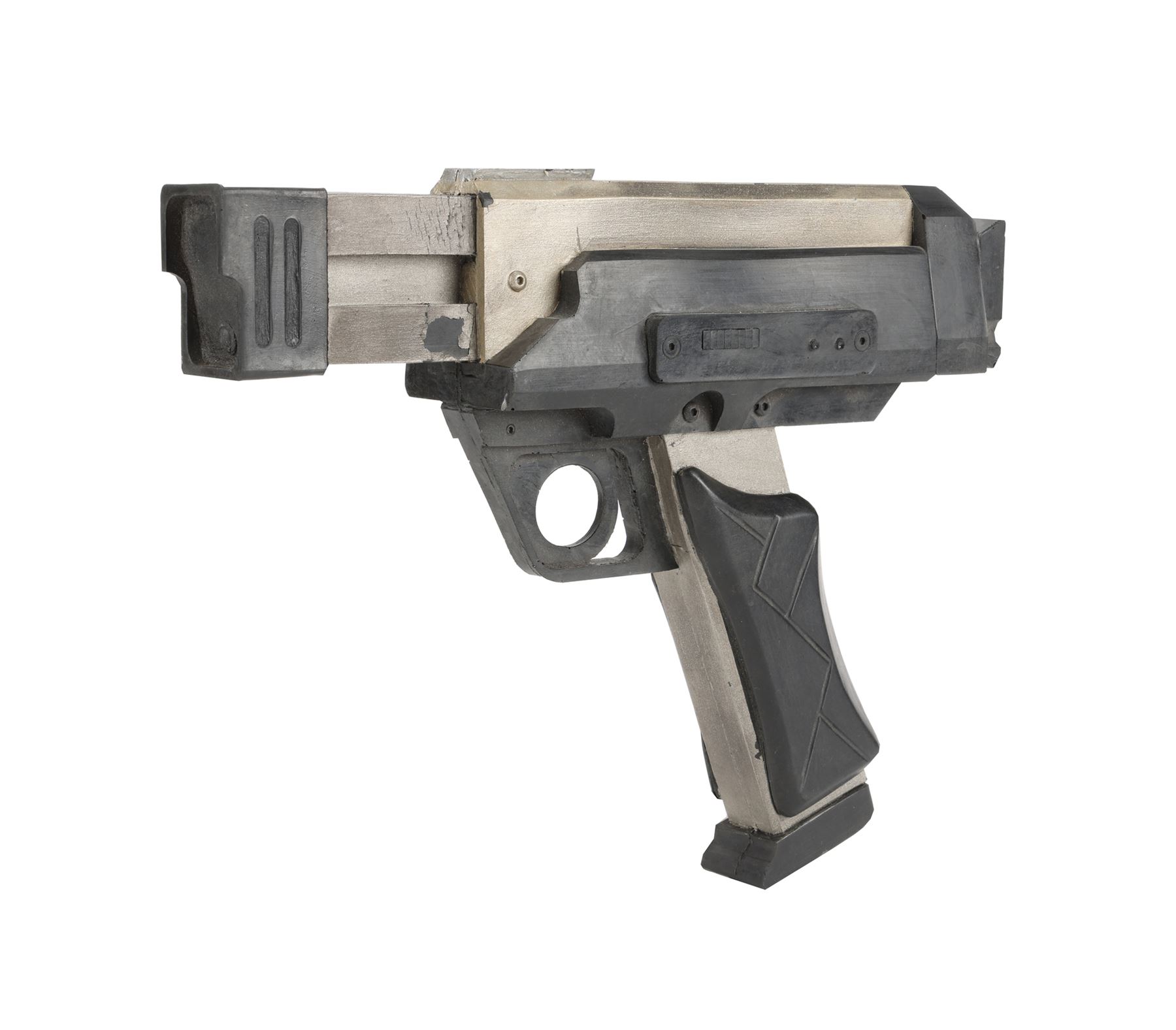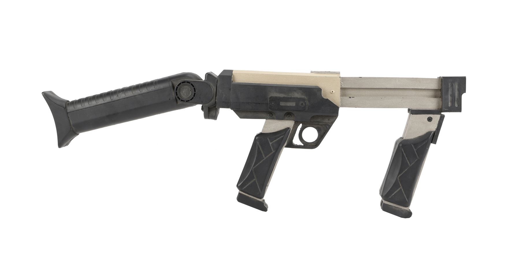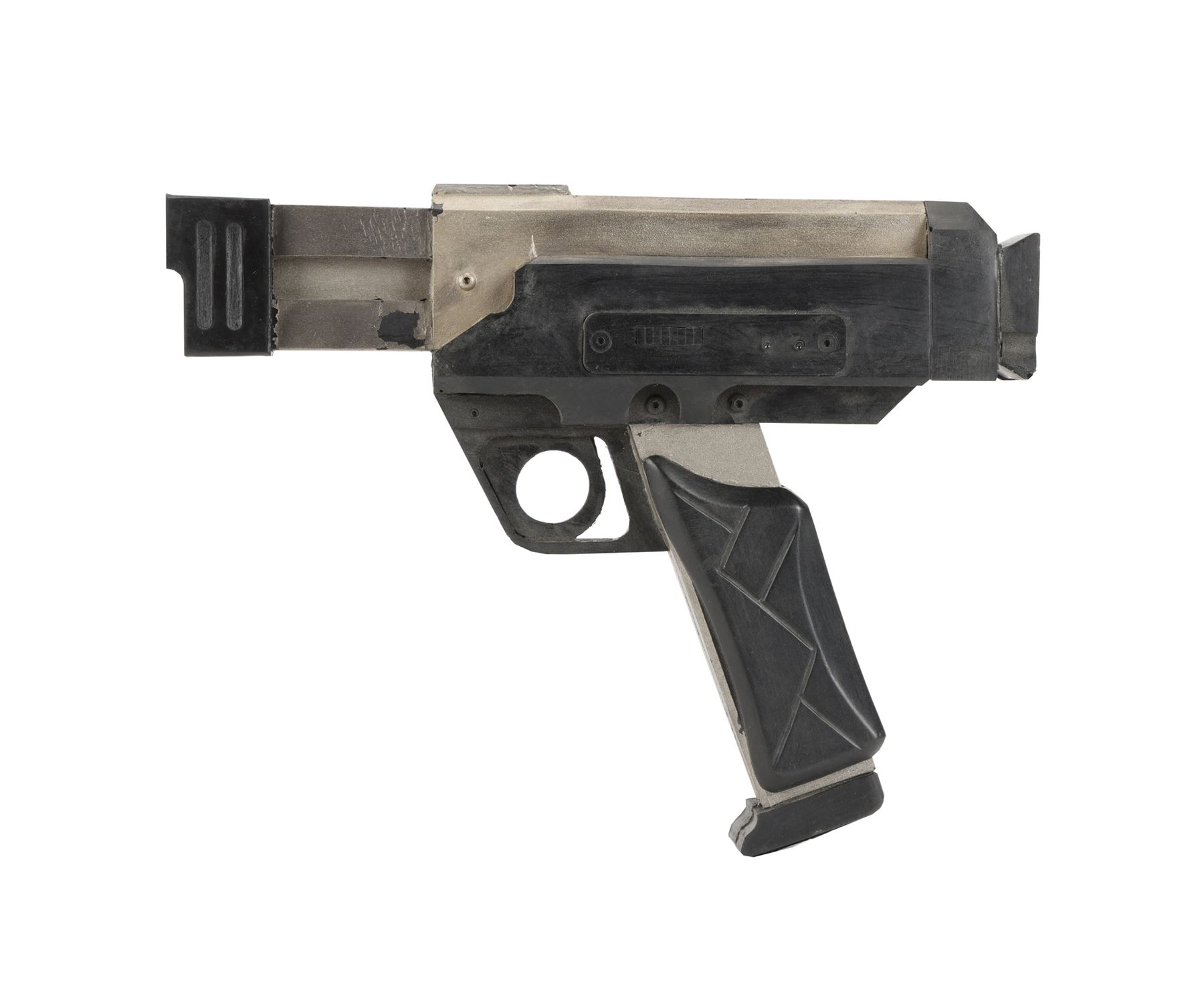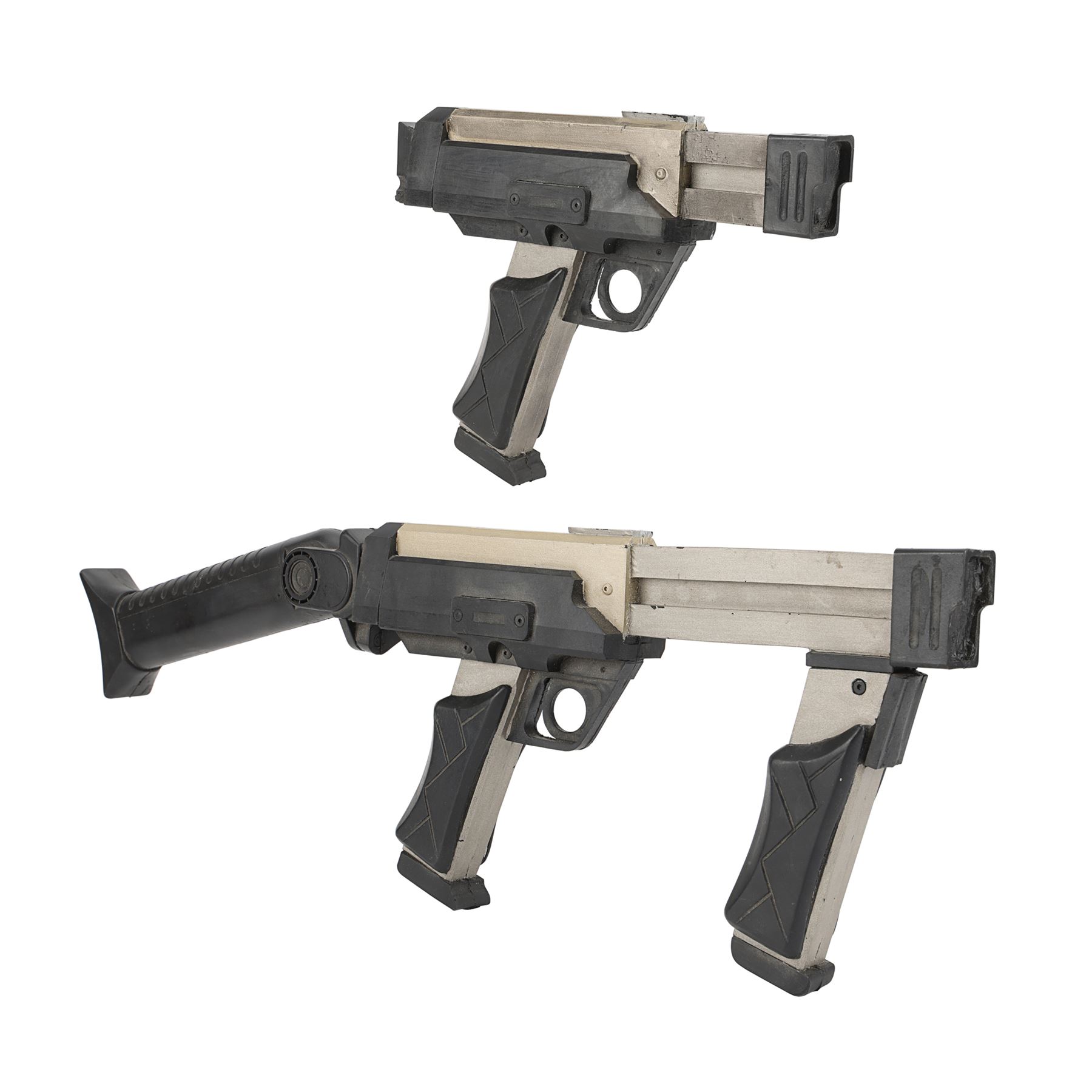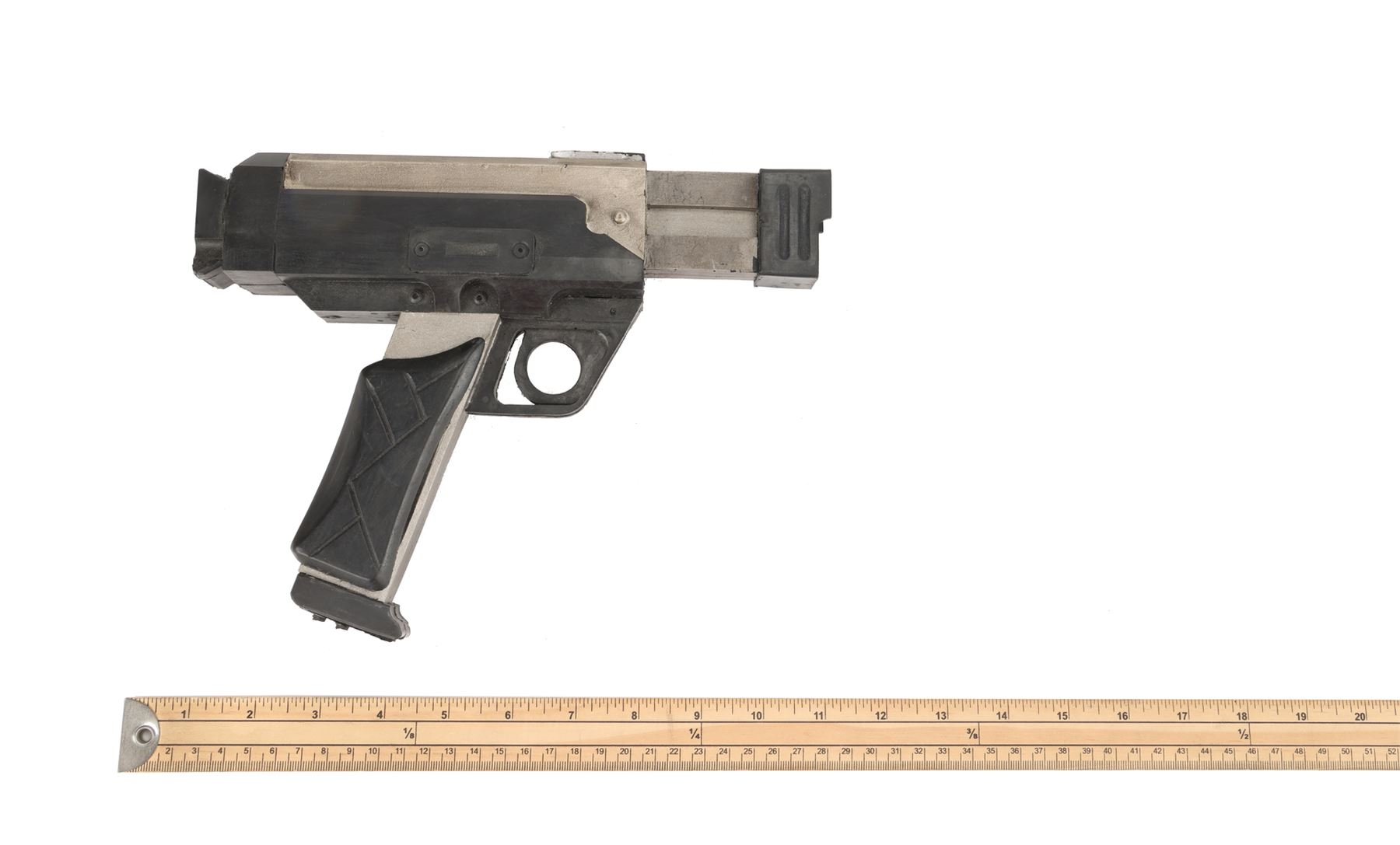 A handgun and rifle from Stephen Hopkins' sci-fi adventure Lost in Space. Various characters used handguns throughout the film and rifles can be seen in the weapon racks on the Jupiter II spacecraft. Both weapons are made of hard rubber and painted to look like metal. There is some minor paint wear, most notably on the handgun barrel. Dimensions (rifle): 57.5 cm x 5.5 cm x 20 cm (22 3/4" x 2 1/4" x 8")