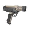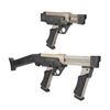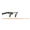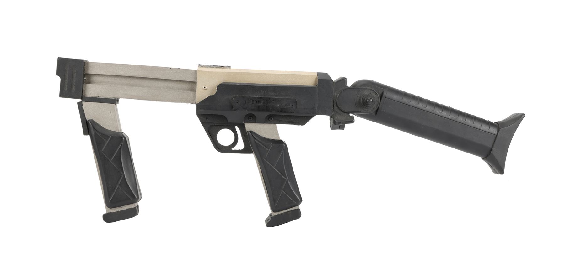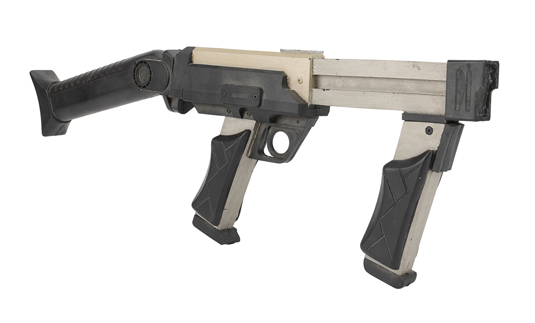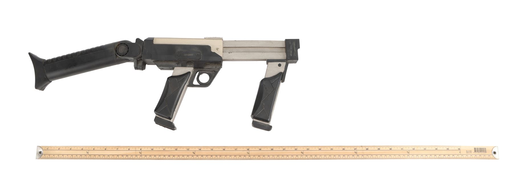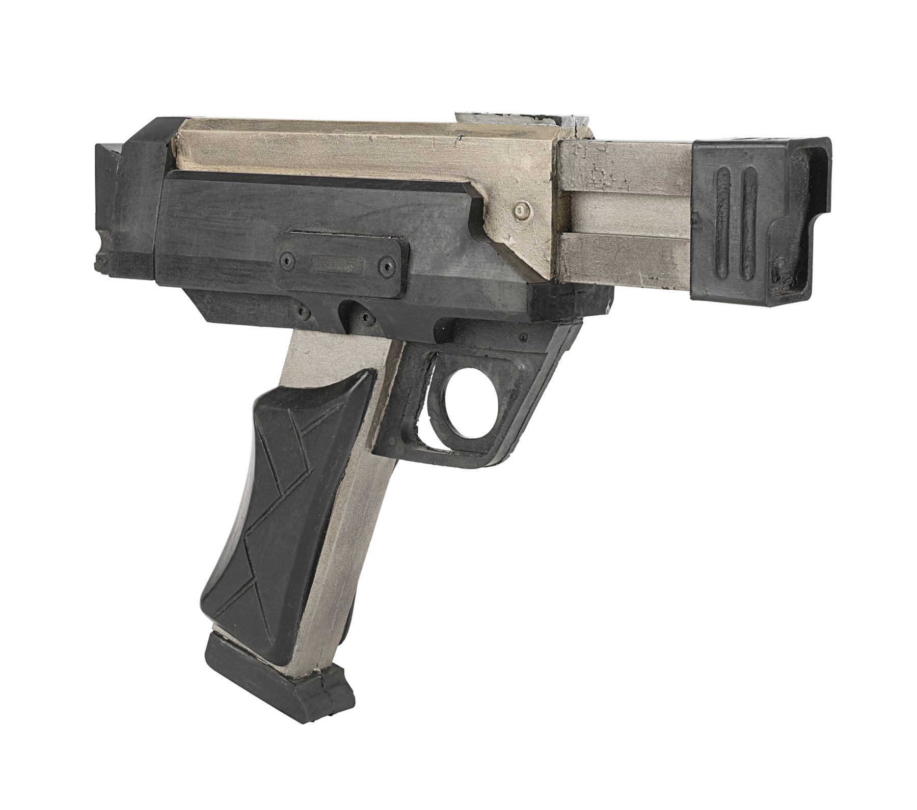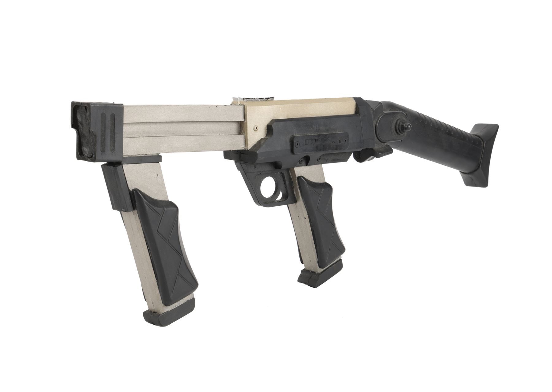 A handgun and rifle from Stephen Hopkins' sci-fi adventure Lost in Space. Various characters used handguns throughout the film and rifles can be seen in the weapon racks on the Jupiter II spacecraft. Both weapons are made of hard rubber and painted to look like metal. There is some minor paint wear, most notably on the handgun barrel. Dimensions (rifle): 57.5 cm x 5.5 cm x 20 cm (22 3/4" x 2 1/4" x 8")