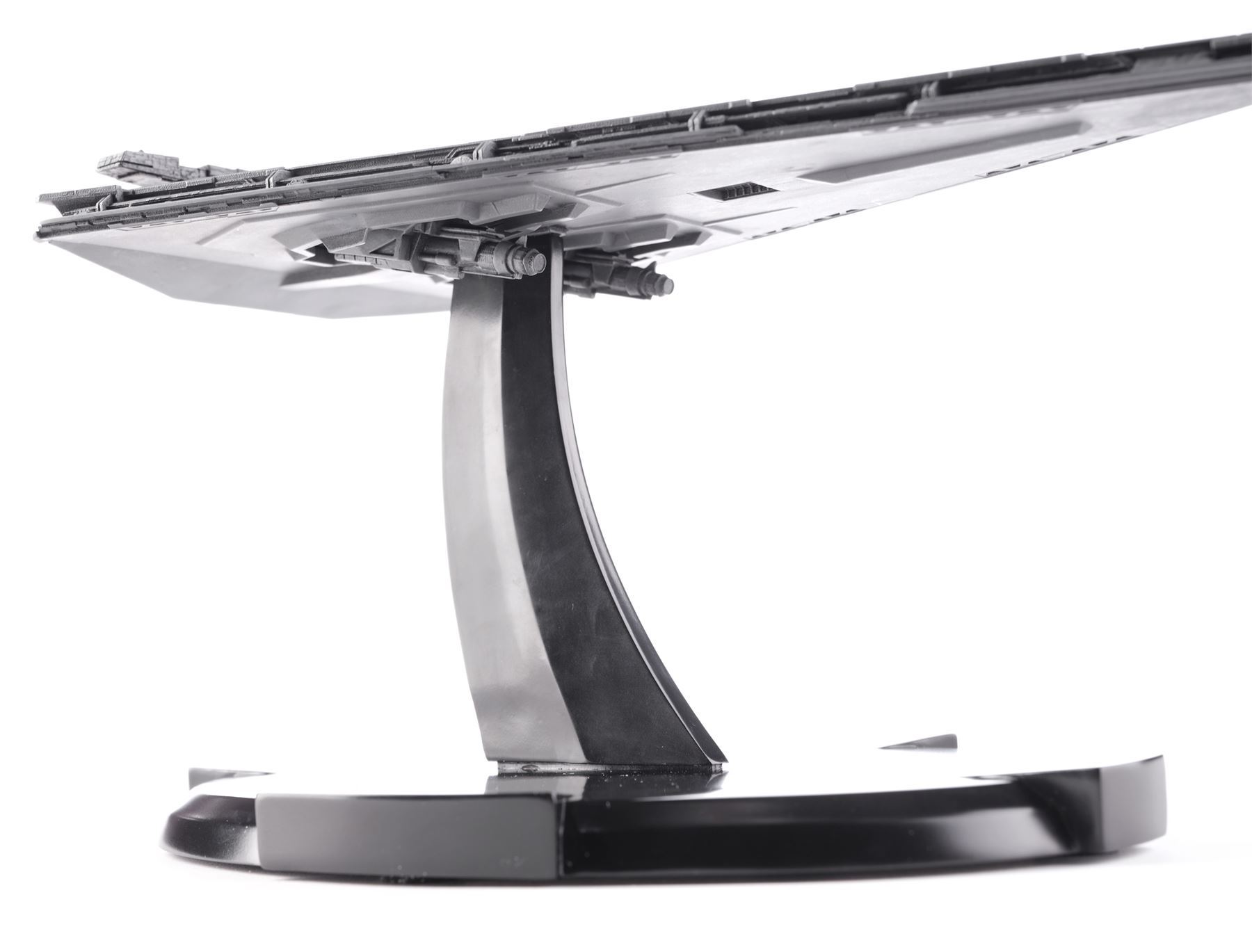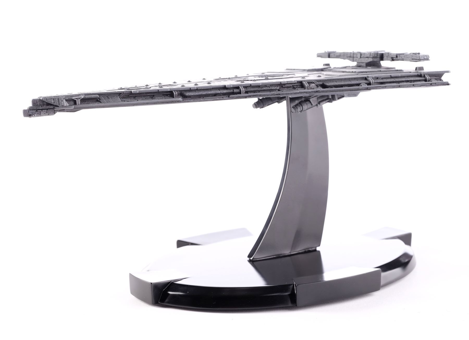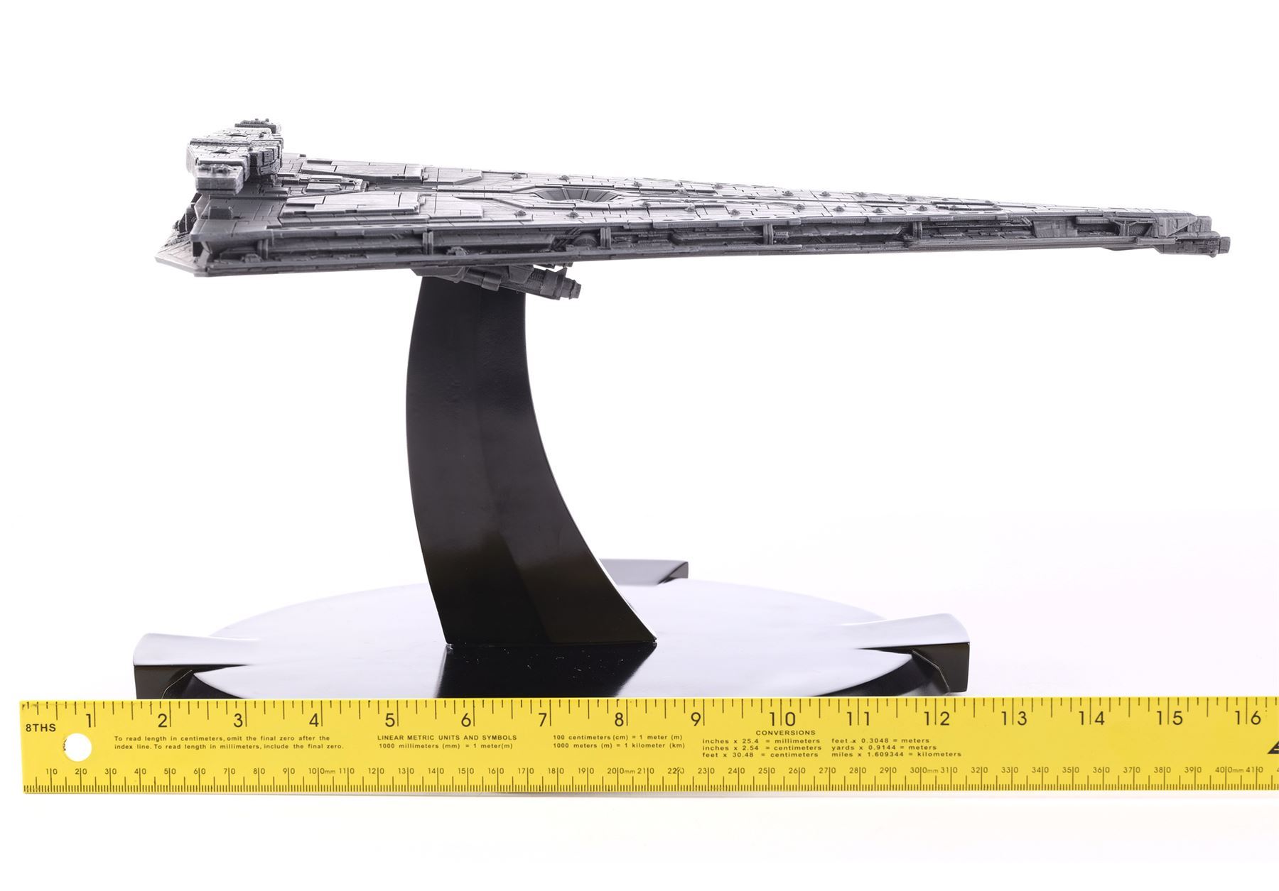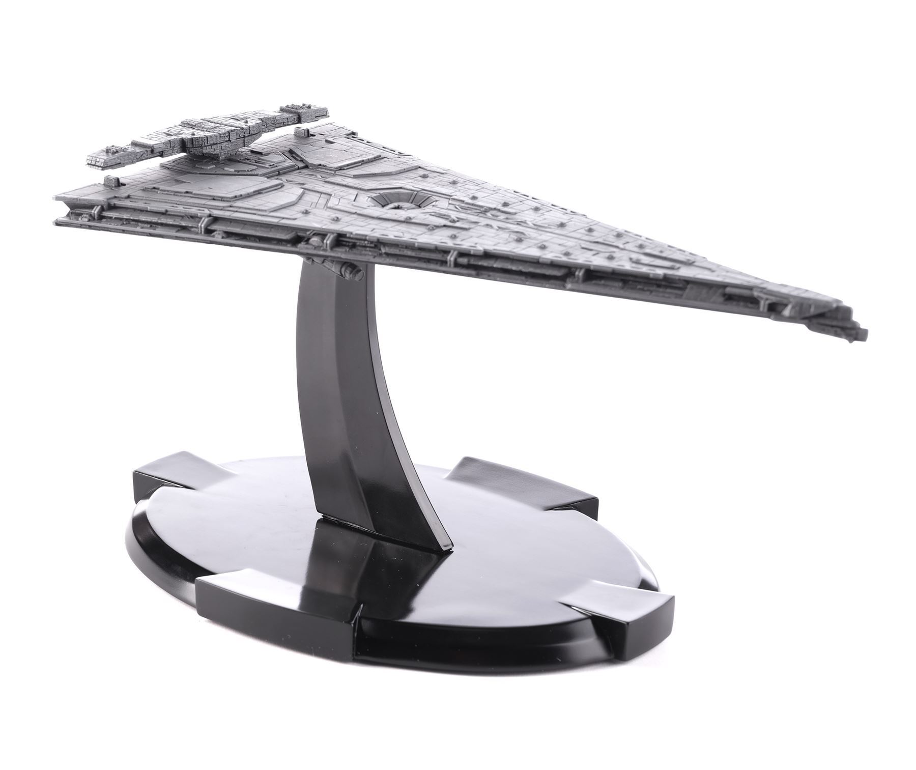 This lot includes a resin model painted gray with a weighted black resin display stand and armature; a stapled, 6-page "Star Destroyer 360° AR Experience Guide"; a printed model assembly instruction page; two AR instructional cards; and one paper mat with an outline for the model's base placement. The ephemera exhibits minor edge wear; the model exhibits minor scuffing from storage. Dimensions: 18" x 8.5" x 7.5" (45.75 cm x 21.75 cm x 19 cm)