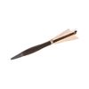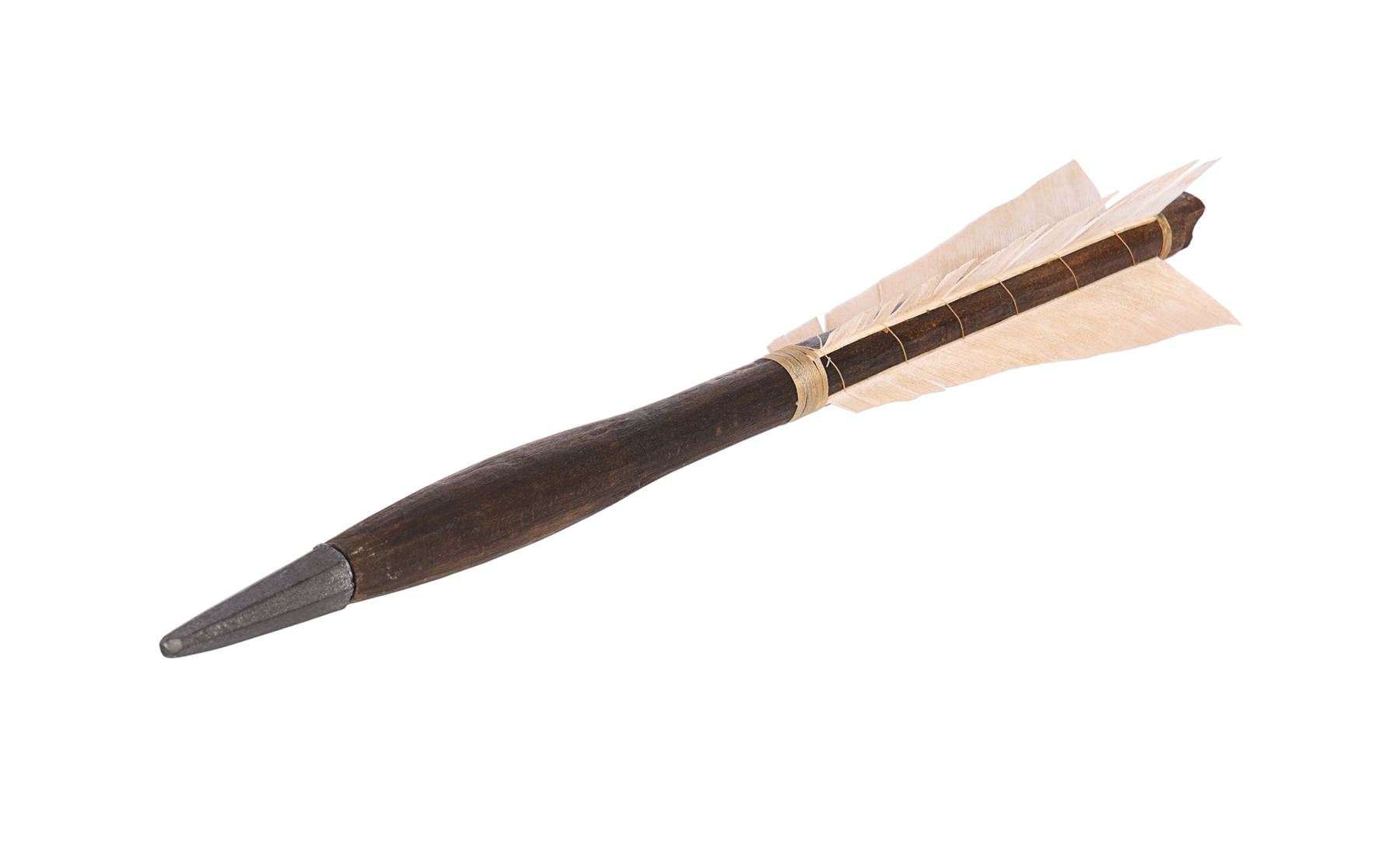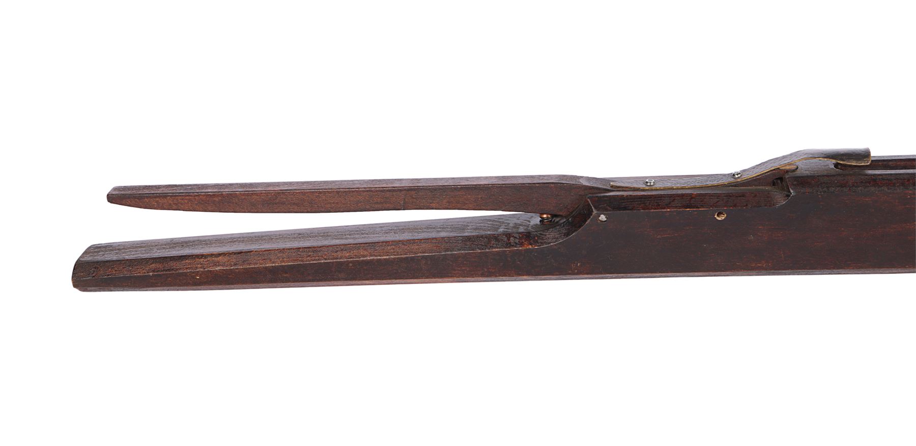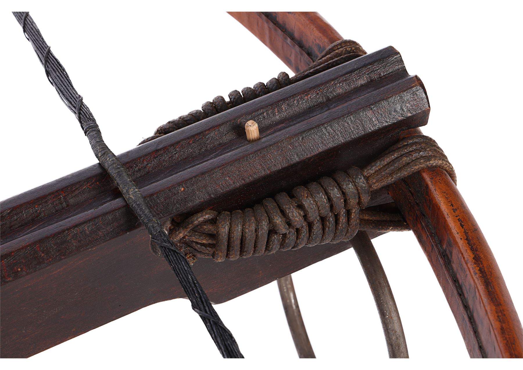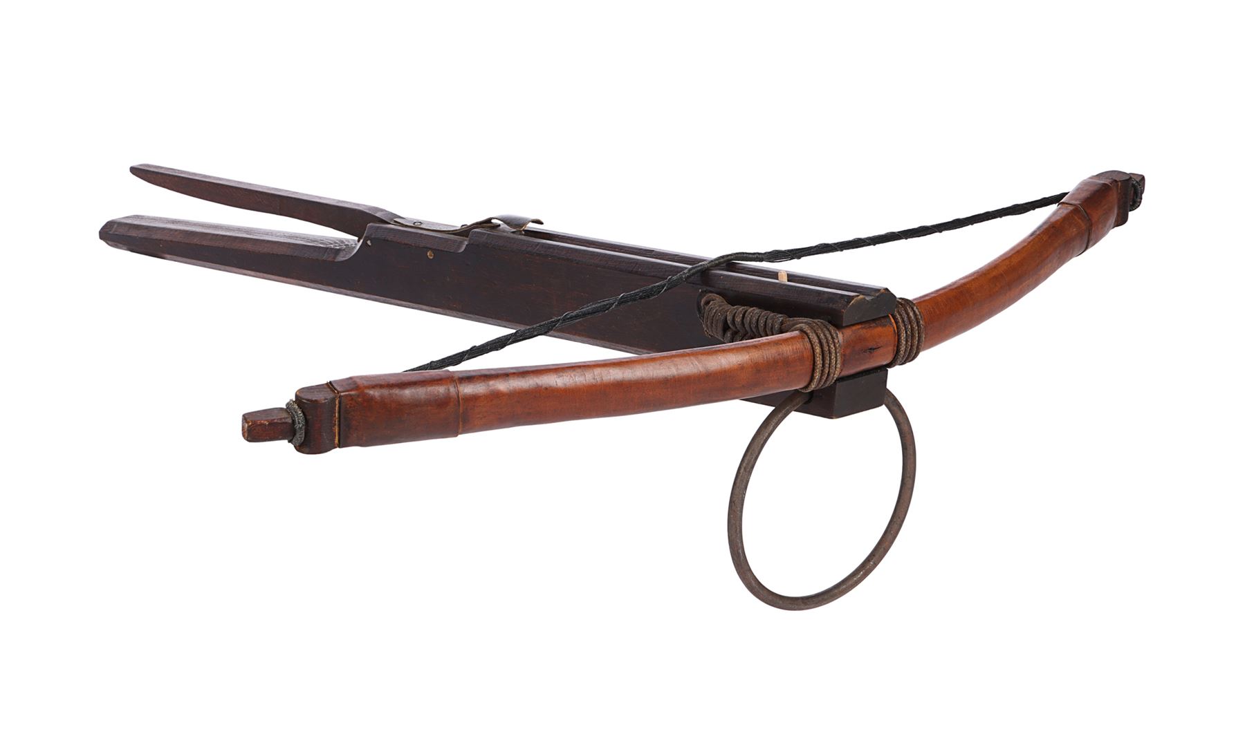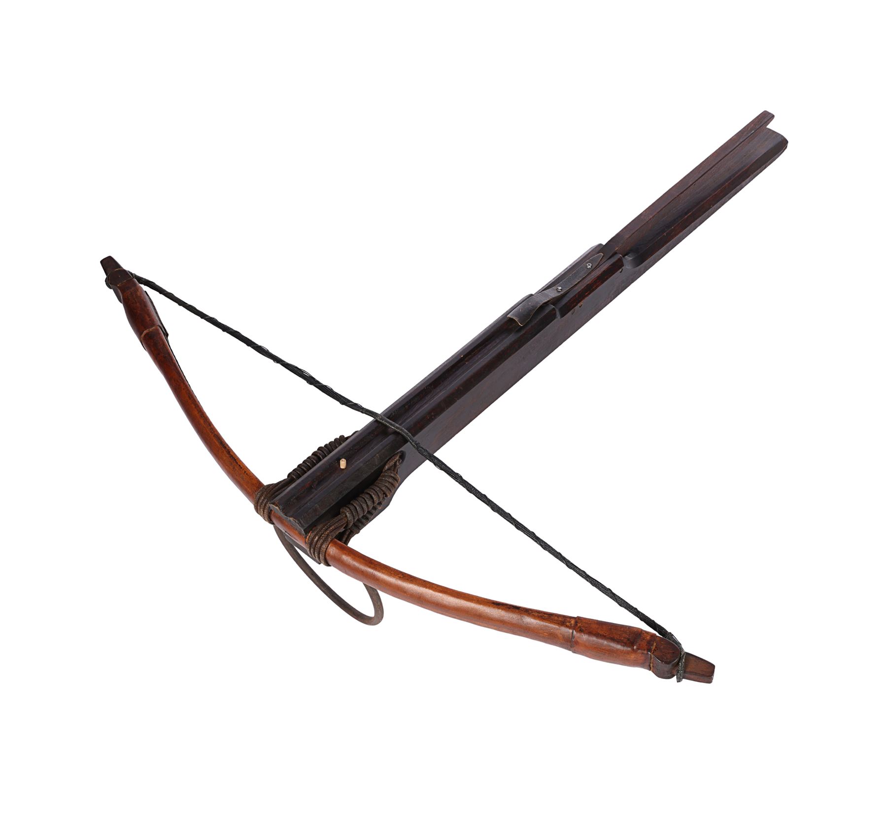 Queen Ingrith's (Michelle Pfieffer) screen-matched hero crossbow and bolt from Joachim Rønning's fantasy sequel Maleficent: Mistress of Evil. Queen Ingrith was presented with a table of weapons and picked up a crossbow. This matches the one she picked up by the markings and colouration on the leather-covered limbs. The wooden hero weapon features a practical firing mechanism with a wooden trigger at the back. A wooden dowel along the flight groove prevents firing a projectile. The bolt is made of wood, with a biscuit foam point and feather fletchings. Dimensions: 92 cm x 86 cm x 9 cm (36 1/4" x 33 3/4" x 3 1/2")
