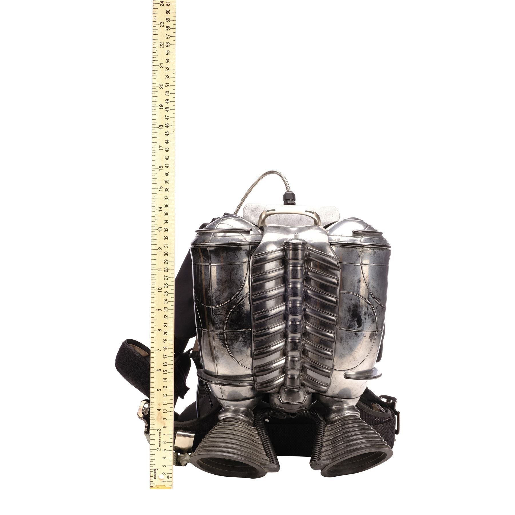 This lot consists of a nylon and canvas backpack with an attached resin jetpack. Featuring metal hardware, and rubber nozzles with LED light panels, the strap also has a light-up escape button. It features two hand-marked tape labels on the back for number "2" and "Abbie" in marker. This lot exhibits chipped rubber, scratches to the finish, and mild discoloration. Dimensions: 18" x 11" x 9" (45.75 cm x 28 cm x 22 cm)