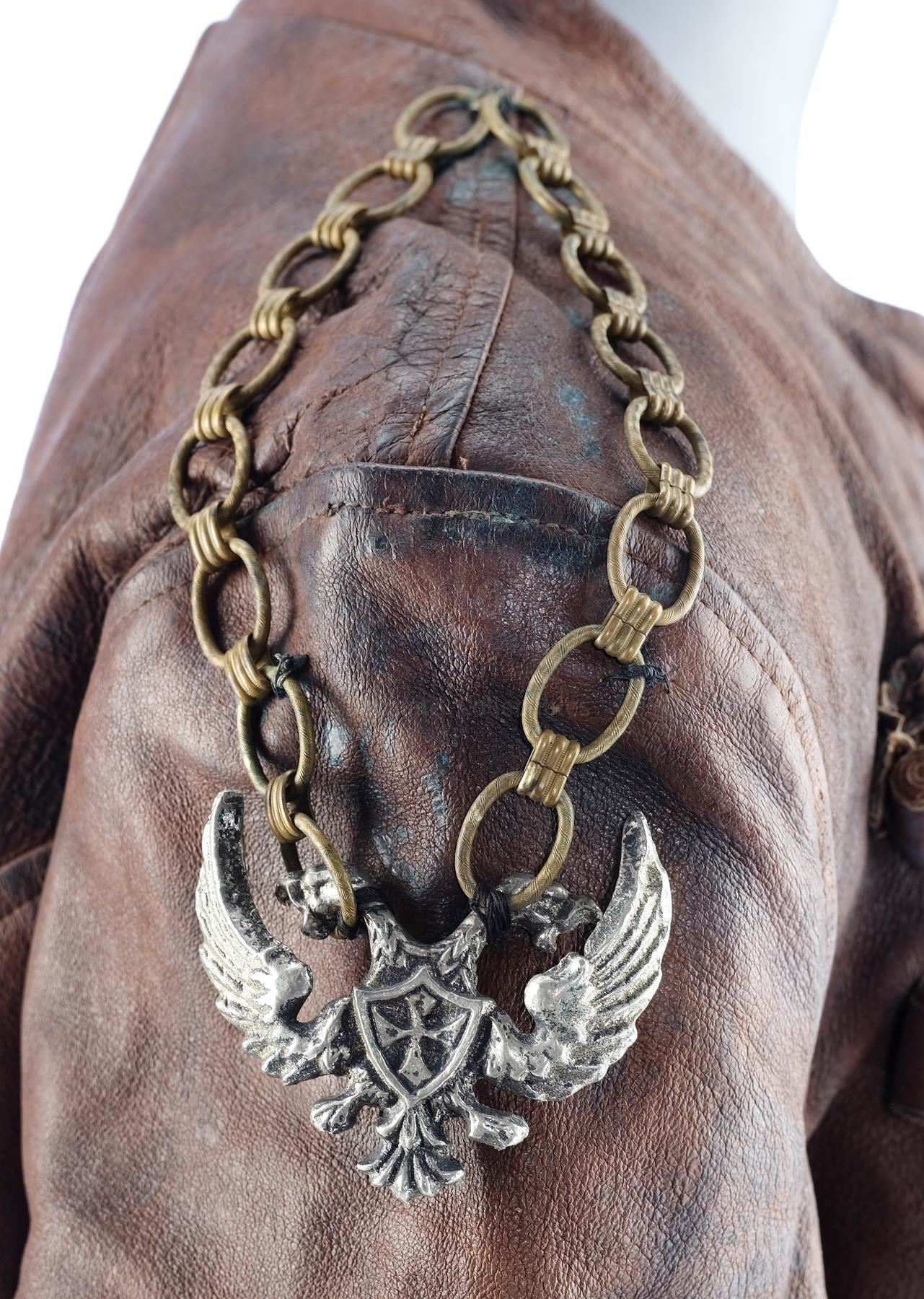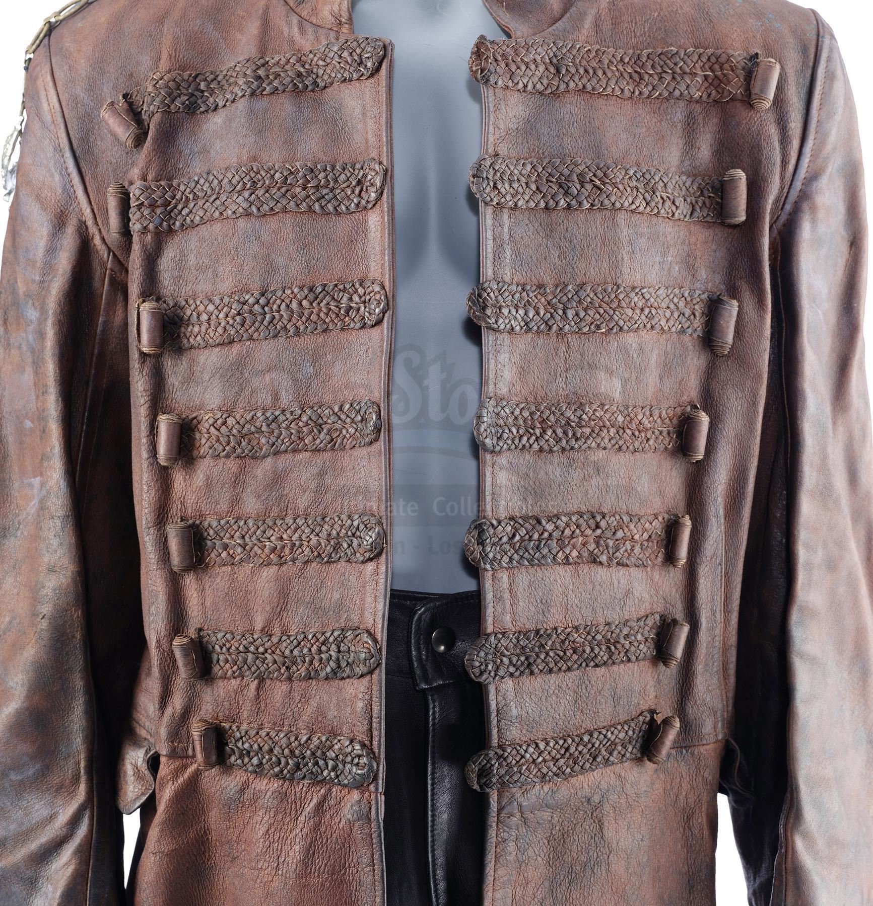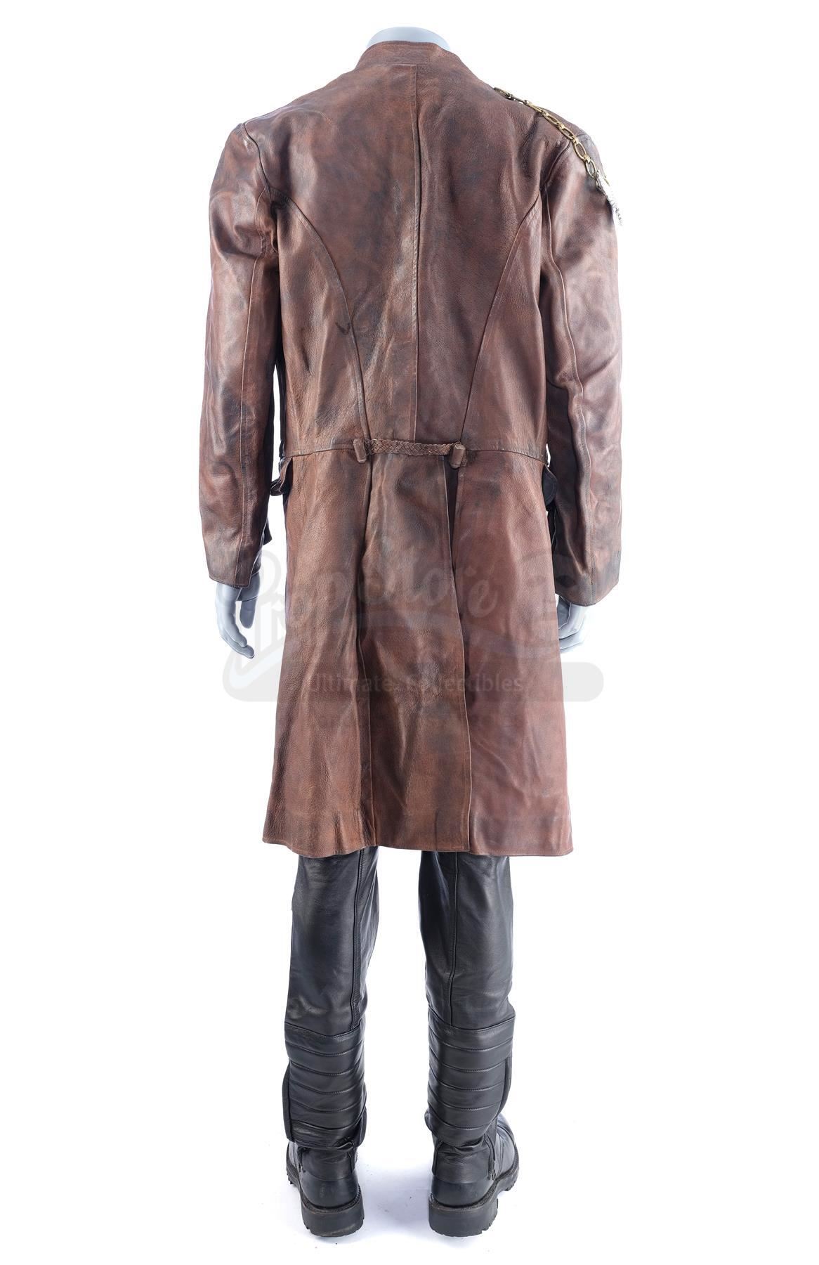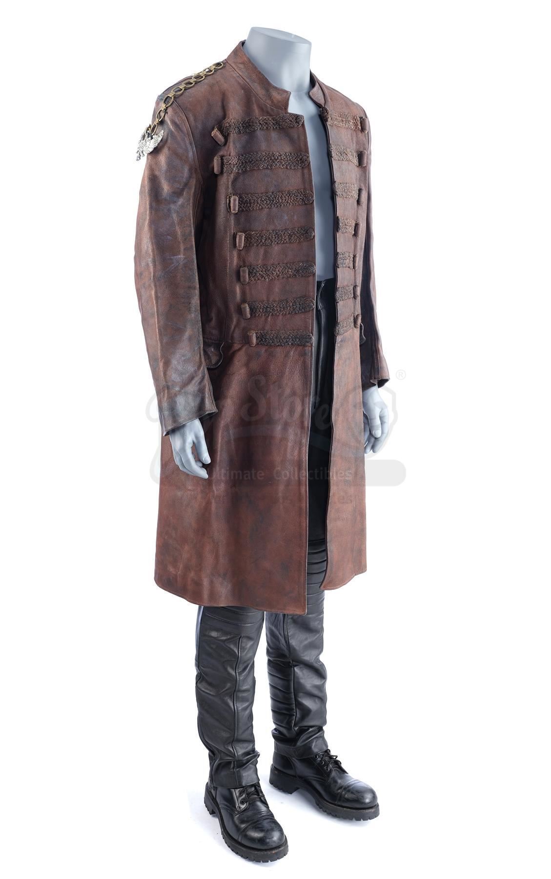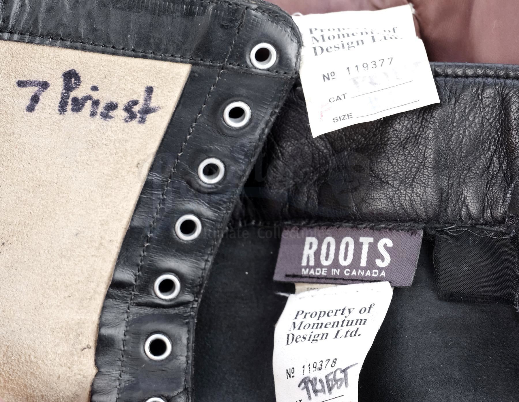 This costume consists of a brown leather overcoat with decorative leather details on the front as well as a metal dragon crest affixed to a chain on the right shoulder, a pair of black leather pants with padded elements, and a pair of black leather boots. Both the jacket and pants feature tags on their interiors reading "Property of Momentum Design Ltd." with "PRIEST" handwritten below while both boots feature "7 Priest" on their interiors. This lot is in excellent overall condition with some wear from production, including scuffing on the boots and some tears on the interior lining of the overcoat.
