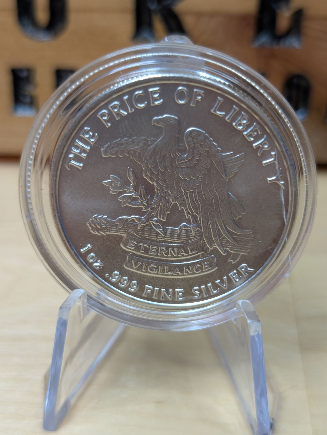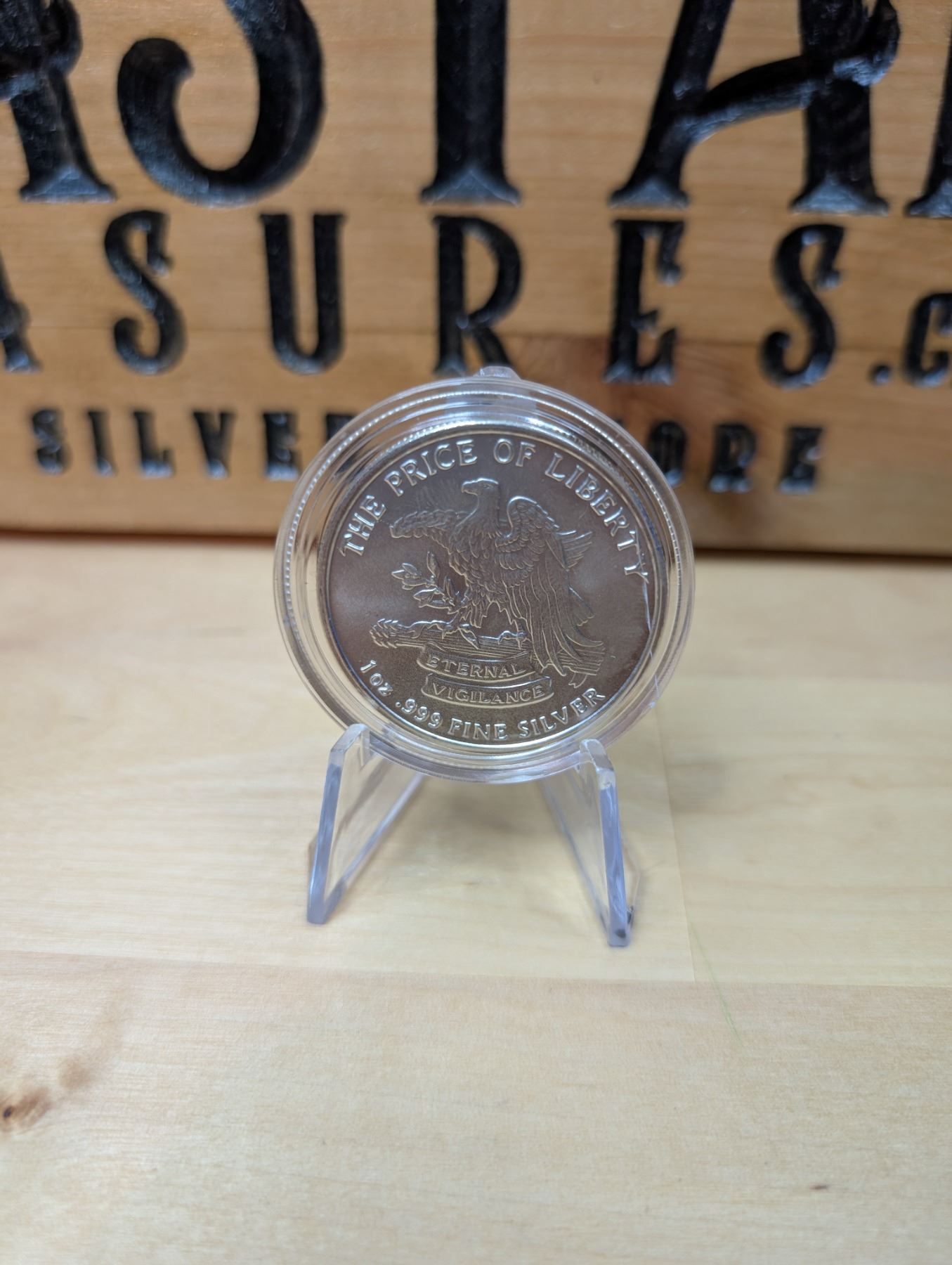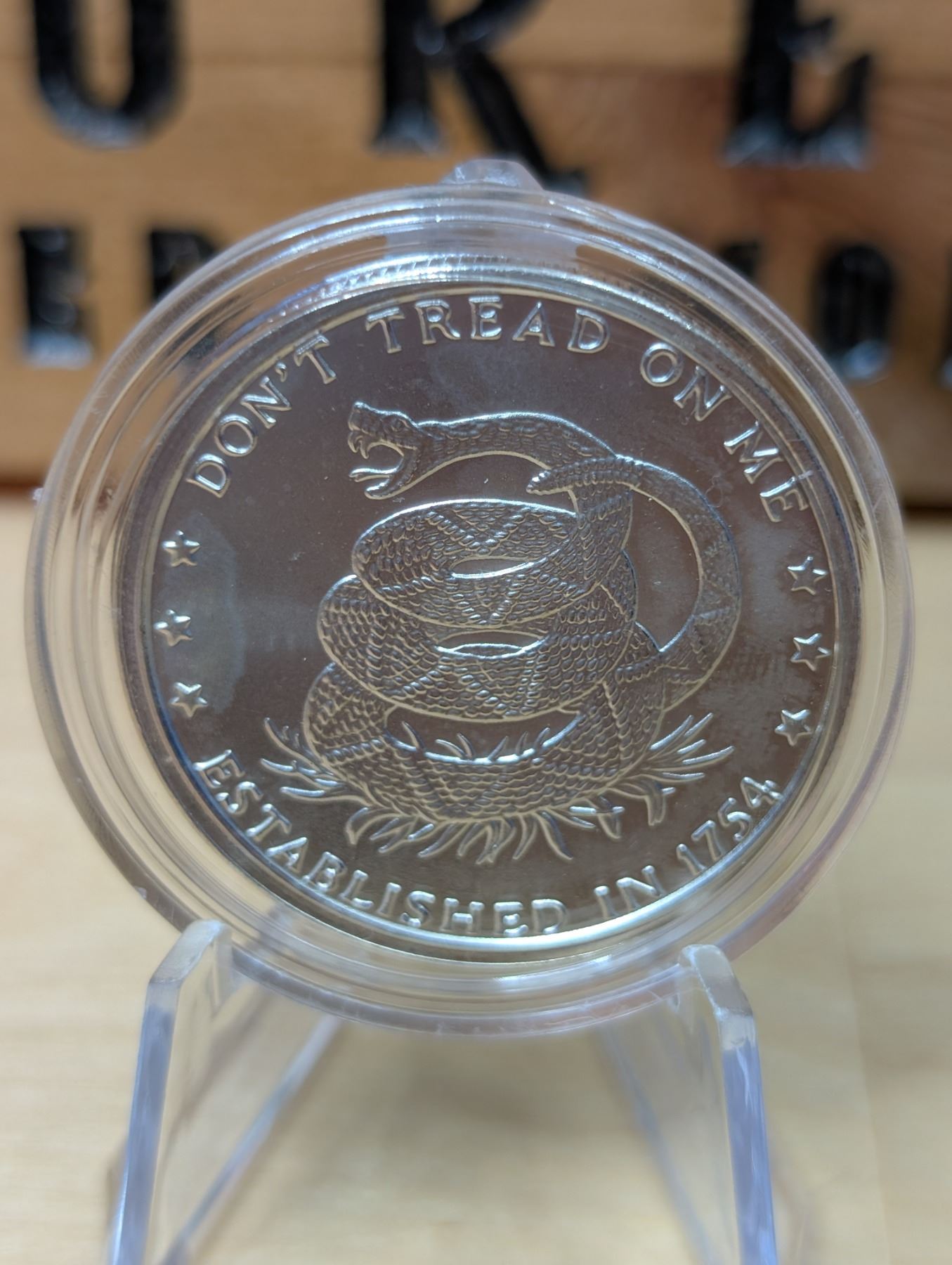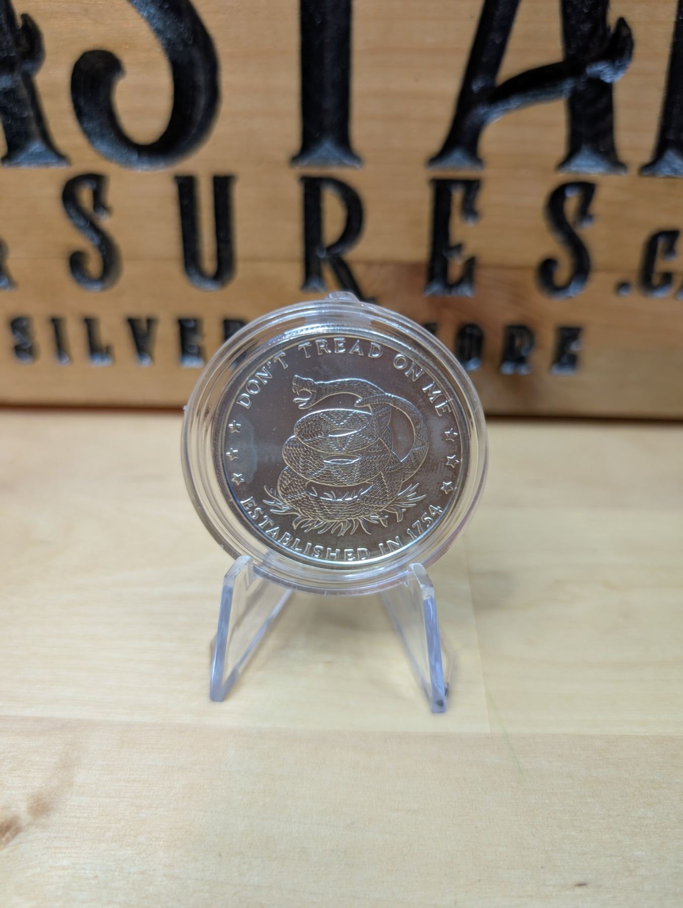 The 1 oz "Don't Tread on Me" silver round is made from .999 fine silver and features the Gadsden flag design, which includes a coiled rattlesnake and the phrase "Don't Tread on Me." This design is a symbol of American independence and resilience. The value of the round is based on the current price of silver and demand from collectors.