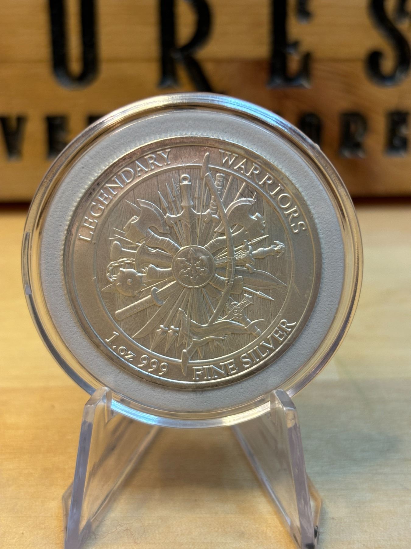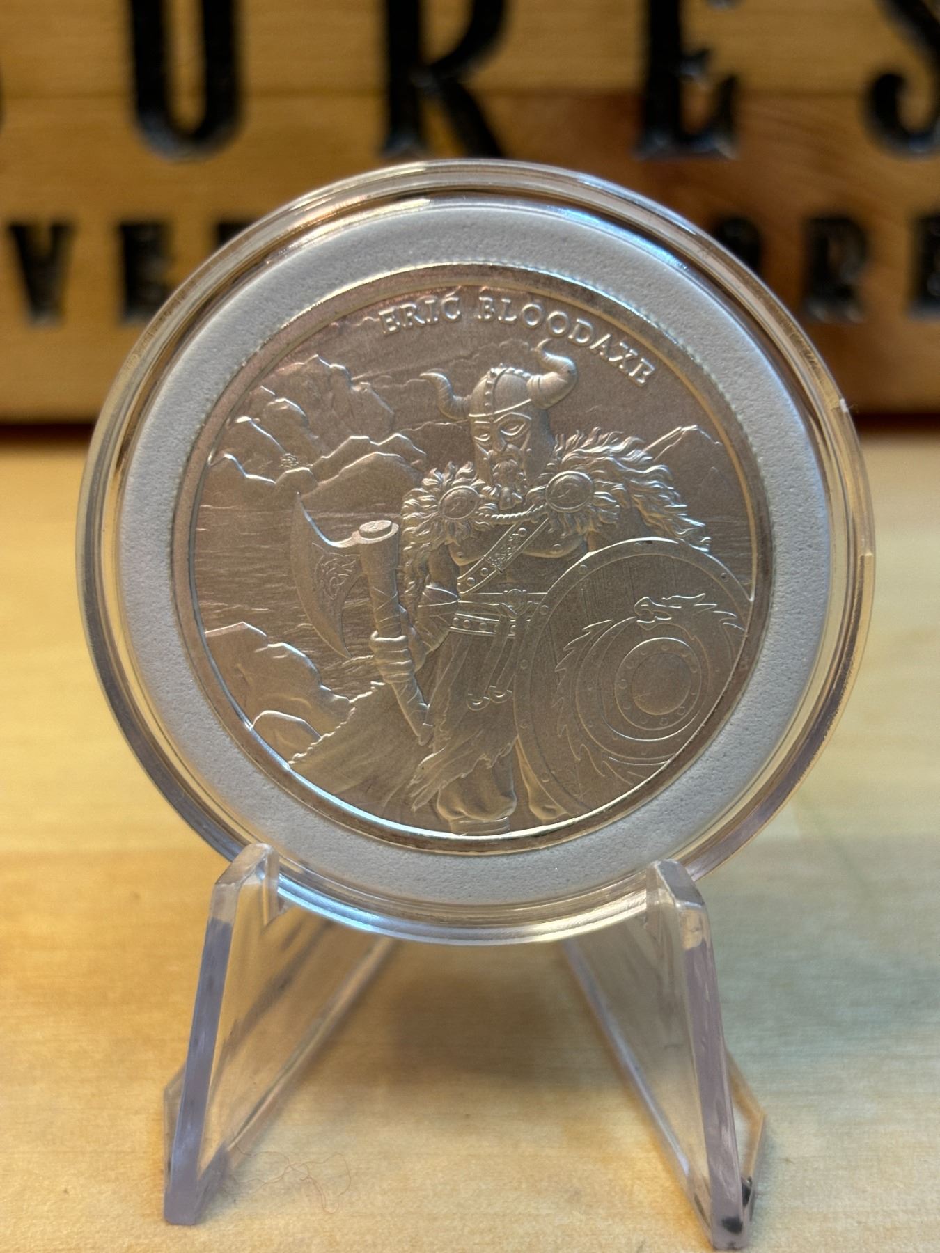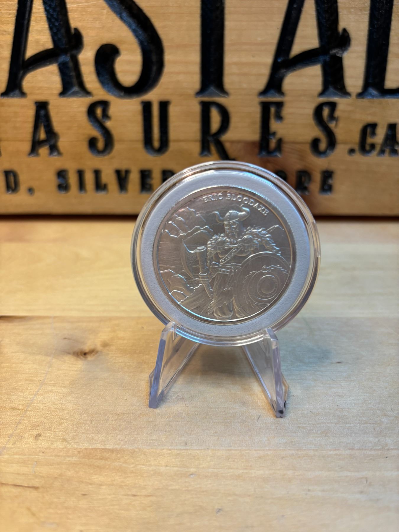 The 1 oz Legendary Warrior Eric Bloodaxe Silver Coin is a bullion coin inspired by the historical figure Eric Bloodaxe, a Viking king and warrior known for his role in the 10th century. Made from 1 ounce of .999 fine silver, this coin typically features a detailed design of Eric Bloodaxe, often depicted with Viking armor and weapons. The reverse may feature additional Viking-themed imagery, such as a longship or Norse symbols, while the obverse often showcases the face value and other coin markings. This coin is popular among collectors of Viking history and mythology, as well as those interested in high-purity silver.