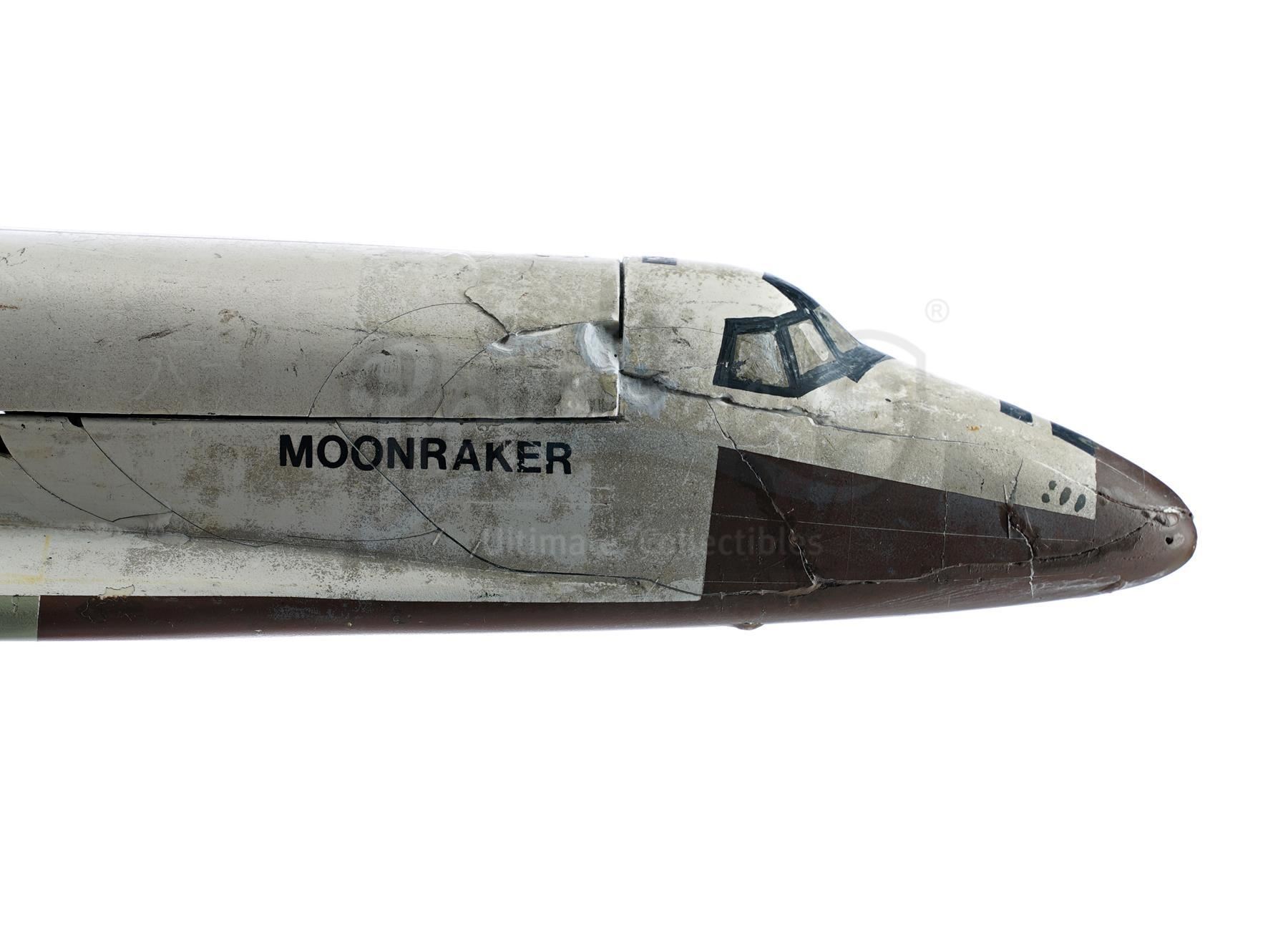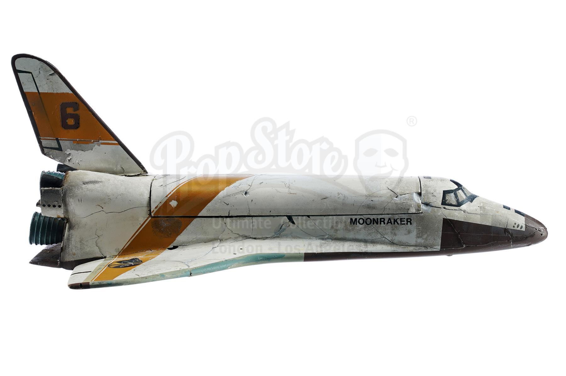 This lot will be auctioned on Tuesday, June 29th. The auction will begin at 9:00am PDT and lots are sold sequentially via live auctioneer; tune in to the live streaming broadcast on auction day to follow the pace. Note other lots in the auction may close on June 30th or July 1st. A Moonraker 6 shuttle model miniature from Lewis Gilbert's space spy adventure Moonraker. Constructed by a corporation headed by Hugo Drax (Michael Lonsdale), Moonraker 6 launched from an aeronautics complex in the Amazon, transporting James Bond (Roger Moore) to Drax's secret space station. Various scales of Moonraker shuttles were built by Derek Meddings' model team for the film, with this being one of the smallest scale shuttles at 16". Contructured of resin, this white and orange model miniature is based on the design of a NASA Space Shuttle Orbiter. It features three clustered black space engines, a dark brown underbelly and nose cone, a "Moonraker" marking on both sides and a tail rudder with a black "6" on both sides. The interior is rigged with pipes for pluming liquid nitrogen that would simulate engine exhaust on camera. The underside of the model also features several holes where it was previously mounted during filming. Derek Meddings model work is highly sought after and scarce, and Moonraker's visual effects were highly regarded upon its release. The piece exhibits wear and some damage from use and age, including extensive cracking with some missing body components. Minor stabiliziation and paint in-fill has been applied to improve its aesthetic, and it is in overall fair condition. Dimensions: 16" x 10" x 7" (40.5 cm x 25.5 cm x 17.75 cm) Estimate: $6,000 - 8,000