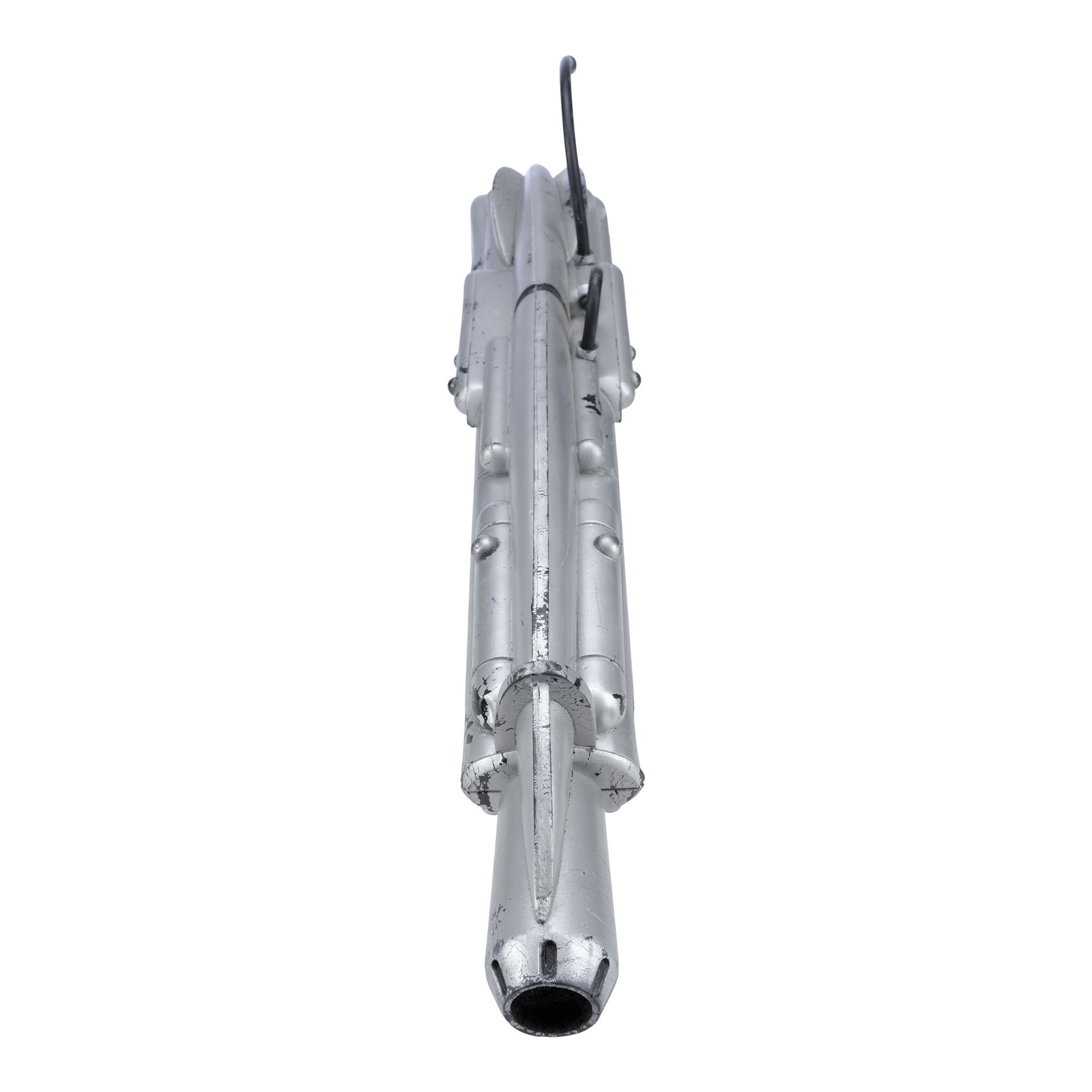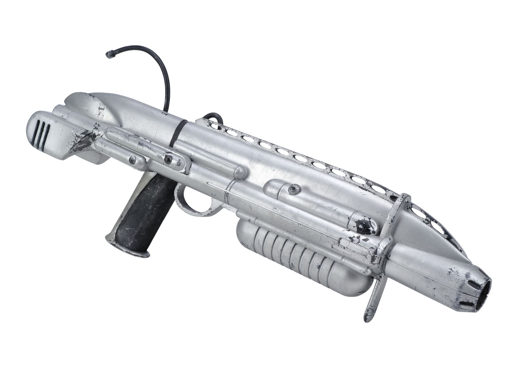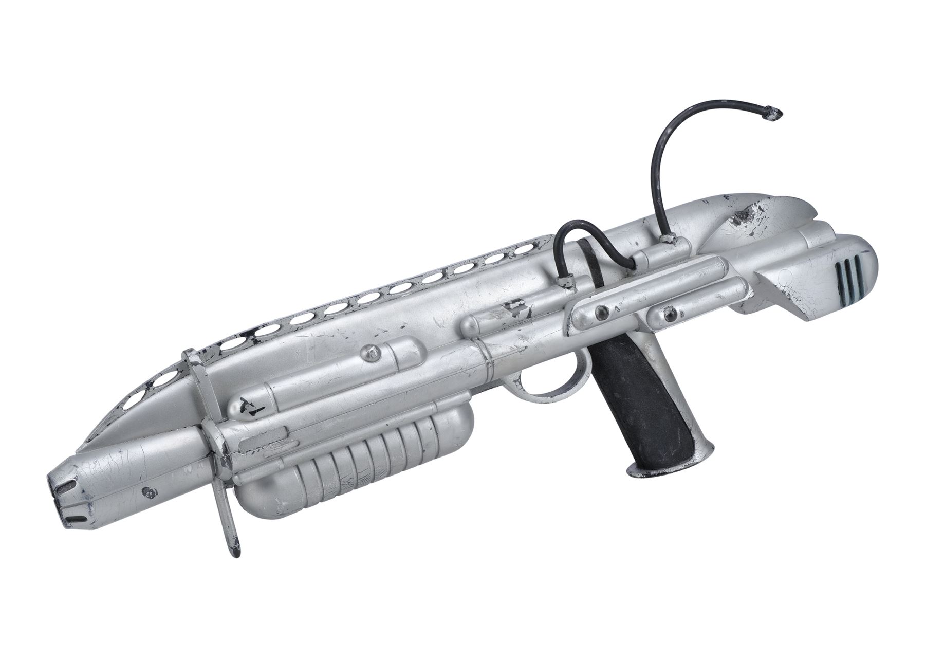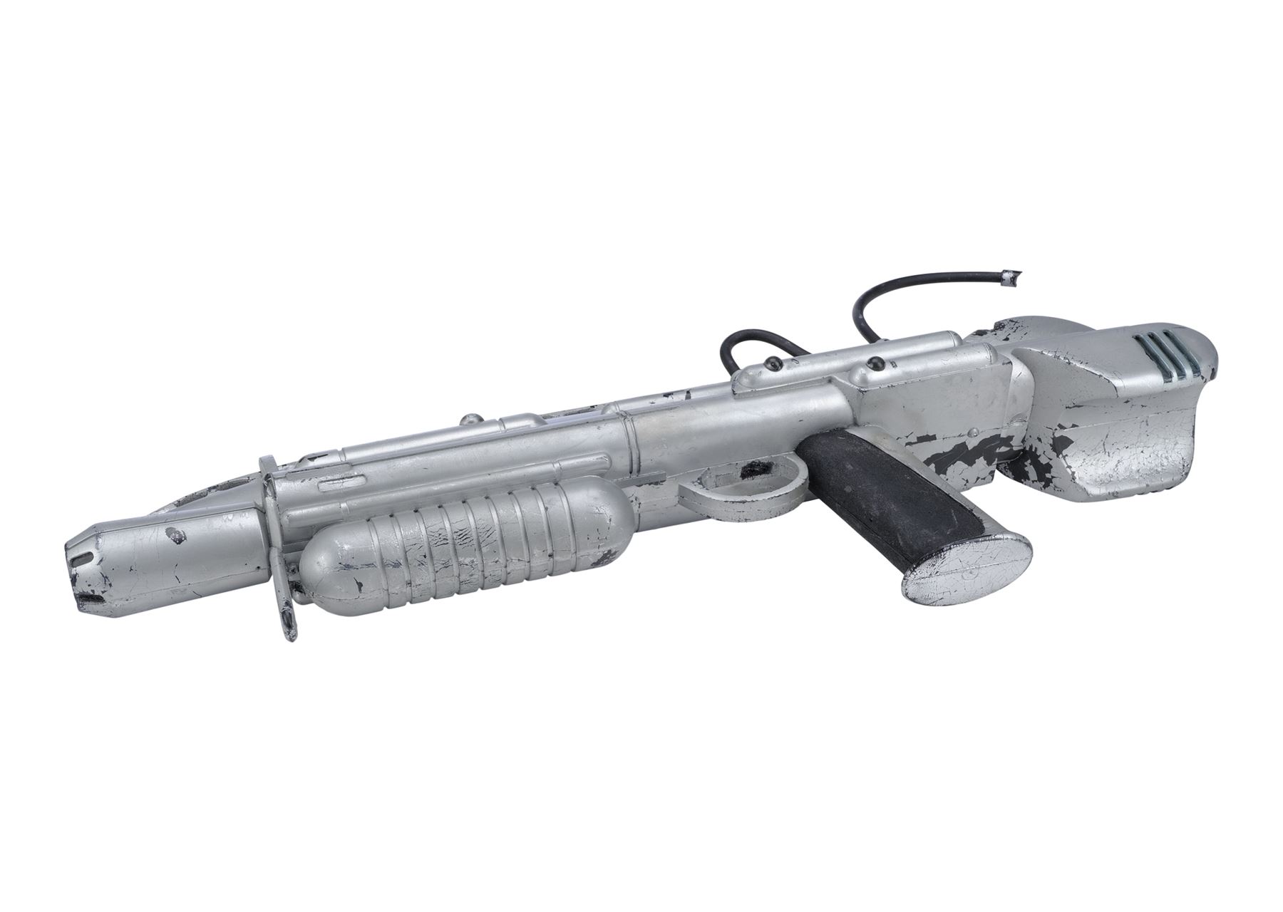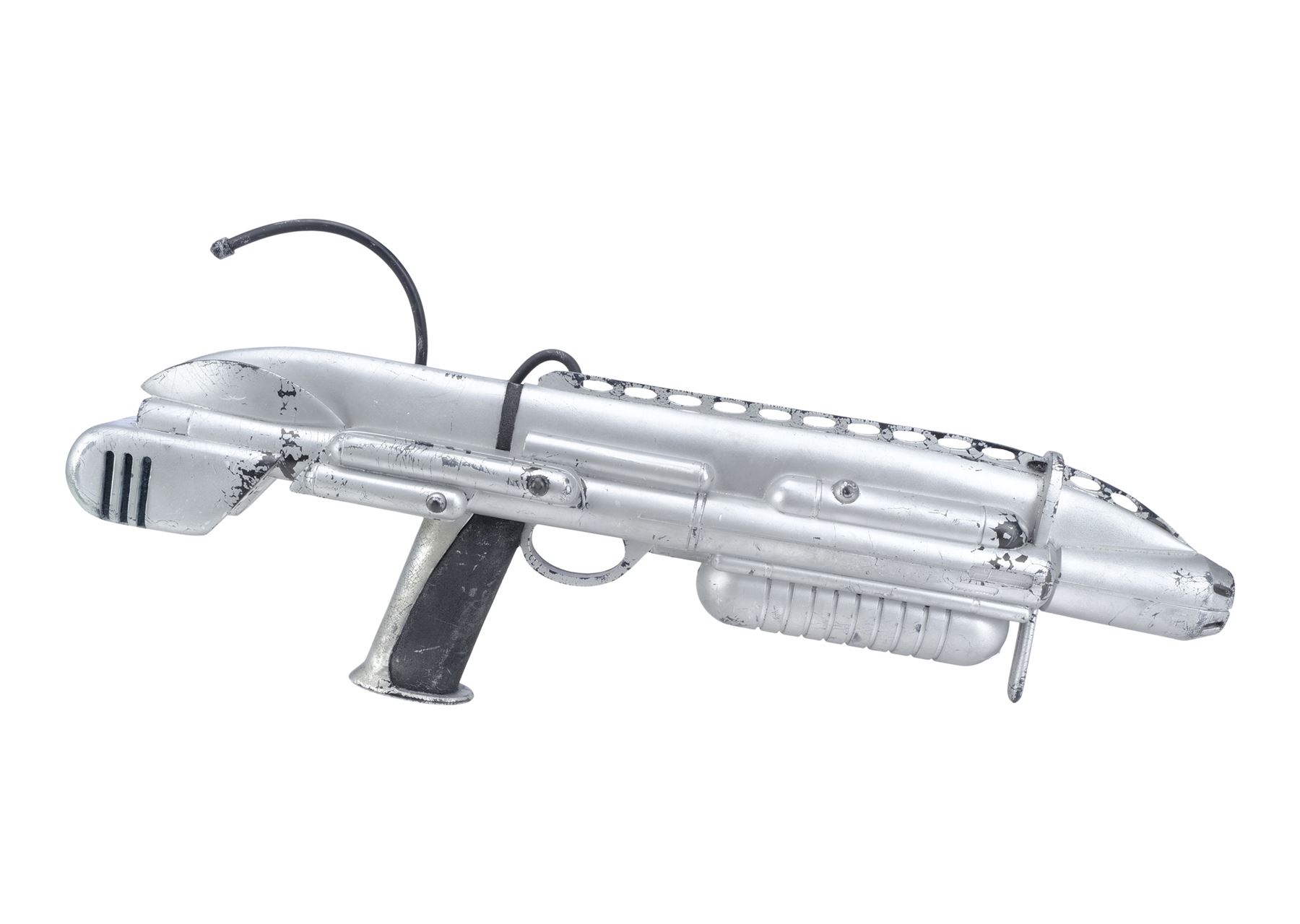 This lot consists of one static, futuristic-looking rubber foam blaster. Painted a light silver-colour, this blaster features a top holed fin-like ridge and vents at the back of the frame. This lot exhibits notable paint marks, cracking and pitting, as well as chipped and flaking paint. Dimensions: 56 cm x 25.5 cm x 10.25 cm (22" x 10" x 4")