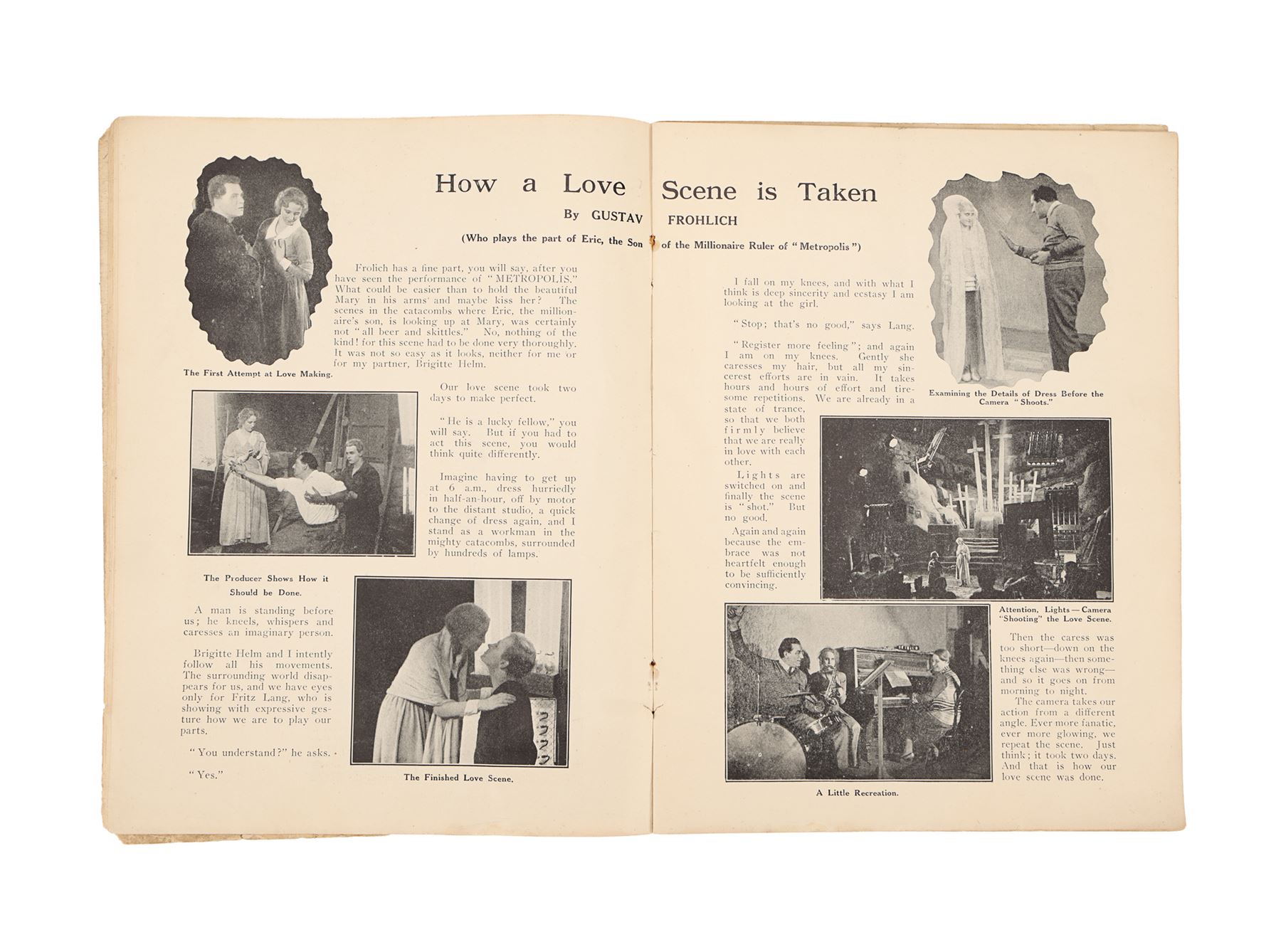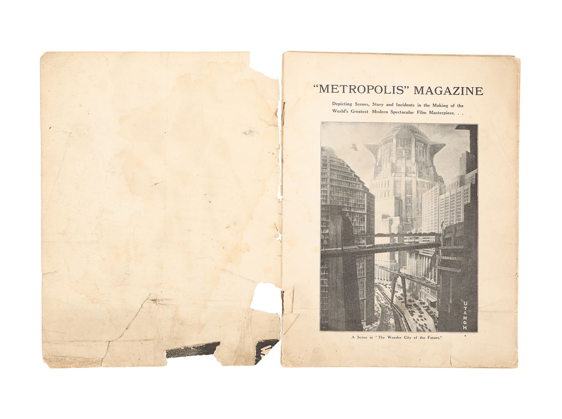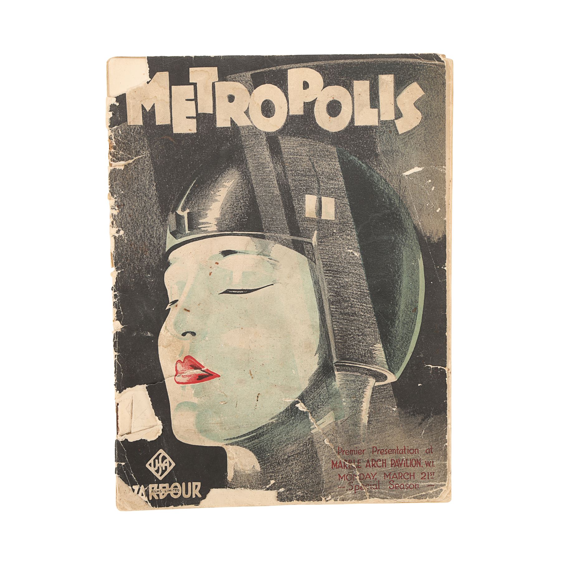 An original programme from the promotion of Fritz Lang's sci-fi classic Metropolis. The cover of the programme uses the rarest poster image for the film, and its contents include scene depictions, a synopsis, production facts, and quotes from Lang and other key crew members.