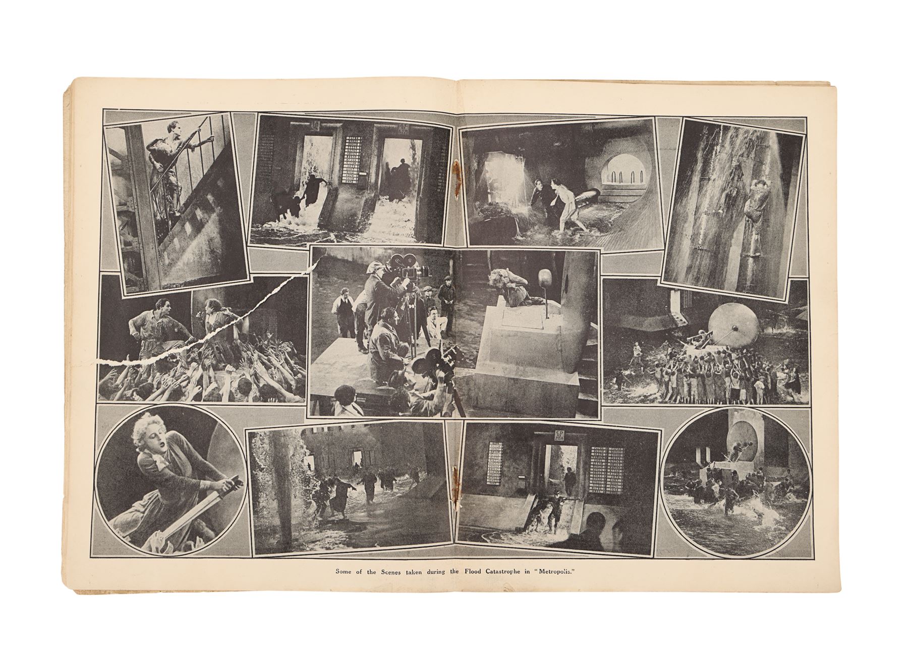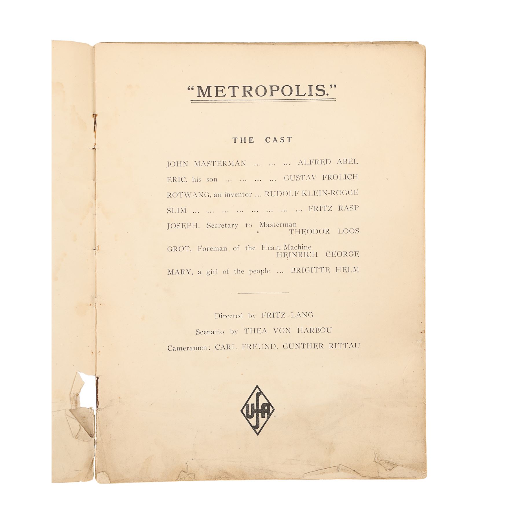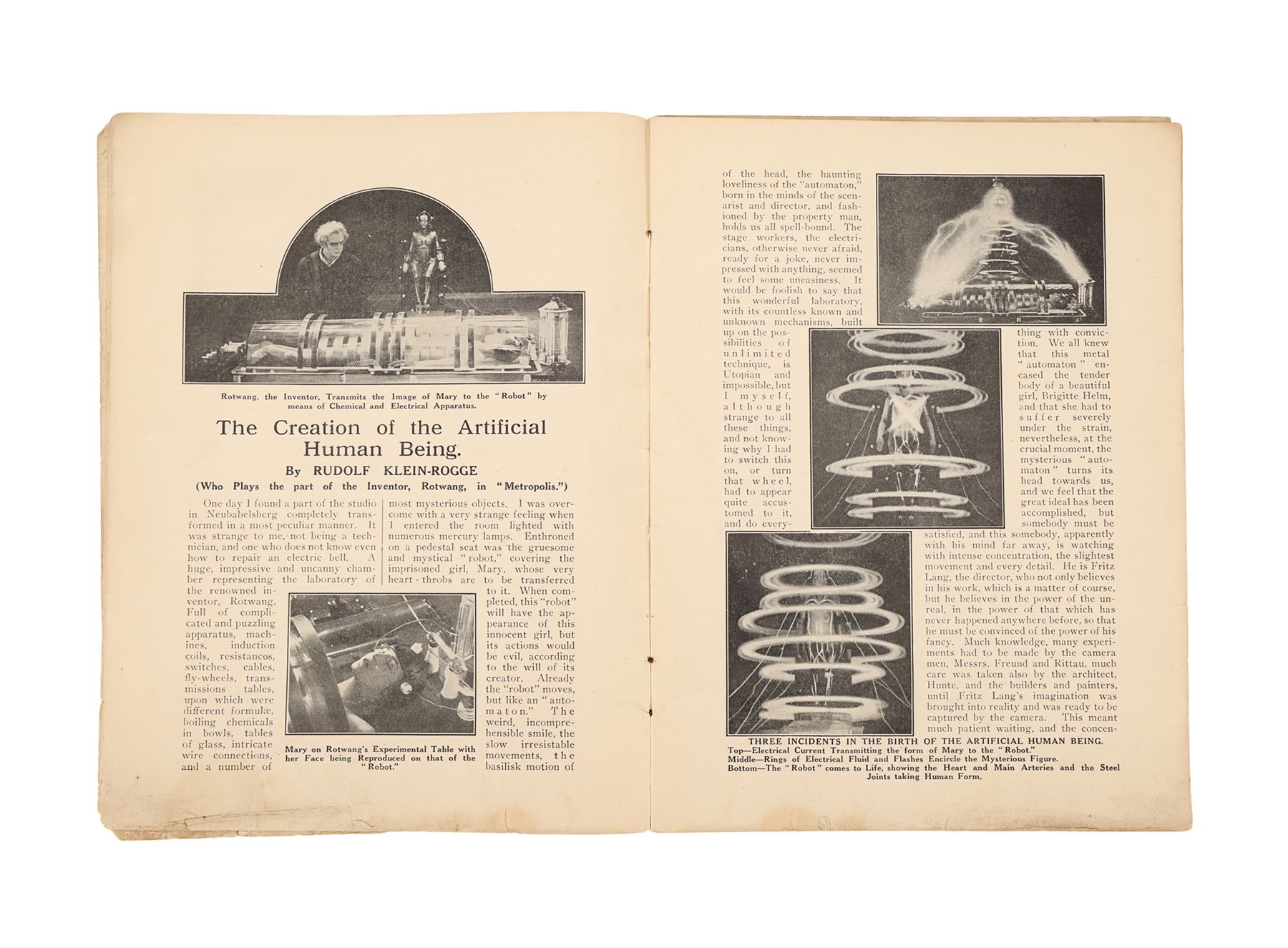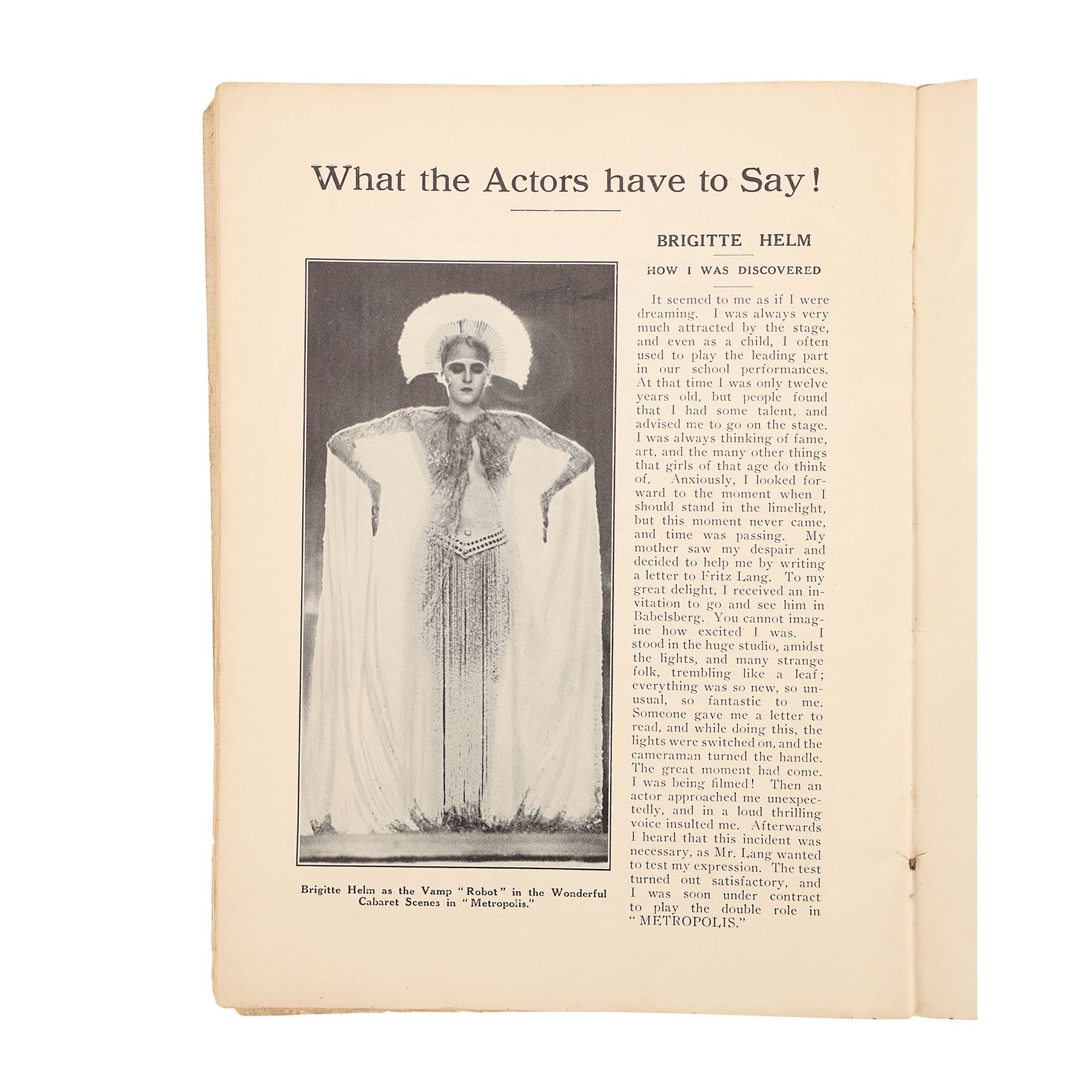 An original programme from the promotion of Fritz Lang's sci-fi classic Metropolis. The cover of the programme uses the rarest poster image for the film, and its contents include scene depictions, a synopsis, production facts, and quotes from Lang and other key crew members.
