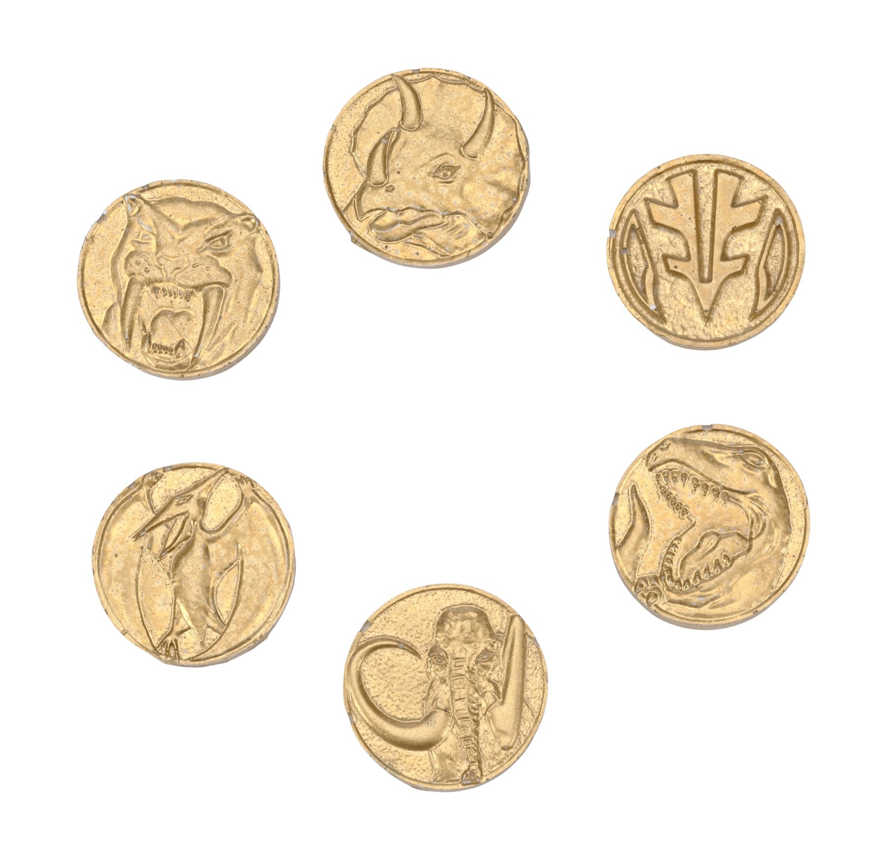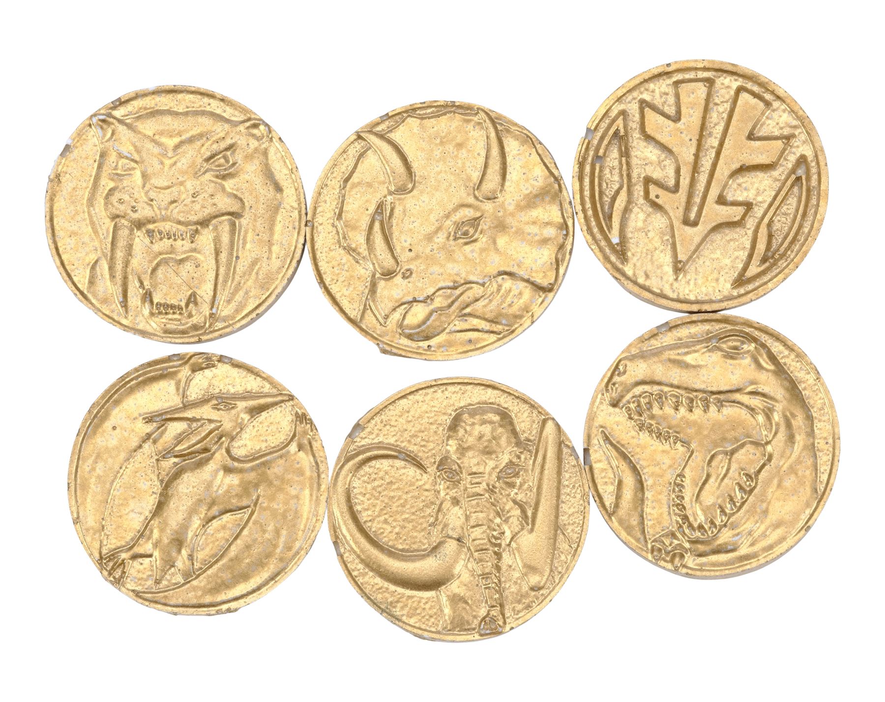 This lot consists of six gold-colour resin power coins depicting a Tyrannosaurus, Triceratops, pterodactyl, mastodon, sabre-tooth tiger, and the White Ranger's white tiger symbol. They exhibit chipping to the paint and in the resin along the edges. Dimensions: (each) 3.25 cm x 3.25 cm x 0.5 cm (1.25" x 1.25" x 0.25")