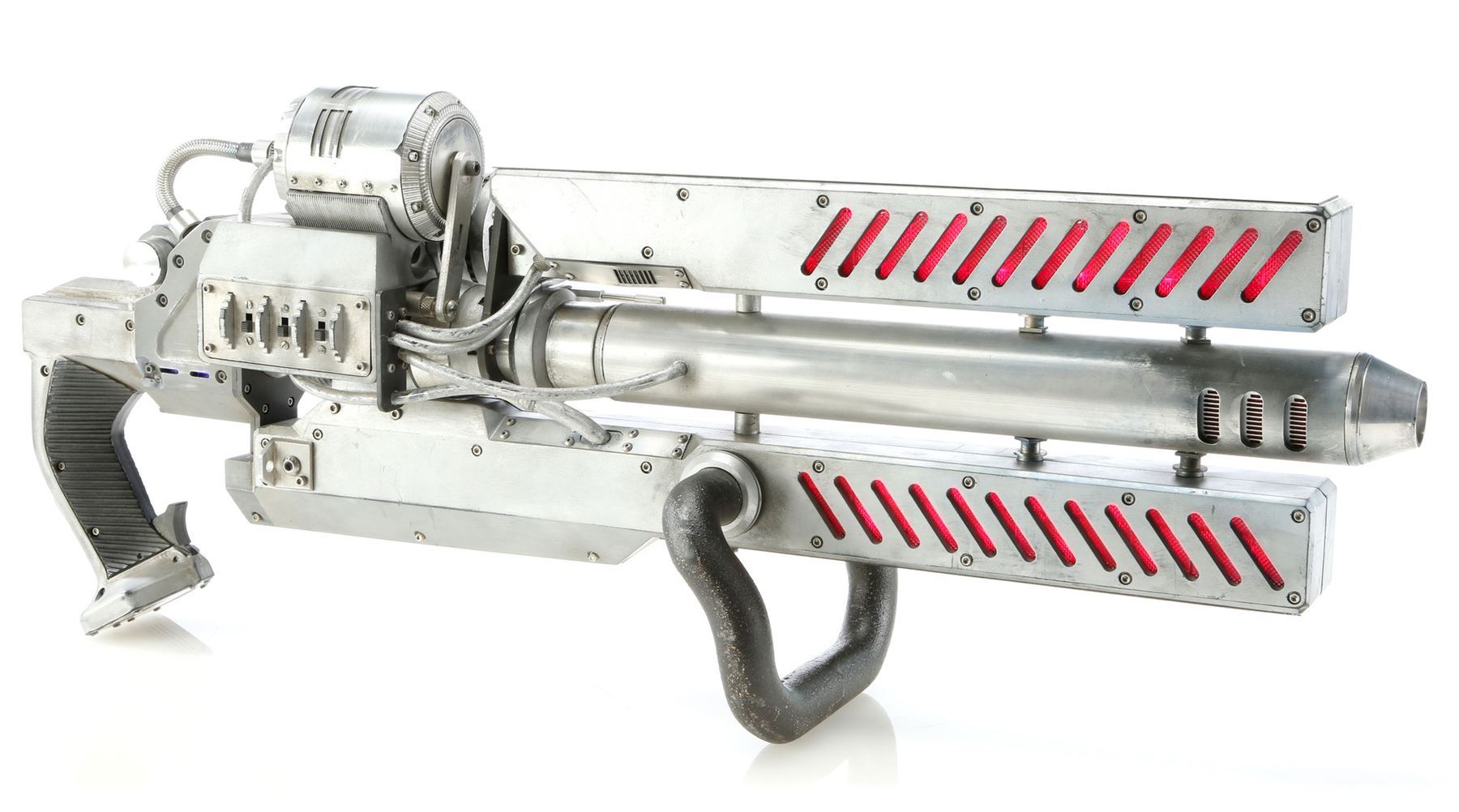 TERMINATOR GENISYS (2015) - Light-Up Aluminum Plasma Minigun - A light-up aluminum plasma minigun from Alan Taylor's sci-fi action sequel Terminator Genisys. John Connor (Jason Clarke) shot and killed an Infiltrator Terminator that attempted to attack adolescent Kyle Reese (Bryant Prince).