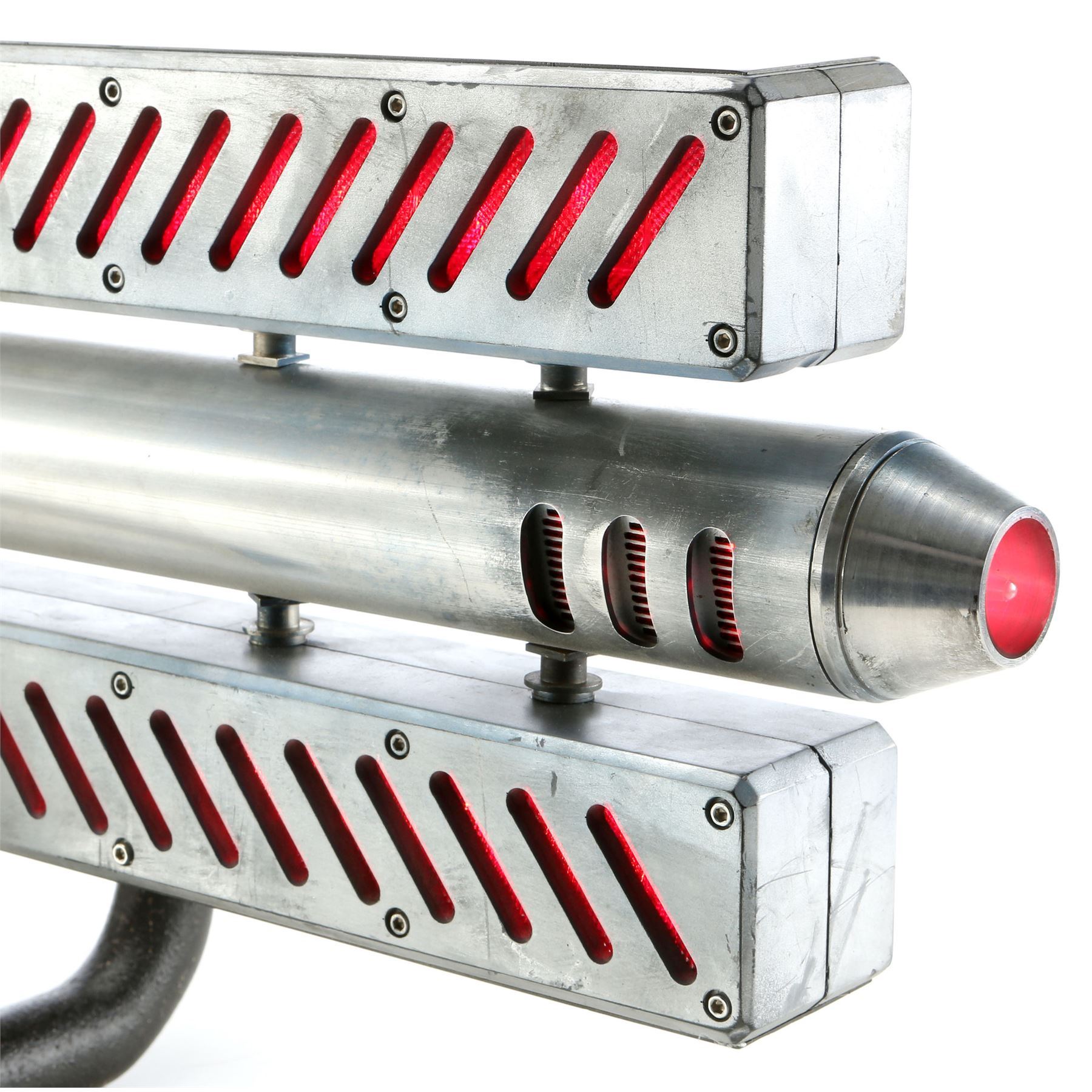 This aluminum and stainless steel plasma minigun features an illuminating barrel and a black resin handle. The sides feature several wires and switches that operate internal red and blue LED lights, while the trigger operates a "blast" light sequence. It exhibits signs of wear from age and production use, including scuffing to the finish. Dimensions: 30" x 8" x 13" (76.25 cm x 20.5 cm x 33.25 cm)