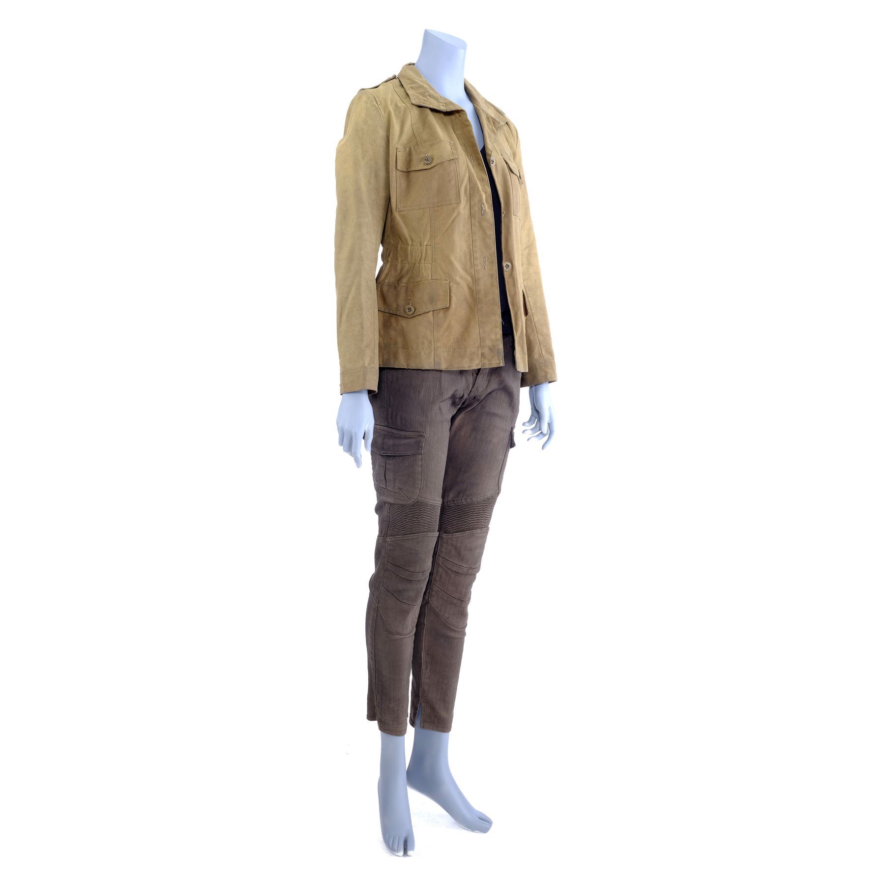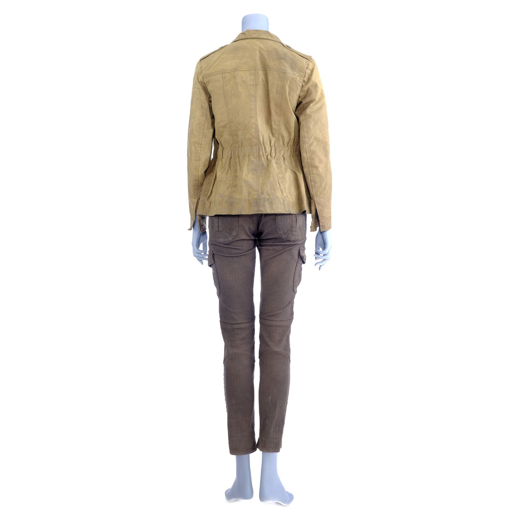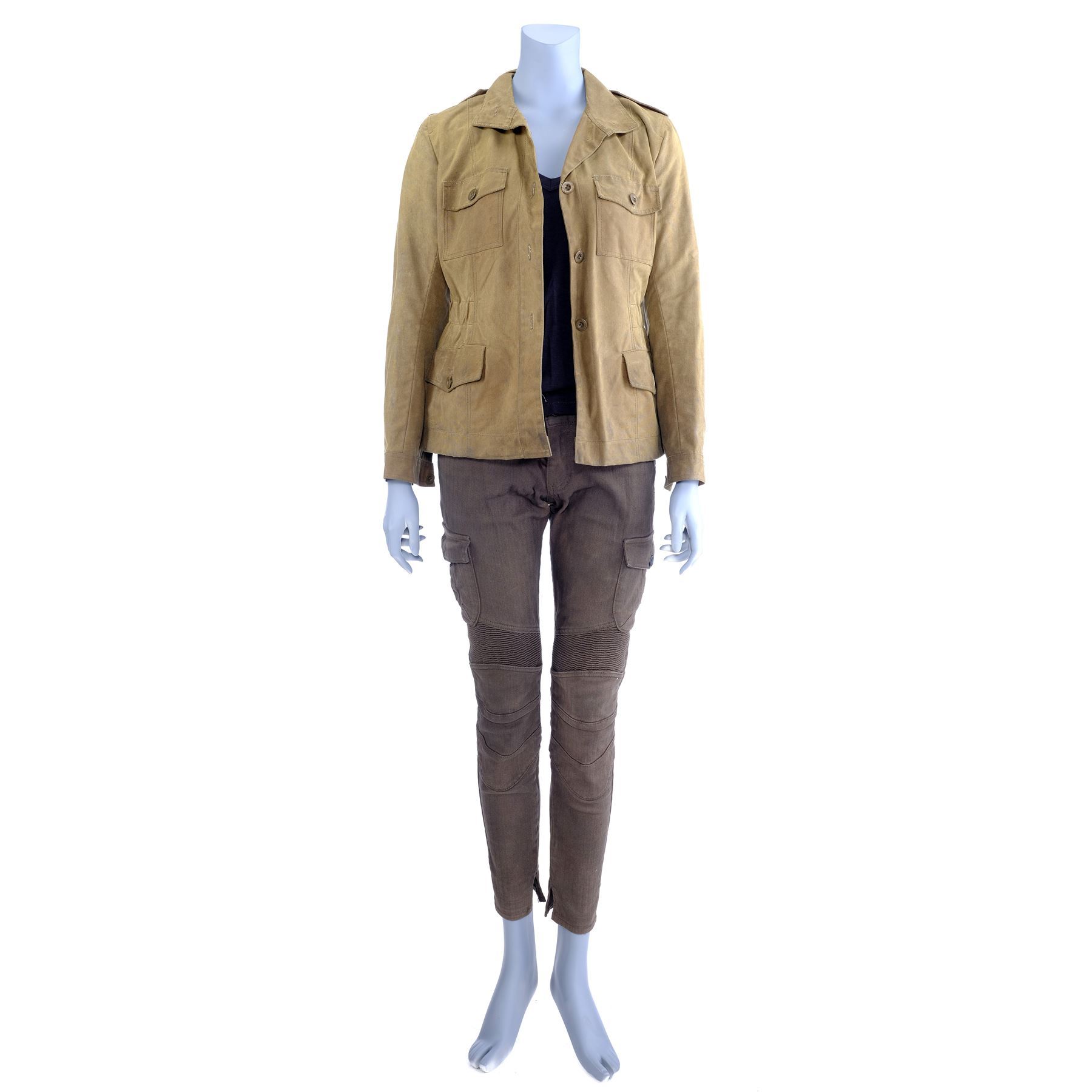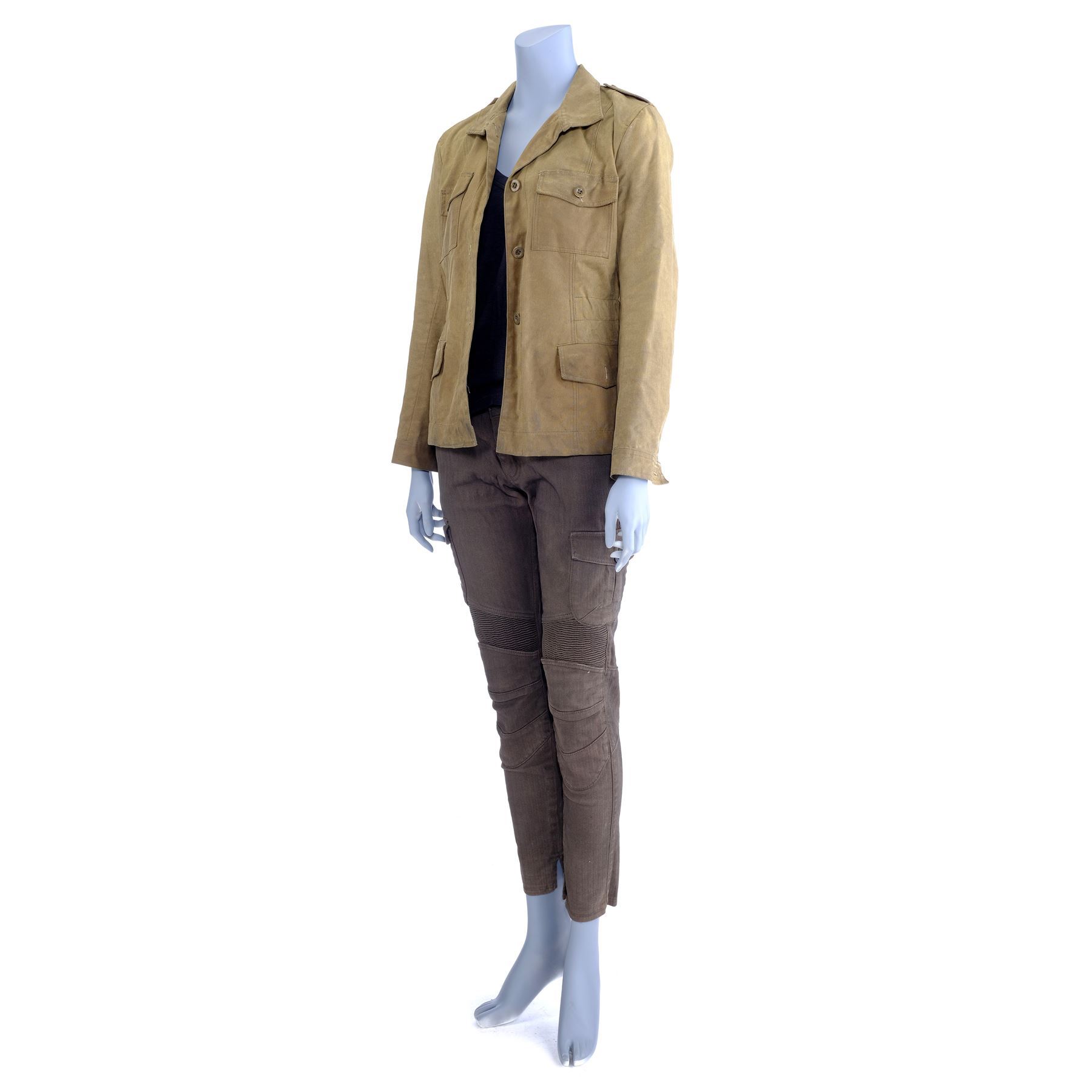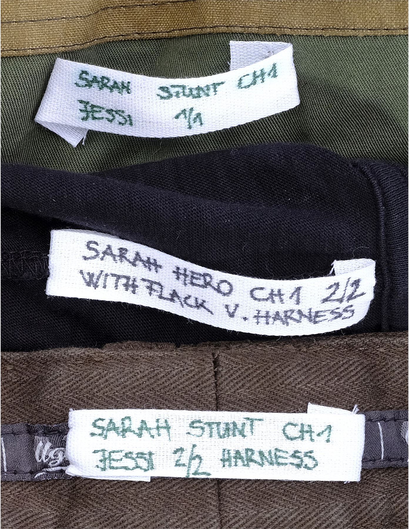 This lot consists of a black cotton shirt marked "Sarah Hero" on a sewn label; a beige cotton-twill jacket marked "Sarah Stunt" on a sewn label; and a pair of brown cotton pants marked "Sarah Stunt" on a sewn label. This lot exhibits discoloration from production use.