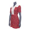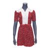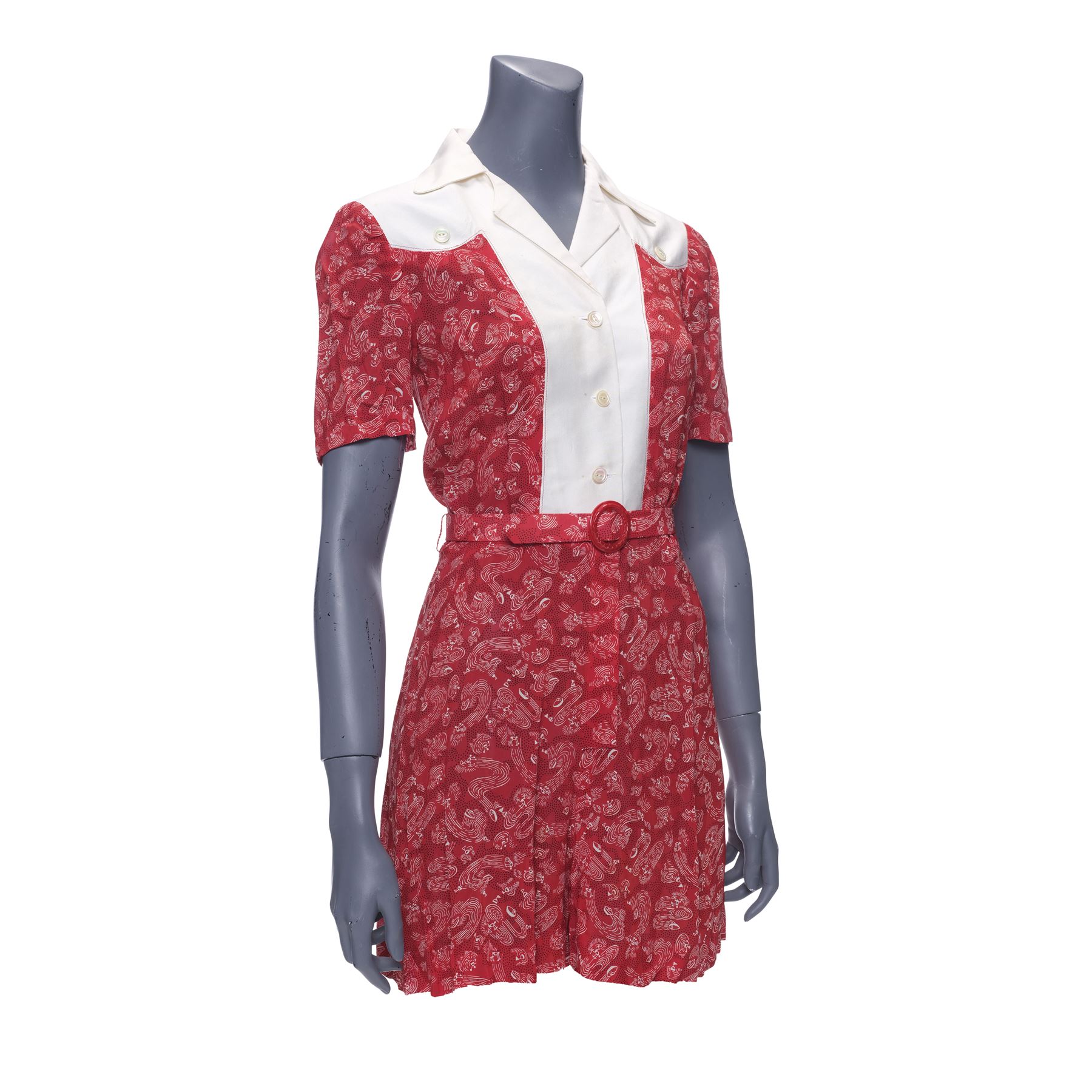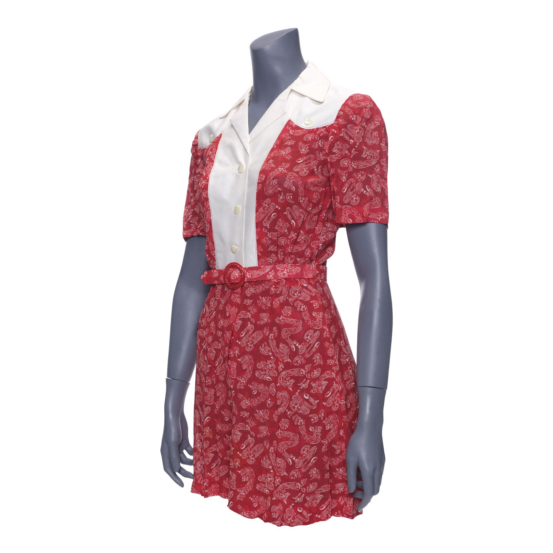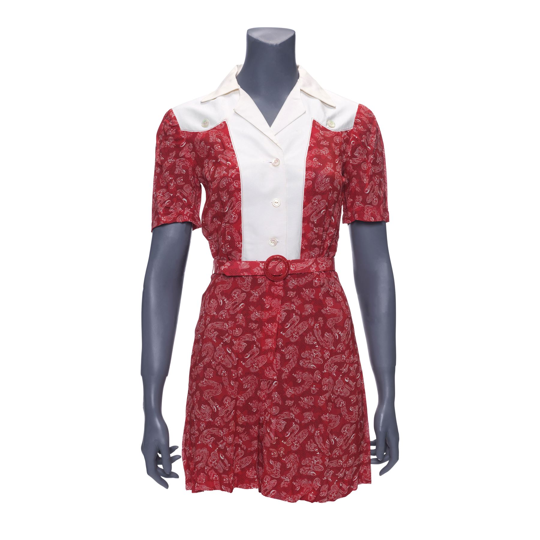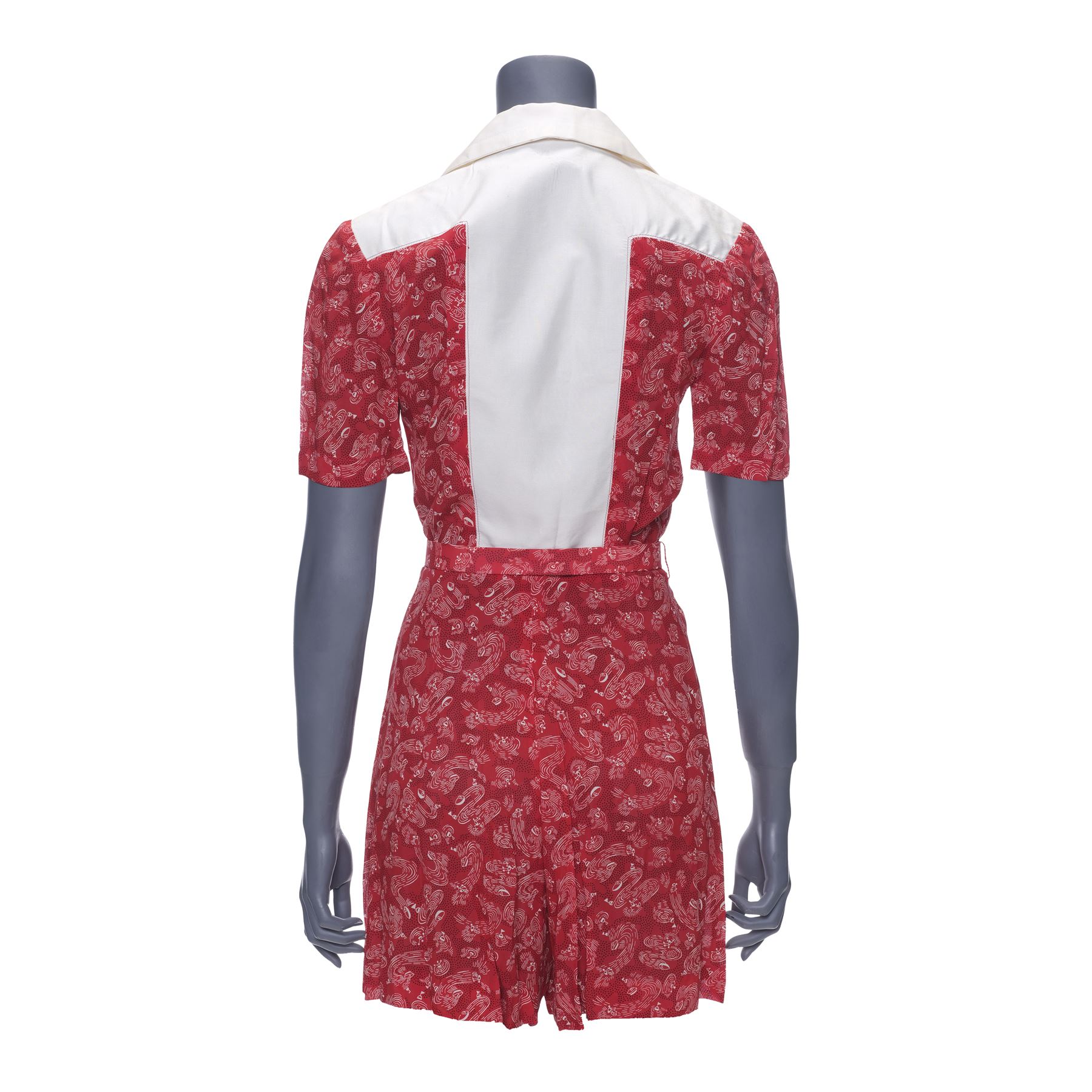 This red and white romper is made of cotton with a fitted top and flowing pair of short bottoms. The body features a patterned print on the red fabric and pearlescent white plastic buttons on the white bib. It also comes with a matching fabric belt. The romper exhibits discolouration.