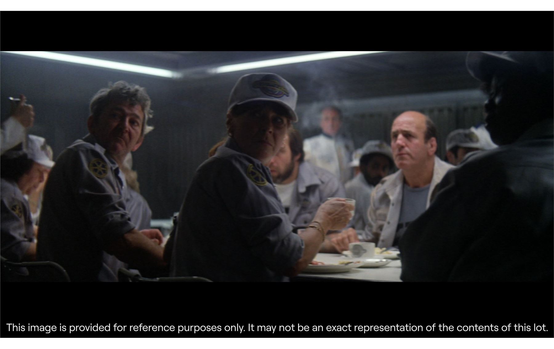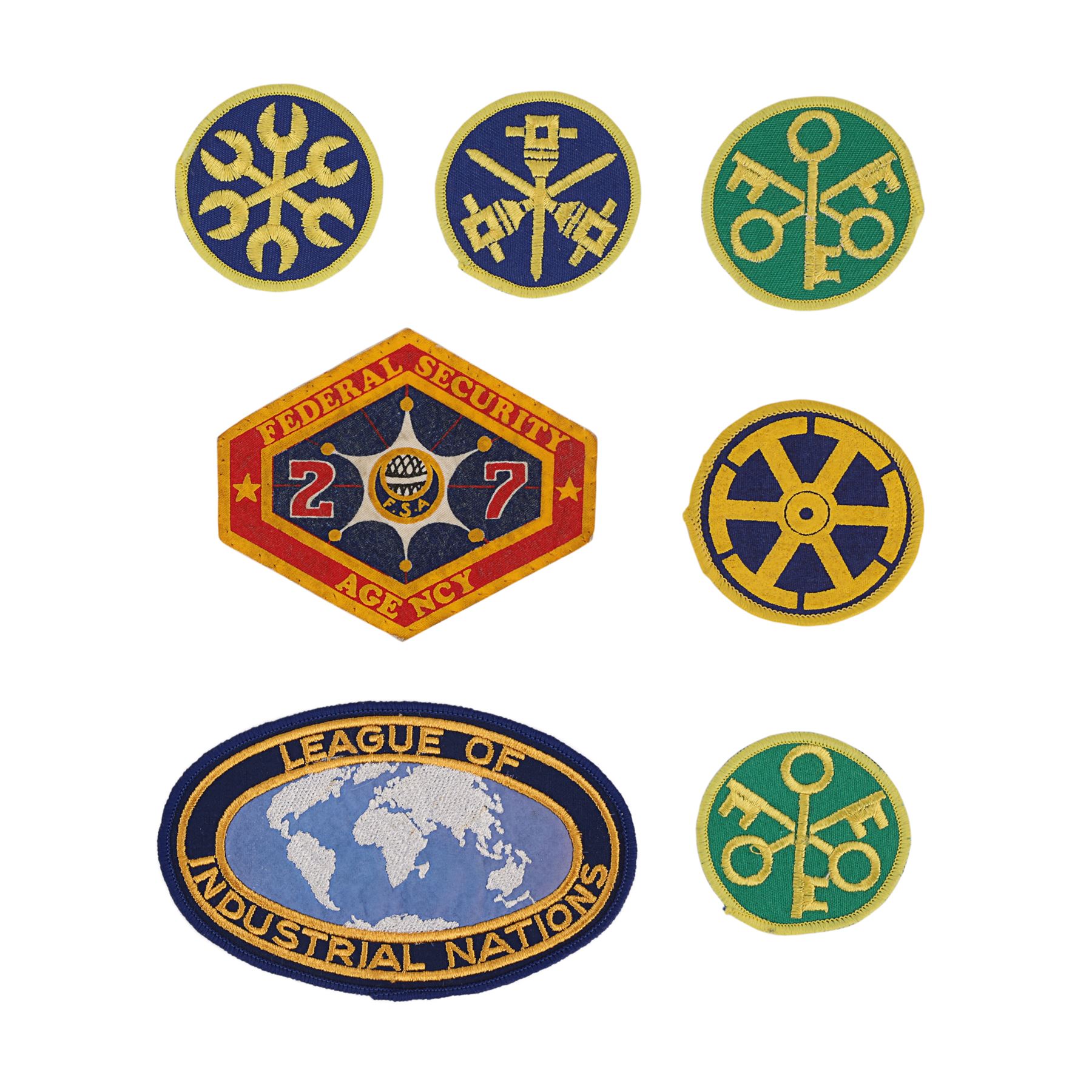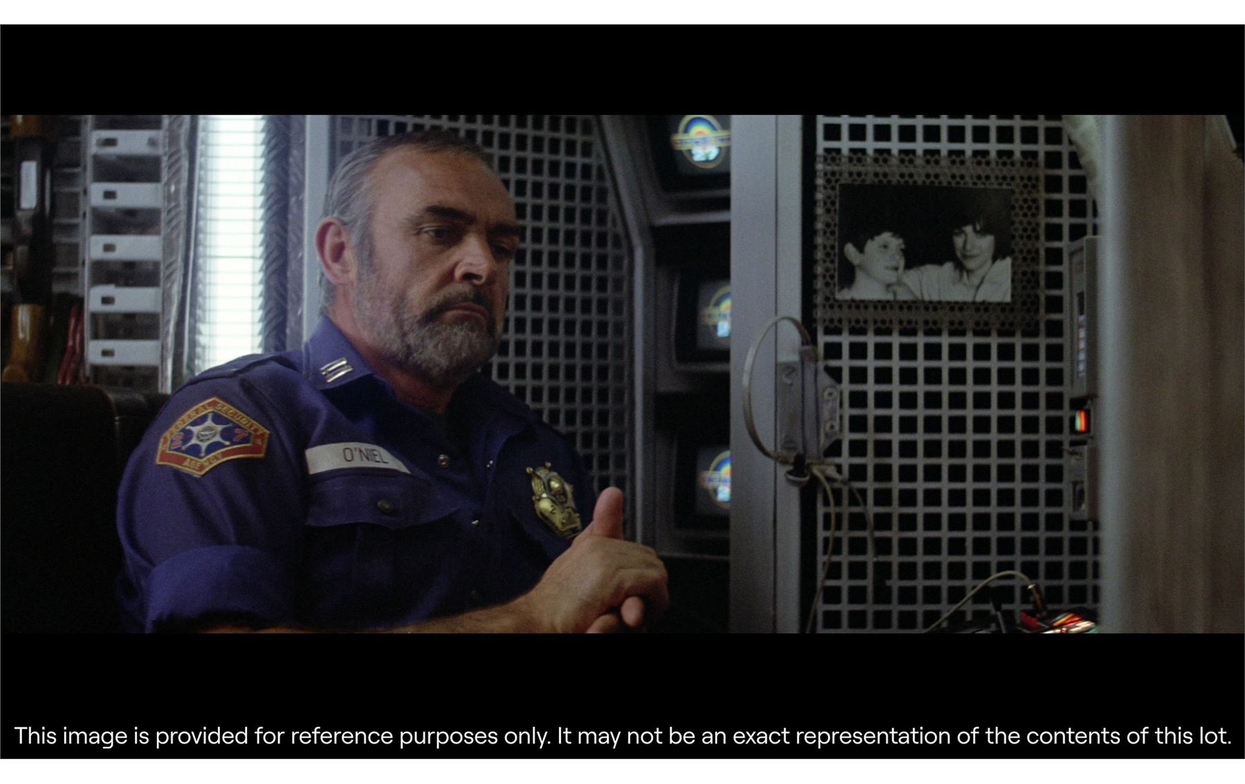 A pair of scripts and a collection of seven patches from Peter Hyams' sci-fi film Outland. All the patches are made from cotton twill, and include a hexagonal "Federal Security Agency" patch worn on the sleeves and hats of members of this organisation, including protagonist Marshal William O'Niel (Sean Connery); an oval-shaped "League of Industrial Nations" patch, as seen on the spacesuit sleeves of miners working for Con-Amalgamate; a green patch with three overlapping golden keys worn on Marshal O'Neil's left shoulder; and five more patches of different designs.