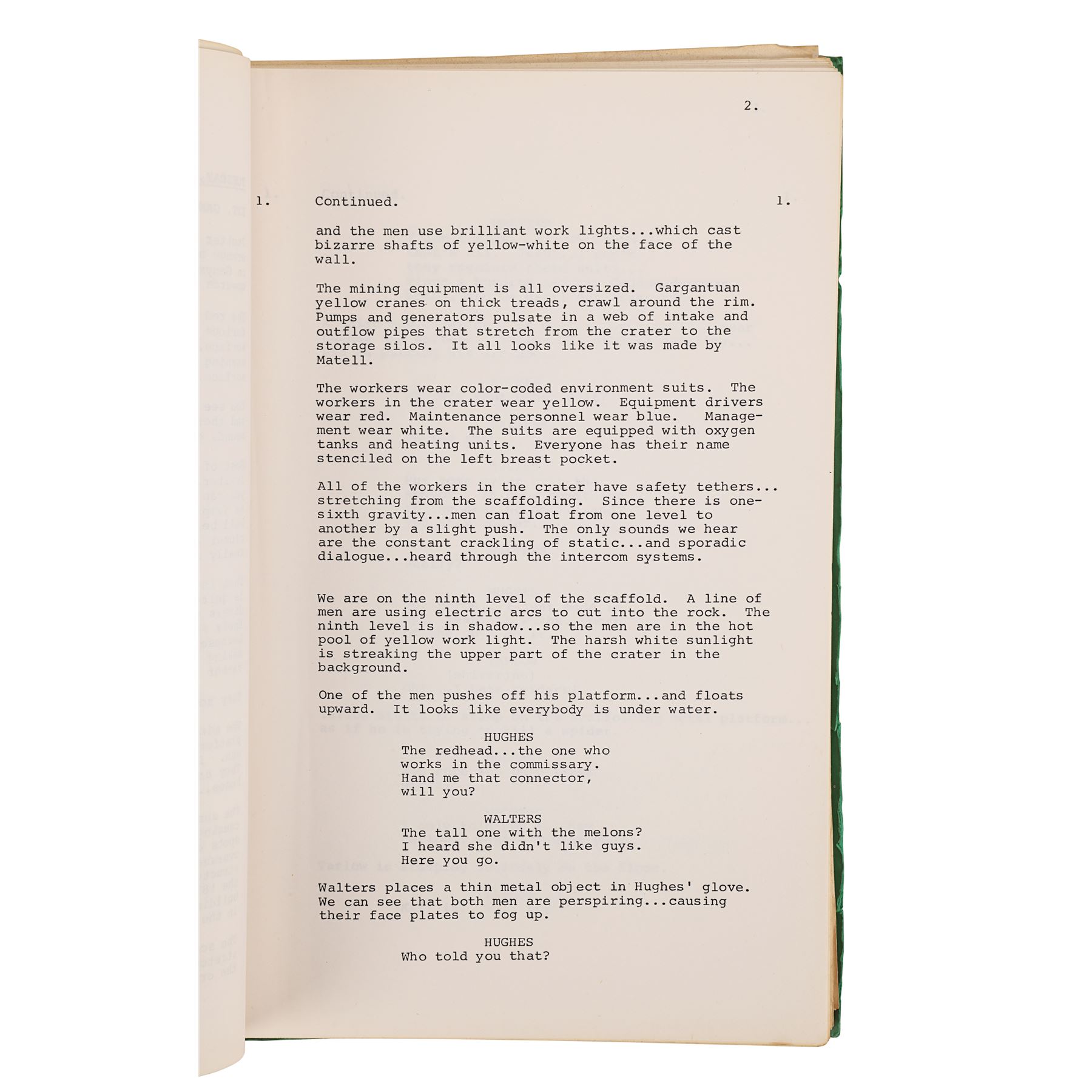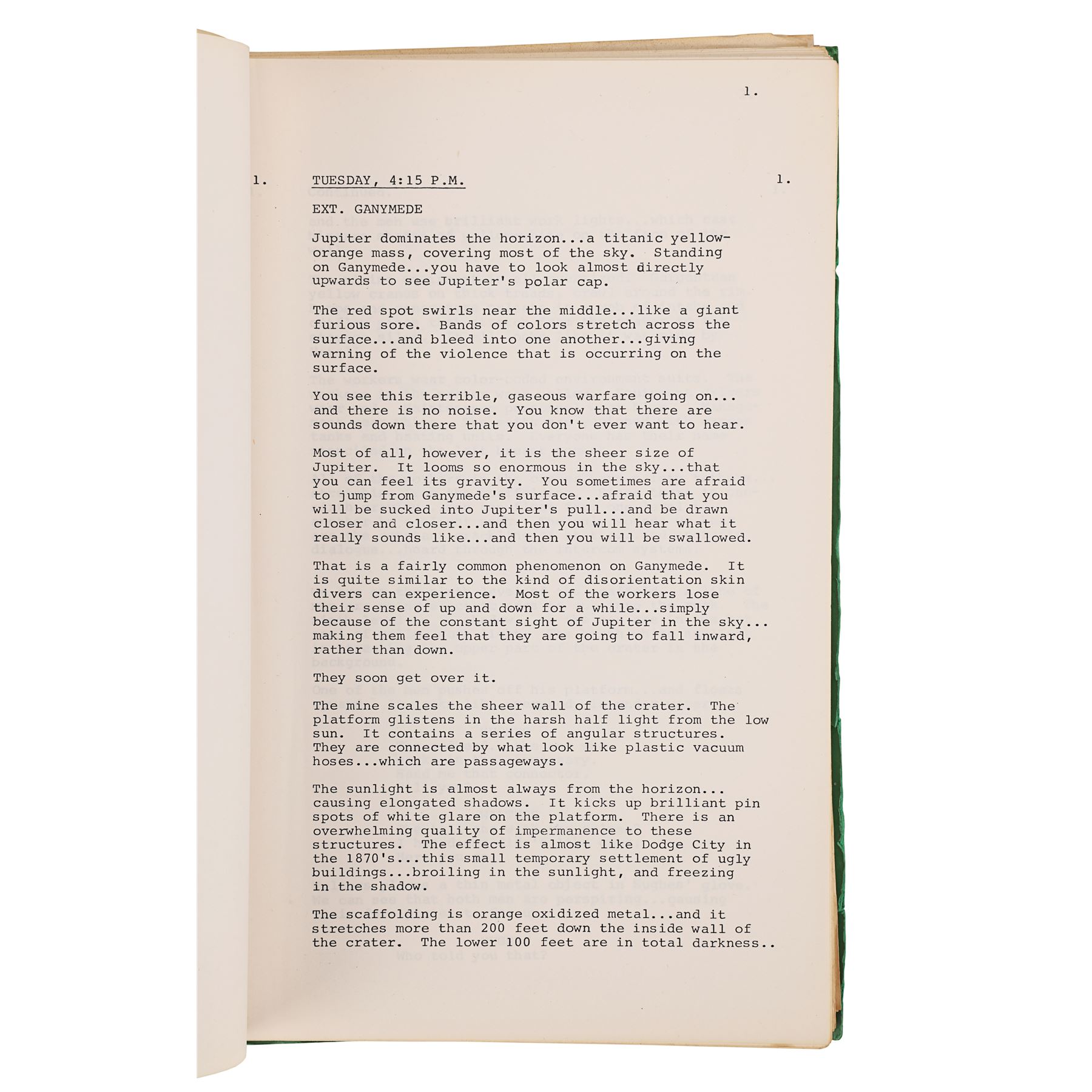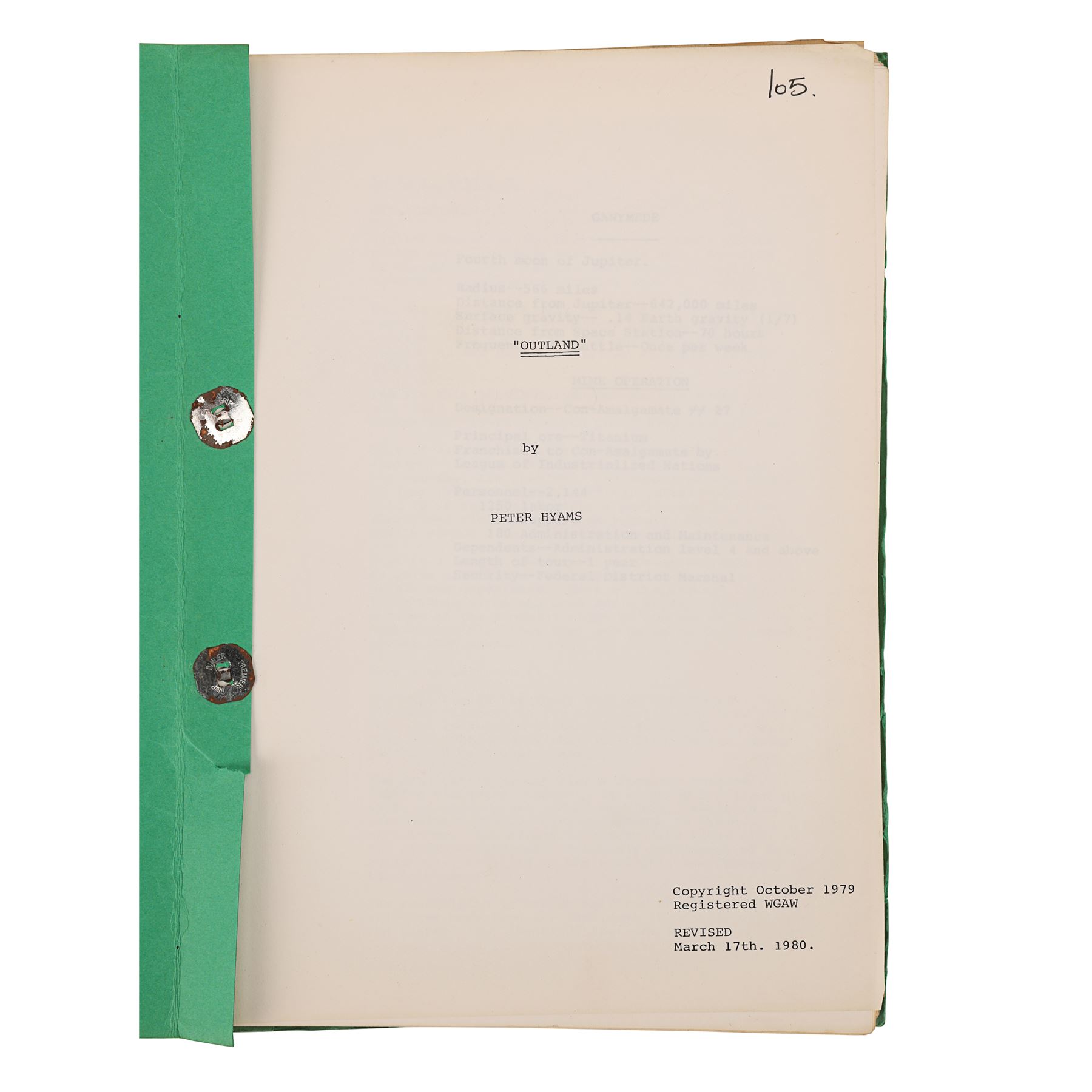 Also included in the lot is a green folder containing two scripts. The first is a full-length script dated "March 17th 1980", printed on white paper, and bound to the folder by metal pins. It comprises 128 pages, including the title page which has "105" handwritten in pen in its top right corner. The second script is a collection of revised scenes printed on 27 pages of unbound pink paper, and is dated "12.5.80". Dimensions (script folder): 31 cm x 21 cm x 7 cm (12" x 8 1/4" x 2 3/4")
