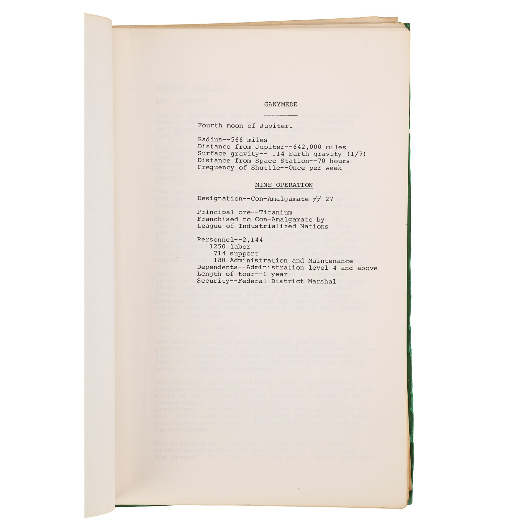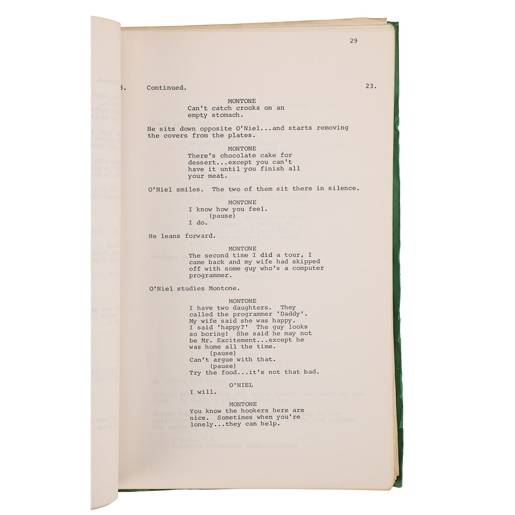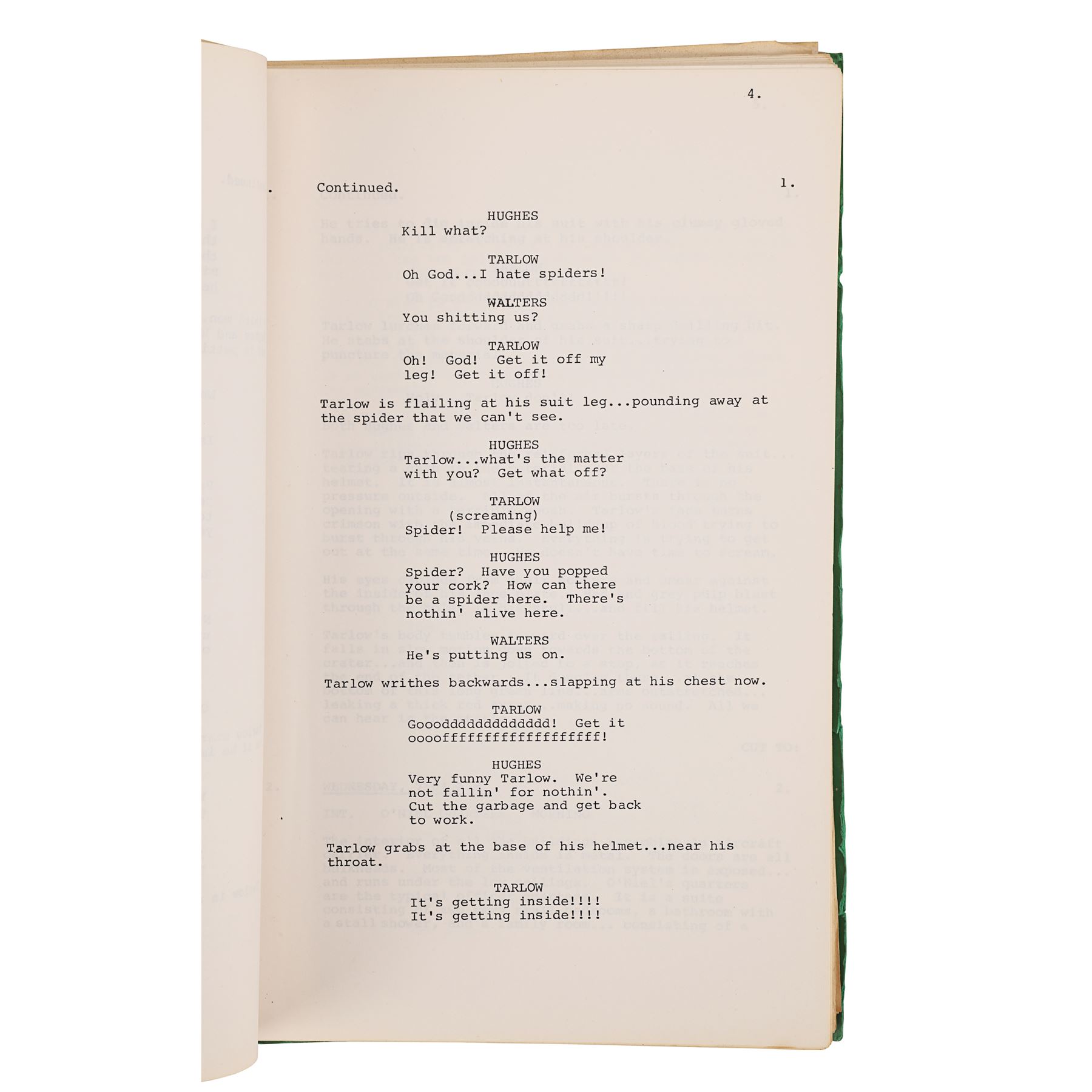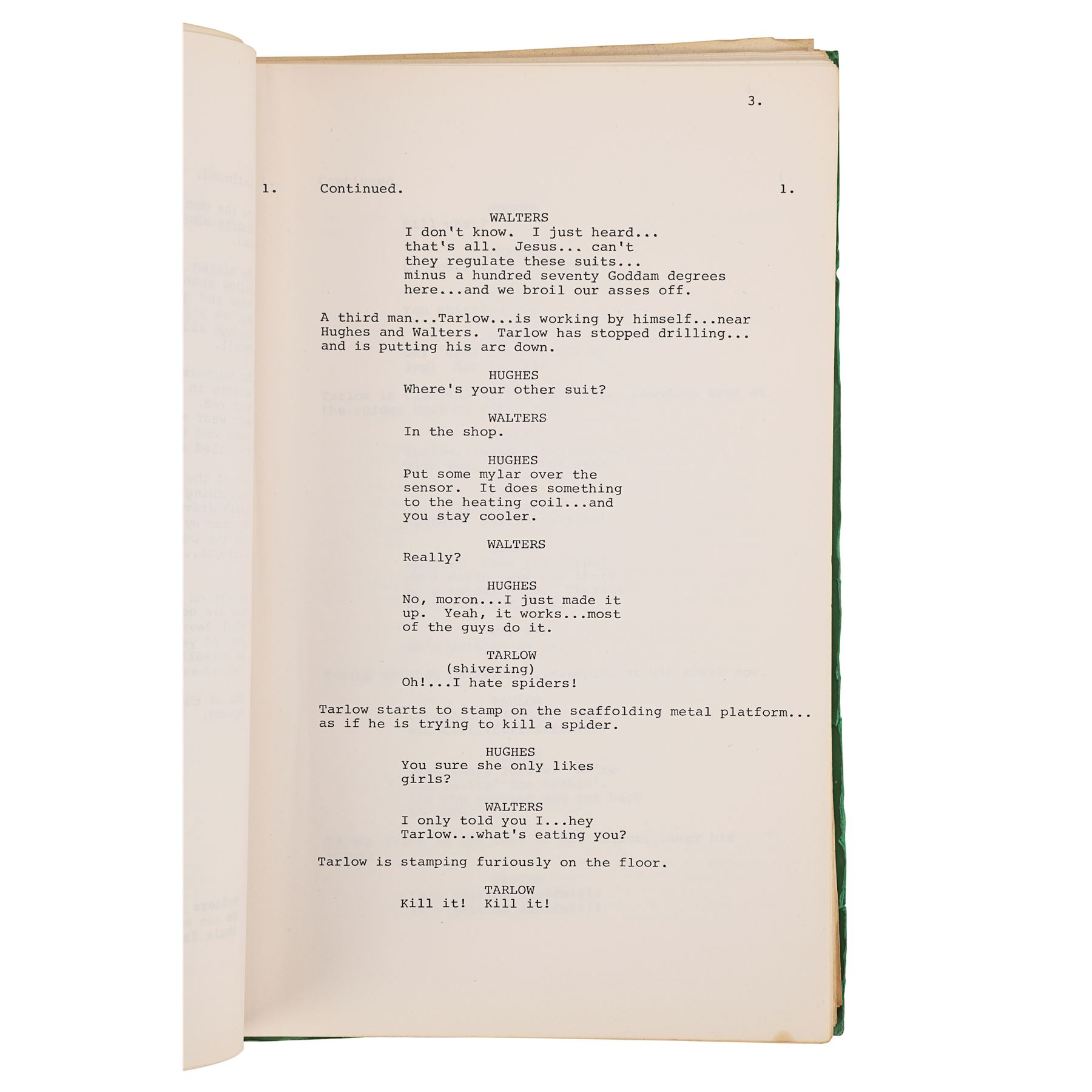 Also included in the lot is a green folder containing two scripts. The first is a full-length script dated "March 17th 1980", printed on white paper, and bound to the folder by metal pins. It comprises 128 pages, including the title page which has "105" handwritten in pen in its top right corner. The second script is a collection of revised scenes printed on 27 pages of unbound pink paper, and is dated "12.5.80". Dimensions (script folder): 31 cm x 21 cm x 7 cm (12" x 8 1/4" x 2 3/4")