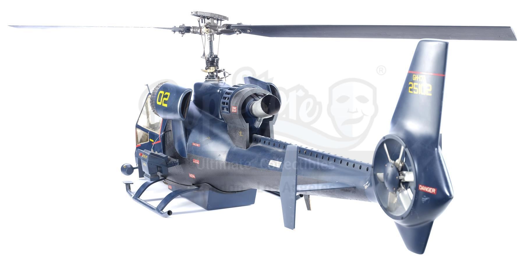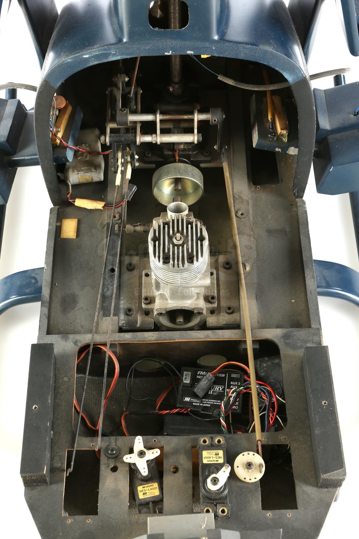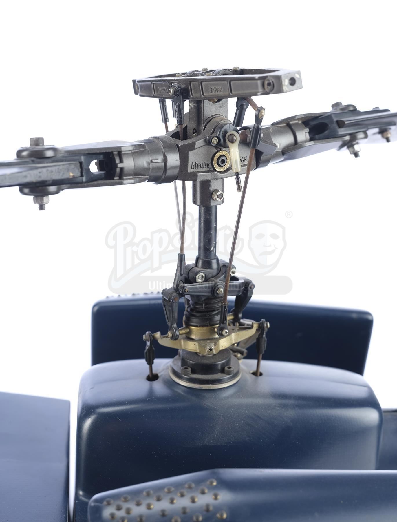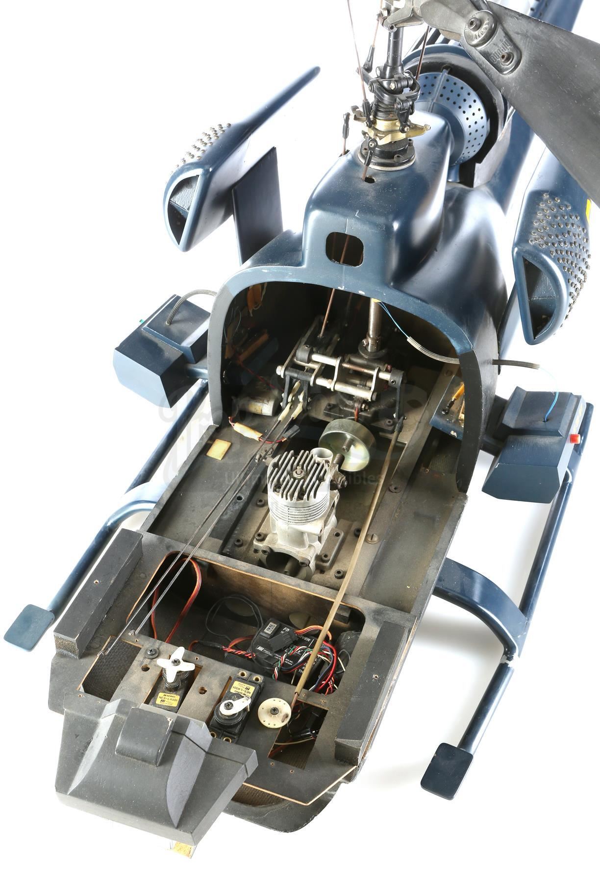 As the visual modifications to the full-scale helicopter weighed it down and restricted movement, 1:6 scale radio-controlled model miniatures were used for action shots of the helicopter, allowing for more advanced aerial stunts like the 360-degree loop in the film's finale. This is one of four such models made and piloted by John Simone Jr. of American RC Helicopters Inc. for the film.