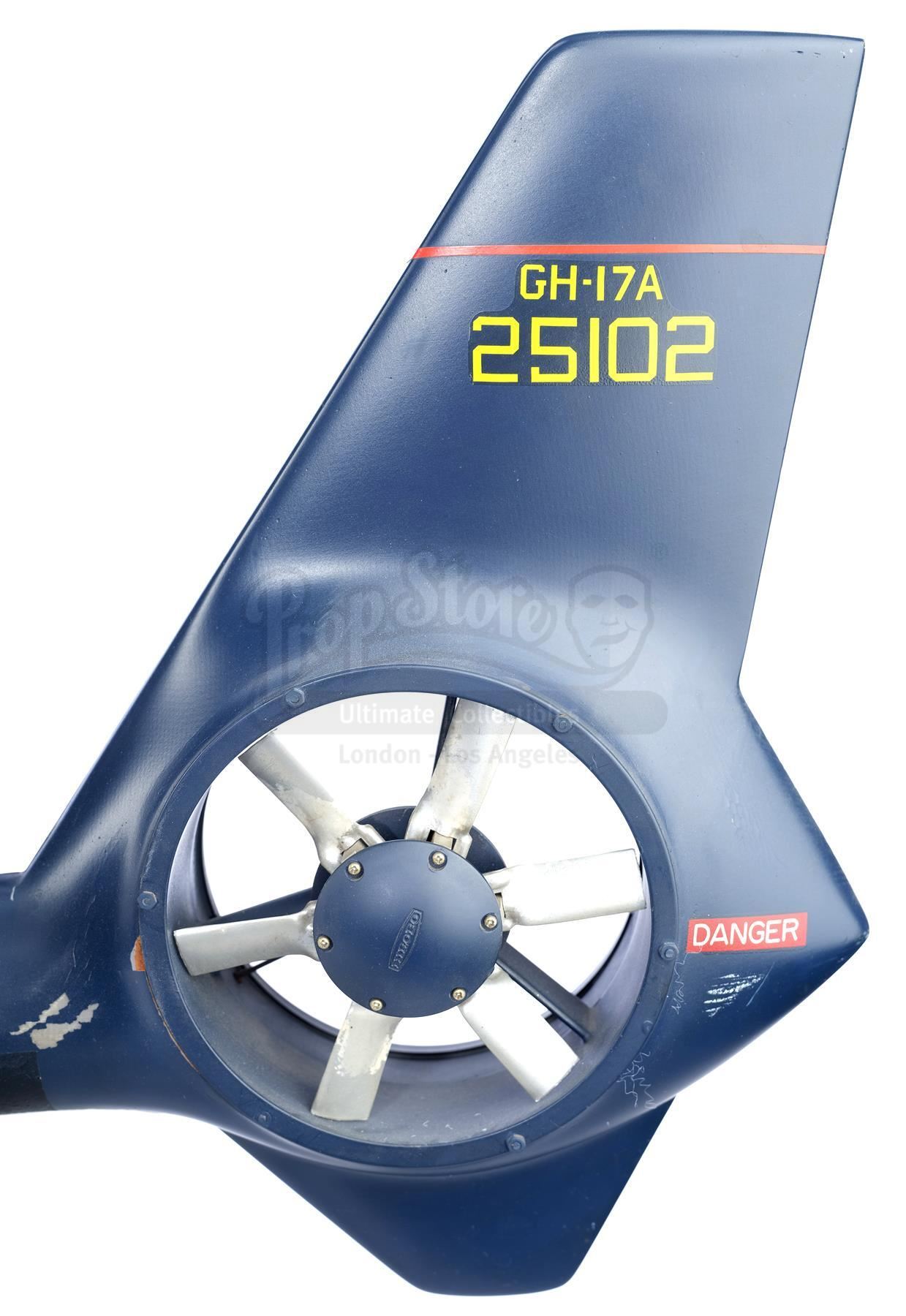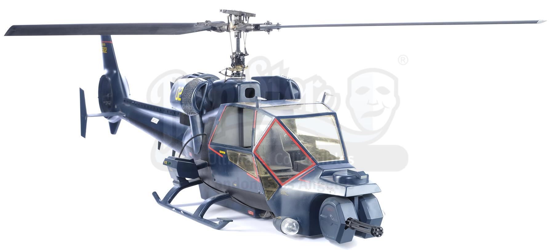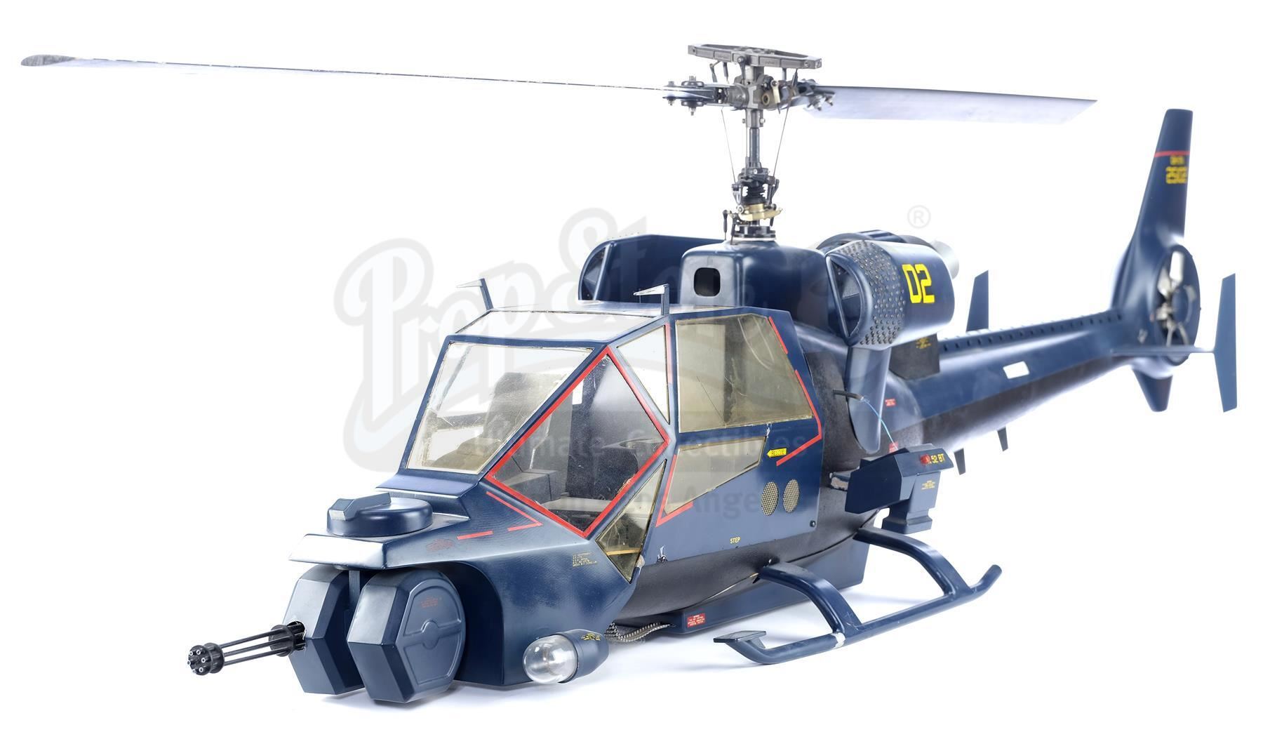 As the visual modifications to the full-scale helicopter weighed it down and restricted movement, 1:6 scale radio-controlled model miniatures were used for action shots of the helicopter, allowing for more advanced aerial stunts like the 360-degree loop in the film's finale. This is one of four such models made and piloted by John Simone Jr. of American RC Helicopters Inc. for the film.