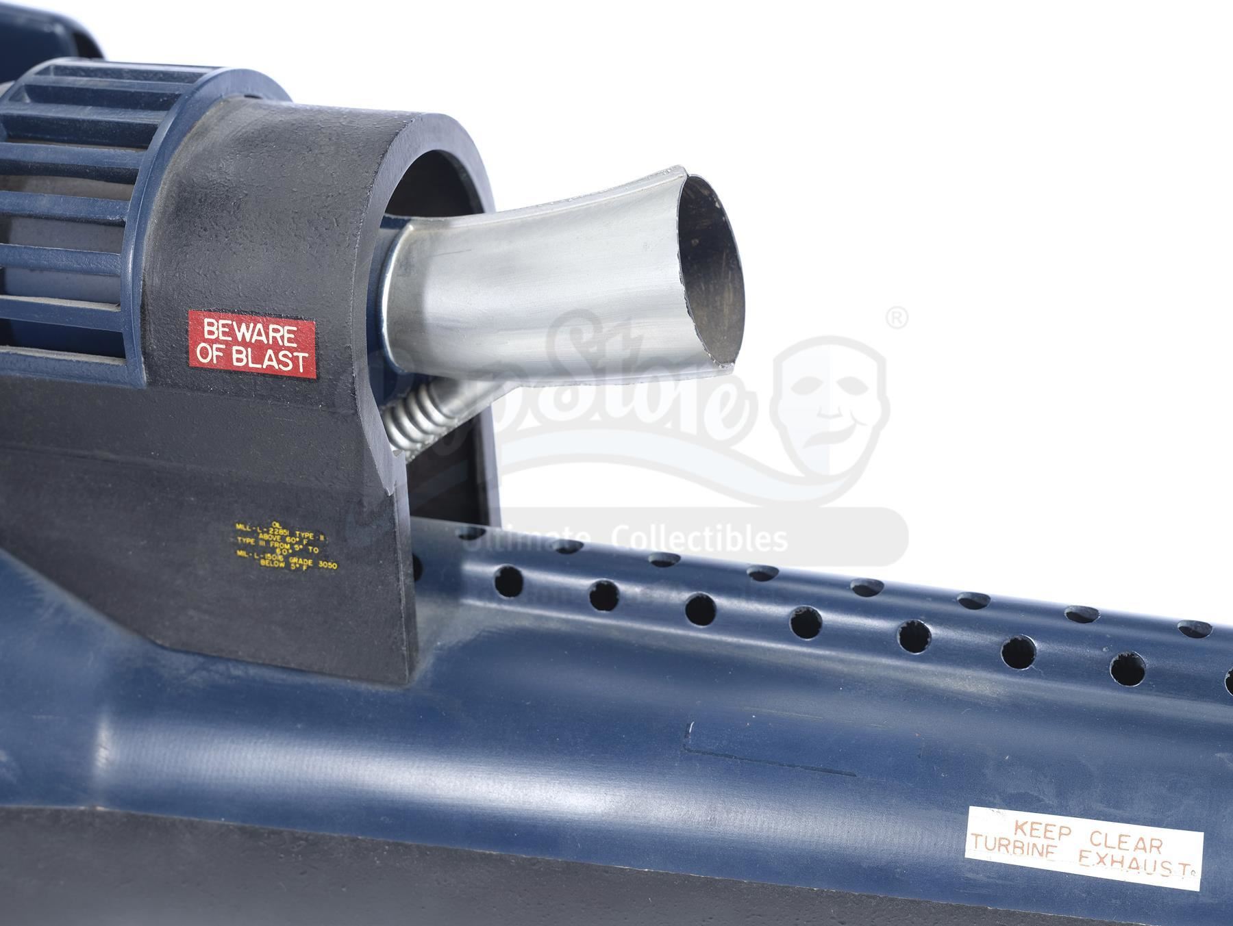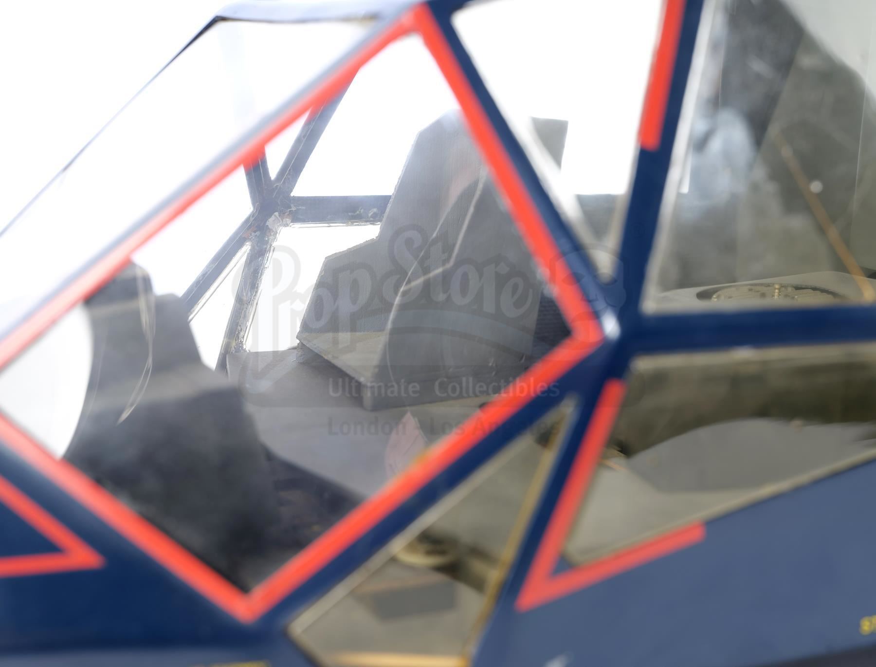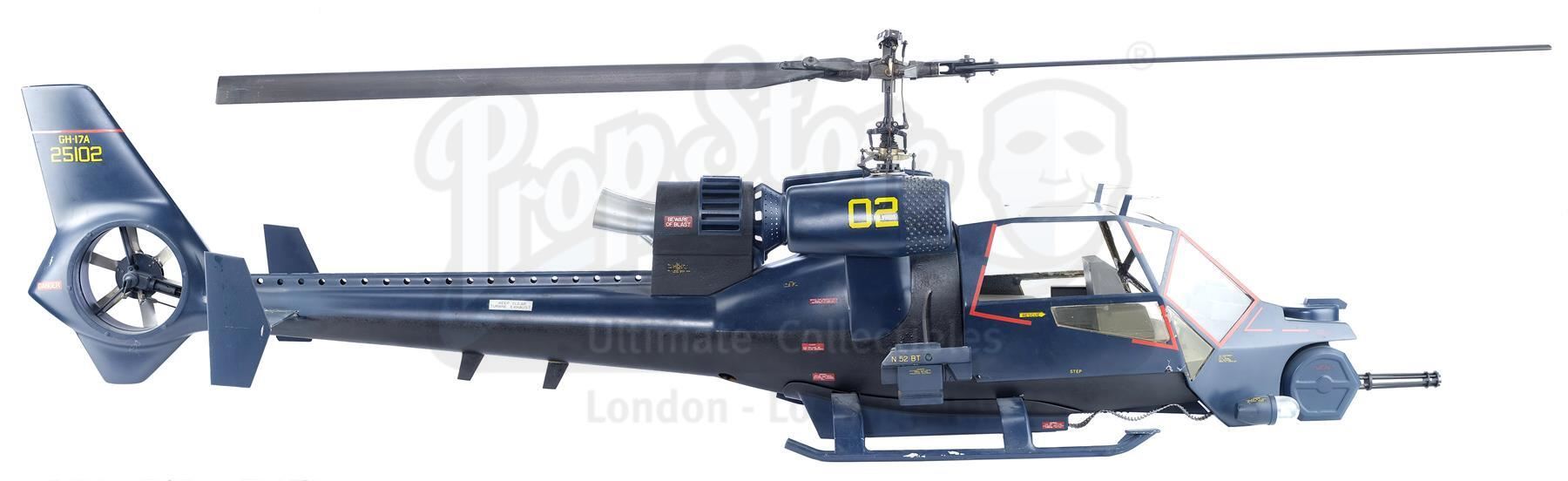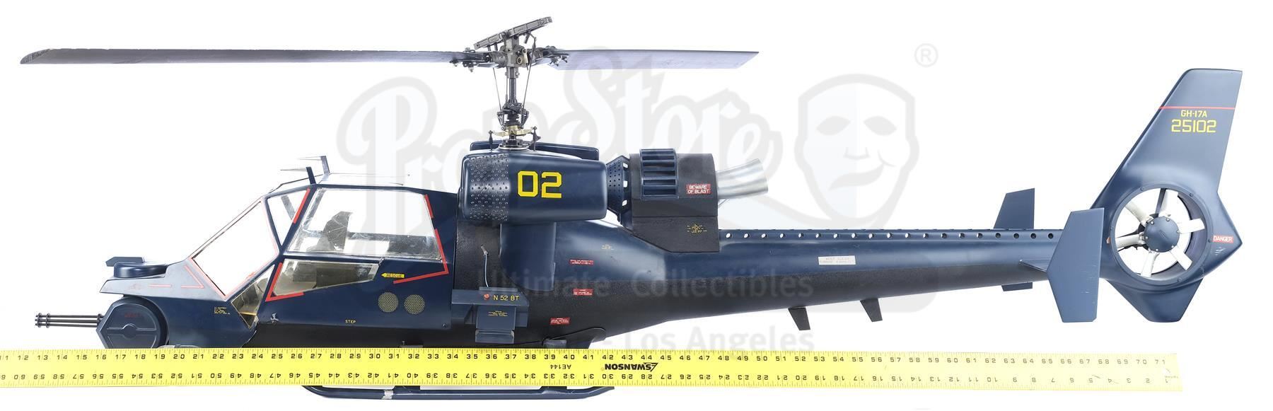 As the visual modifications to the full-scale helicopter weighed it down and restricted movement, 1:6 scale radio-controlled model miniatures were used for action shots of the helicopter, allowing for more advanced aerial stunts like the 360-degree loop in the film's finale. This is one of four such models made and piloted by John Simone Jr. of American RC Helicopters Inc. for the film.