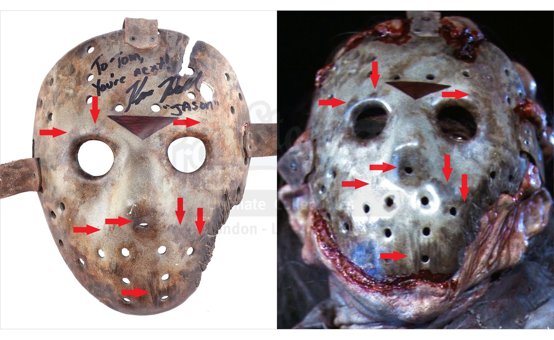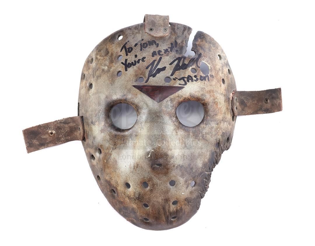 This lot will be auctioned on Tuesday, June 29th. The auction will begin at 9:00am PDT and lots are sold sequentially via live auctioneer; tune in to the live streaming broadcast on auction day to follow the pace. Note other lots in the auction may close on June 30th or July 1st. A screen-matched Jason Voorhees hockey mask signed by Kane Hodder from Adam Marcus' horror sequel Jason Goes to Hell: The Final Friday. Jason's (Hodder) spirit passed his signature mask from body to body before he was dragged to hell by Freddy Krueger (Hodder). This mask screen-matches to the scene in which a SWAT team ambushes and blows up Jason. This version of the iconic Voorhees mask was designed by effects supervisor Howard Berger and manufactured by K.N.B. Effects Group to appear battle-scarred, burnt, water-damaged, and fused to the face of the latest wearer. As such, the mask is extensively aged with grime, scratches, and chips made throughout by production. It is constructed of molded vacuum-formed plastic painted white, gray, and brown with "To Tom, You're Next, "Jason"" signed in black marker by Hodder above a red triangle emblem. Three brown leather straps are screwed into the top and sides. Though intentionally distressed, the mask remains in good overall condition. This lot comes from the collection of renowned special effects artist Tom "Brooklyn" Bellissimo. A letter of authenticity from Bellissimo is included. Estimate: $20,000 - 30,000