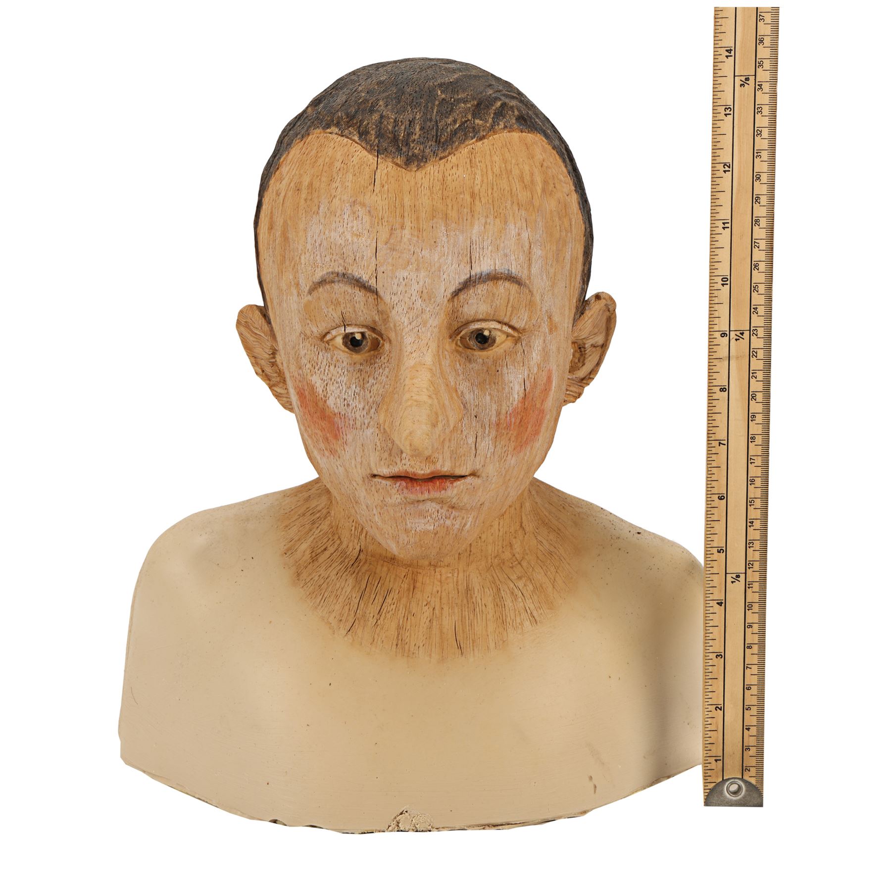 This silicone head is adhered to a biscuit foam bust and features a wood grain and carved texture on the head and neck. It has been hand-painted in a light brown colour, with a darker brown used for the hair and a faint red applied to the cheeks and lips. Dimensions: 23 cm x 33 cm x 36 cm (9" x 13" x 14 1/4")
