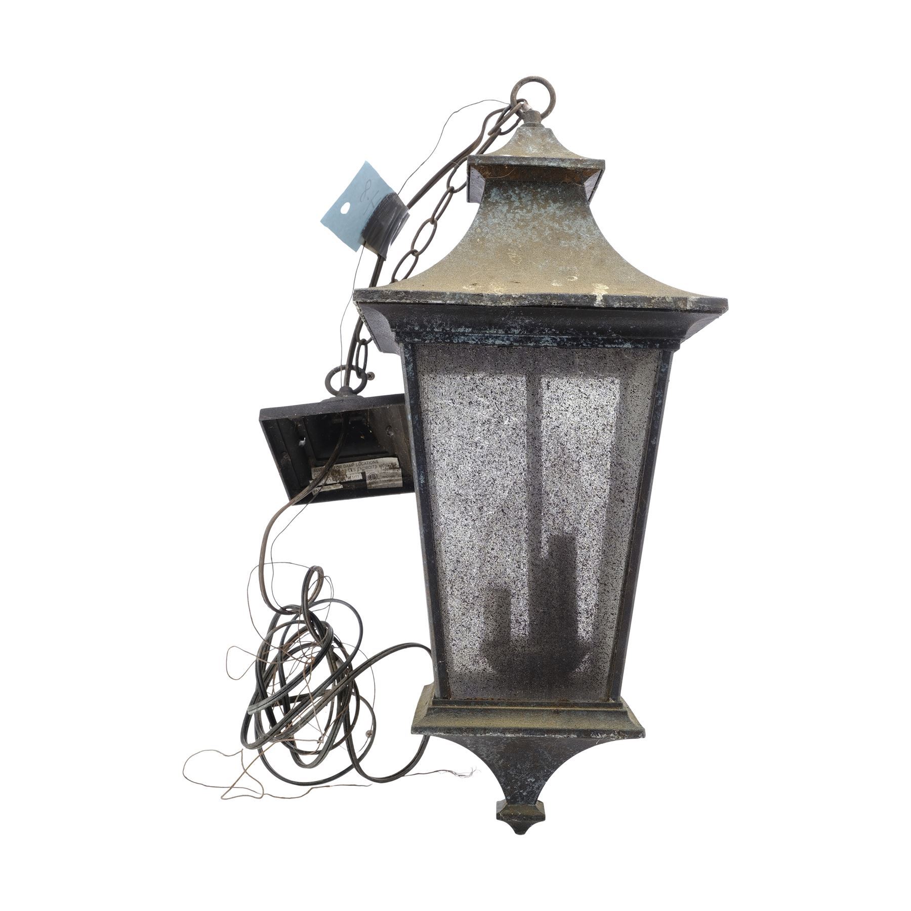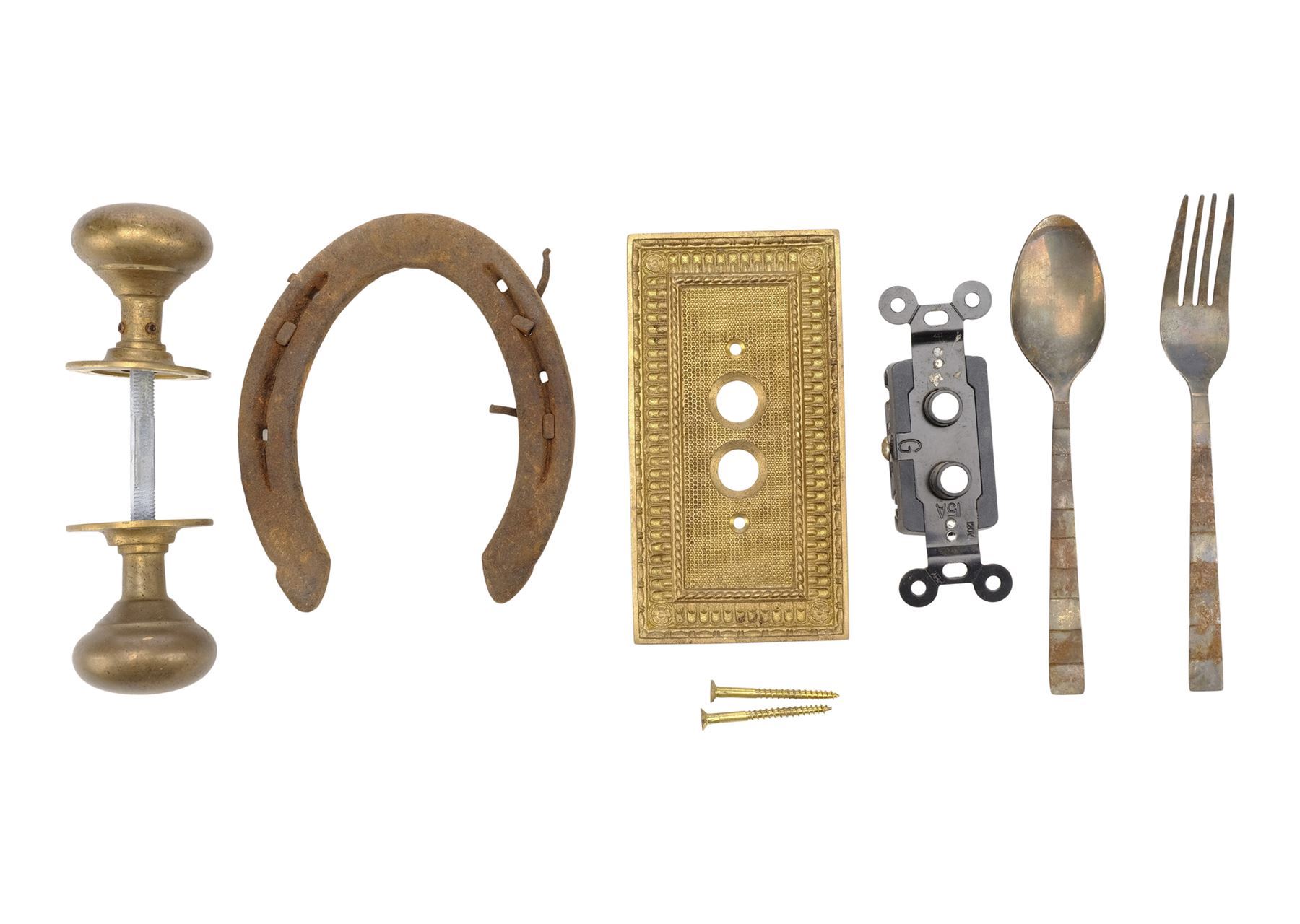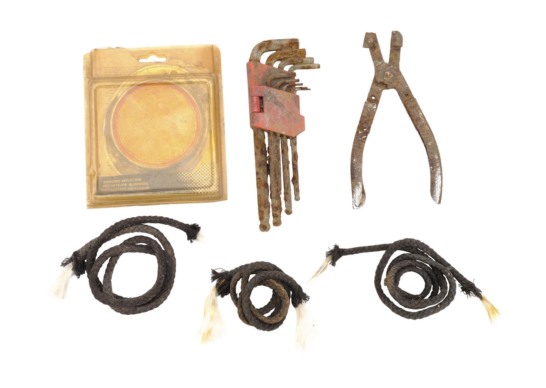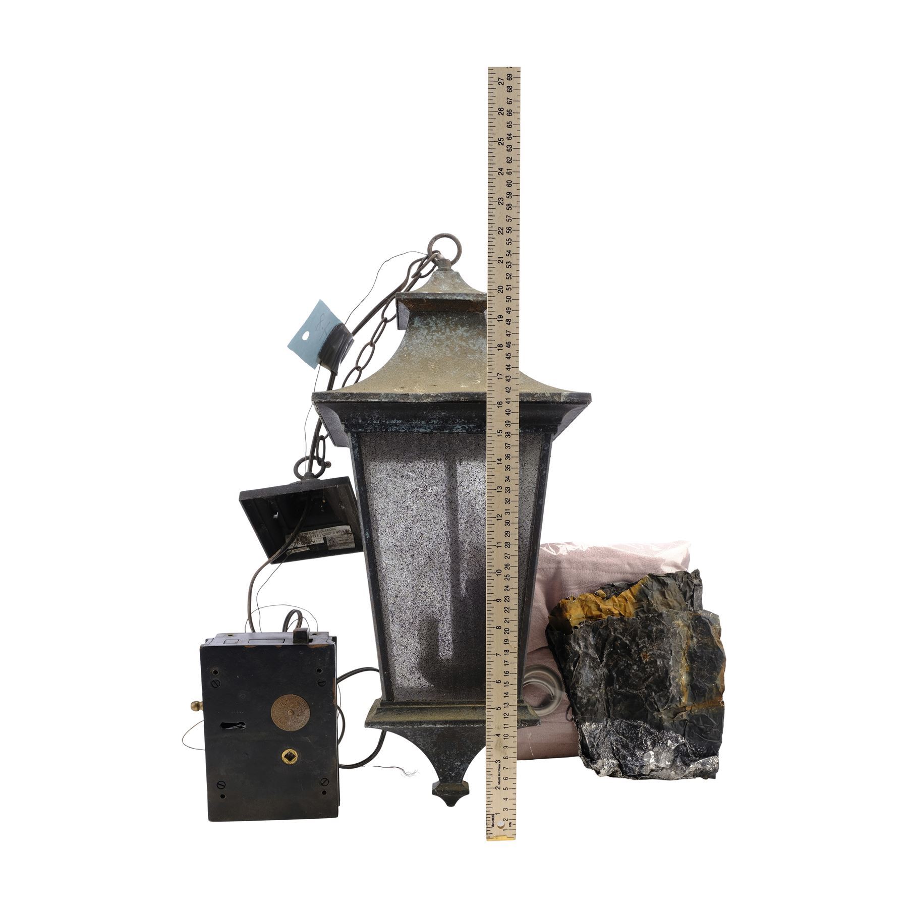 This lot consists of two bricks; a roof shingle; hanging lamp; lightswitch plate with connector; doorknob; lock; rusty horseshoe; rusty spoon and fork; rusty tools; two sets of grommet curtains; twine; and reflective cap. Also included are stones from Glenn Rhee's (Steven Yeun) and Sasha Williams' (Sonequa Martin-Green) graves, as well as a USB card with pictures from set demolition, and five production papers for crew call and designated areas. Production intentionally distressed these items to appear aged. This lot exhibits discoloration. Dimensions: 24" x 16" x 10" (61 cm x 40.5 cm x 25.5 cm)
