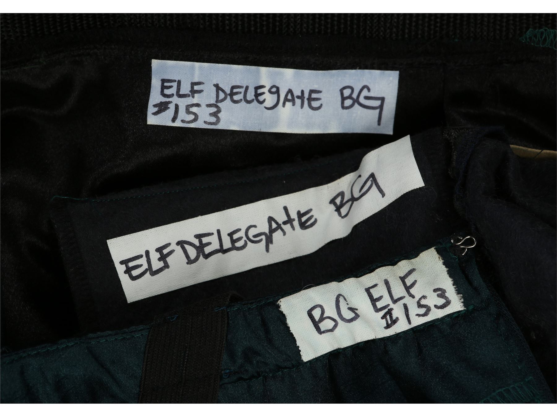 This lot consists of a green polyester shoulder yoke marked "153" by production with gold-color foam detailing and a green resin gem at center; a matching polyester shirt marked "Elf Delegate BG"; a matching polyester overskirt marked "Elf Delegate BG 153"; a matching underskirt marked "Timothy Knight"; matching trousers; two gold-color leather vambraces labeled "Elf 2" and "153"; two matching metal armbands; and two matching leather boots (U.S. men's size 11.5) with spats marked "Greenfire 153." The foam exhibits cracking and the gold-color components exhibit green discoloration from age.