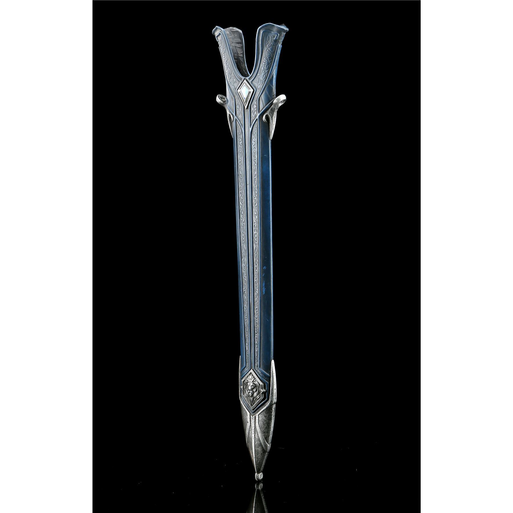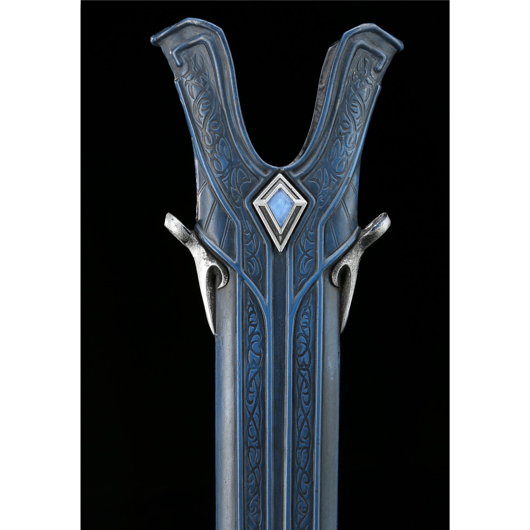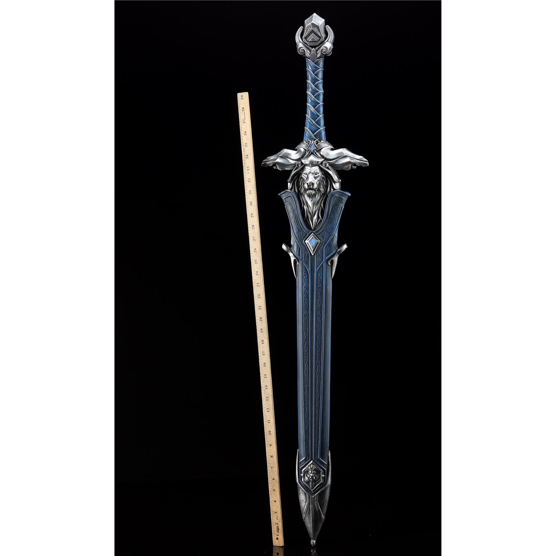 This lot consists of a dense urethane sword painted silver-color to resemble a metallic shine with carved designs along the blade; a dark gray painted lion sculpted handguard with a blue acrylic faux sapphire and a matching dark gray painted sculpted pommel; a navy-painted handle sculpted and textured to resemble leather accents; a blue dense urethane sheath with designs carved along the shaft, a silver-color painted tip and embellishments to resemble a metallic shine and a light blue acrylic faux sapphire. This lot exhibits minor scuffs and discoloration from production use. Dimensions: (sword) 46" x 10" x 5" (117 cm x 25.5 cm x 12.75 cm); (sheath) 30" x 10" x 5" (76.25 cm x 25.5 cm x 12.75 cm)
