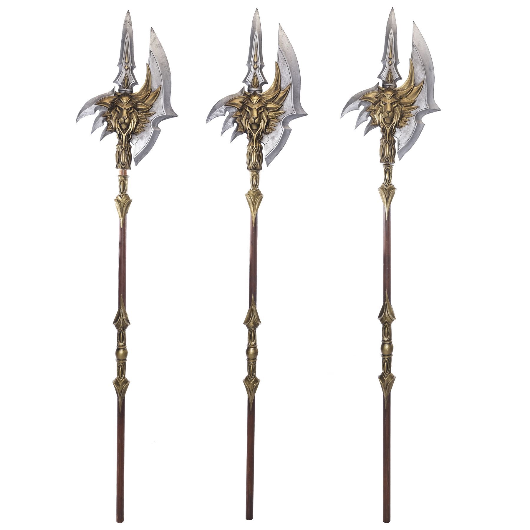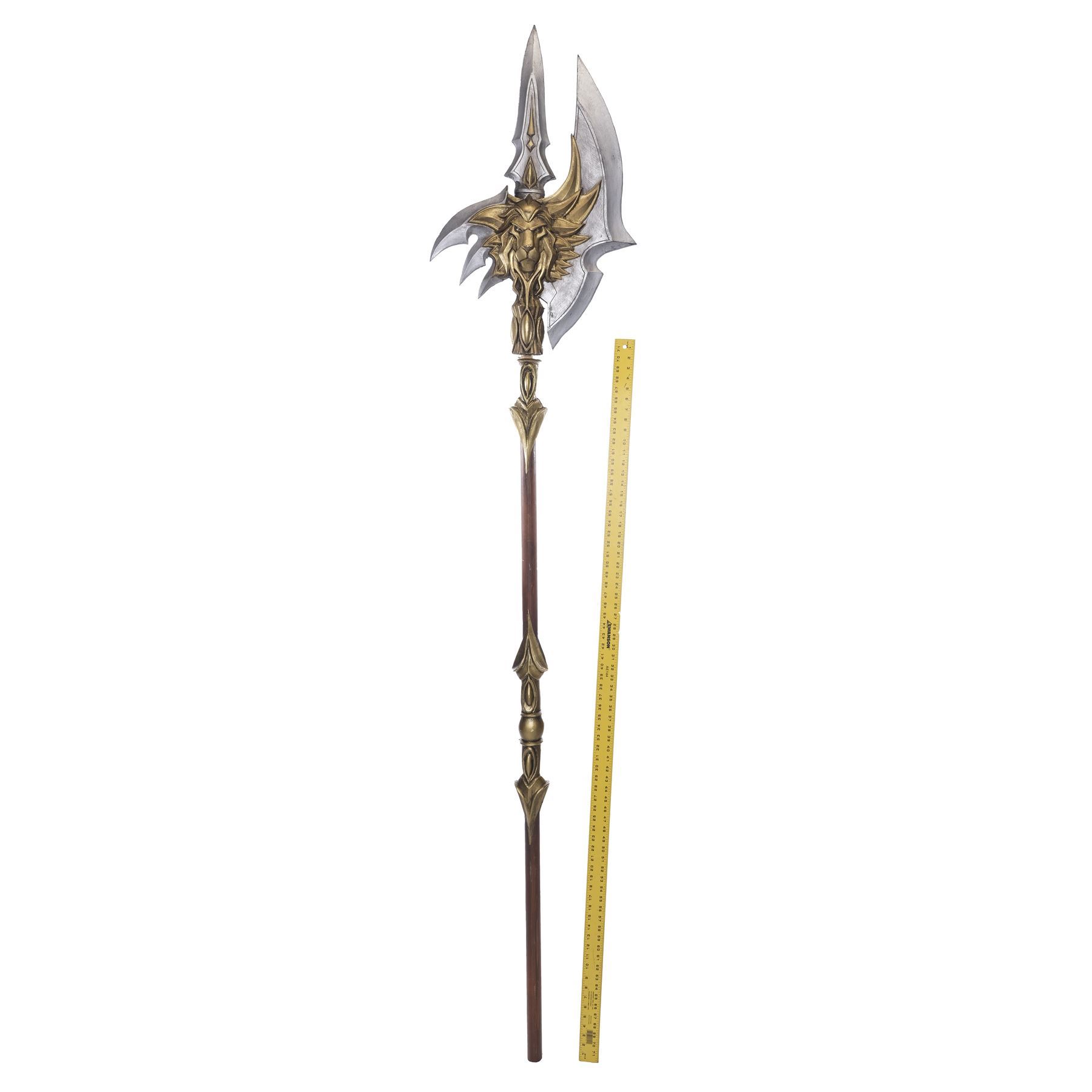 Each of these halberds features a wooden staff mounted on top with a dense urethane blade hand-painted in the Alliance's signature silver-color and blue and engraved on both sides with gold-color Stormwind lion emblems. The set exhibits some paint flaking and cracking to the blades from age and production use. Dimensions (each): 97" x 20" x 9" (246.5 cm x 51 cm x 23 cm)