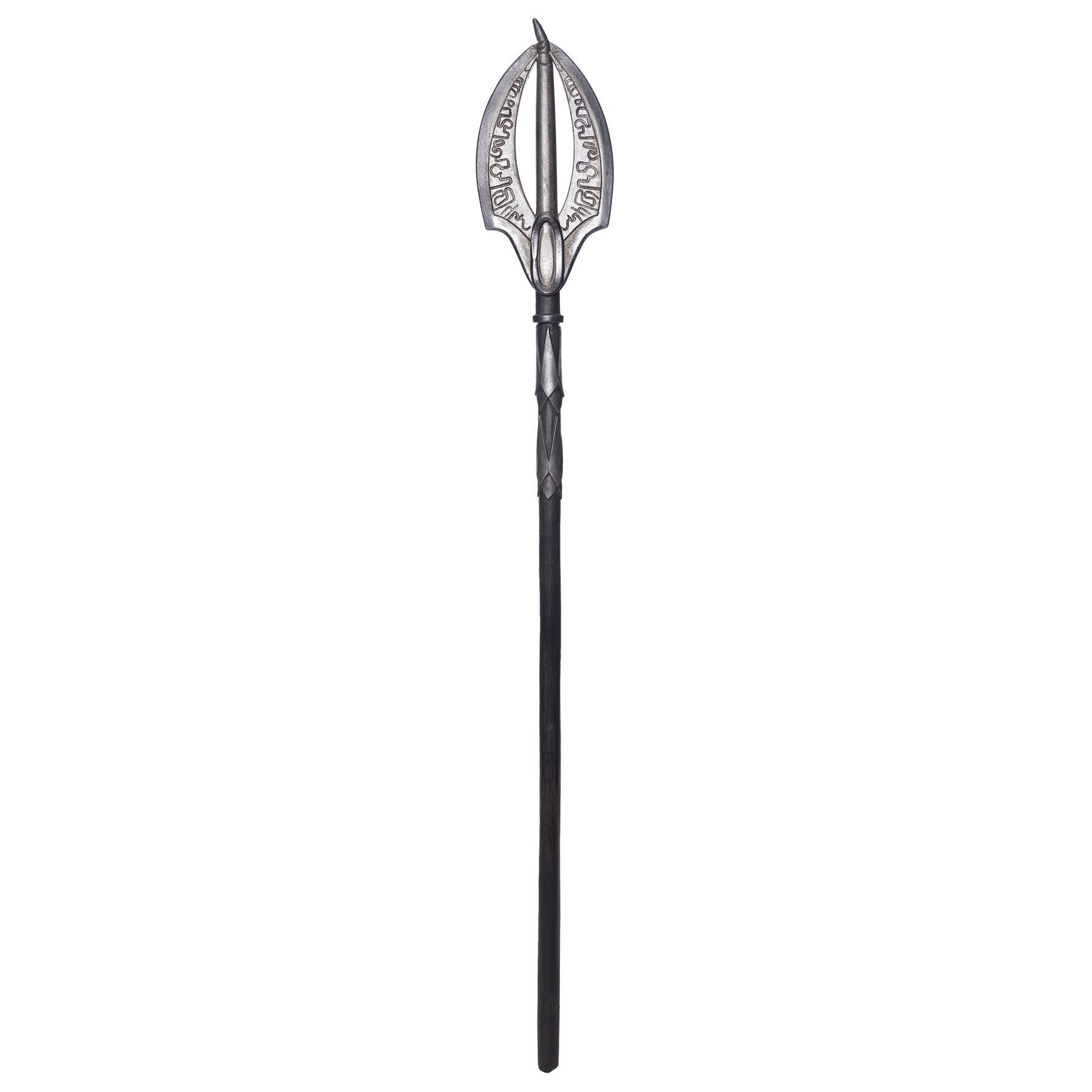 This foam staff features a spike engraved with Elven runes, painted steel-color, and mounted to a faux wooden staff painted black. The spike exhibits cracking paint, exposing the foam, and bending to its points from production use. Dimensions: 76" x 9" x 2" (193 cm x 23 cm x 5 cm)