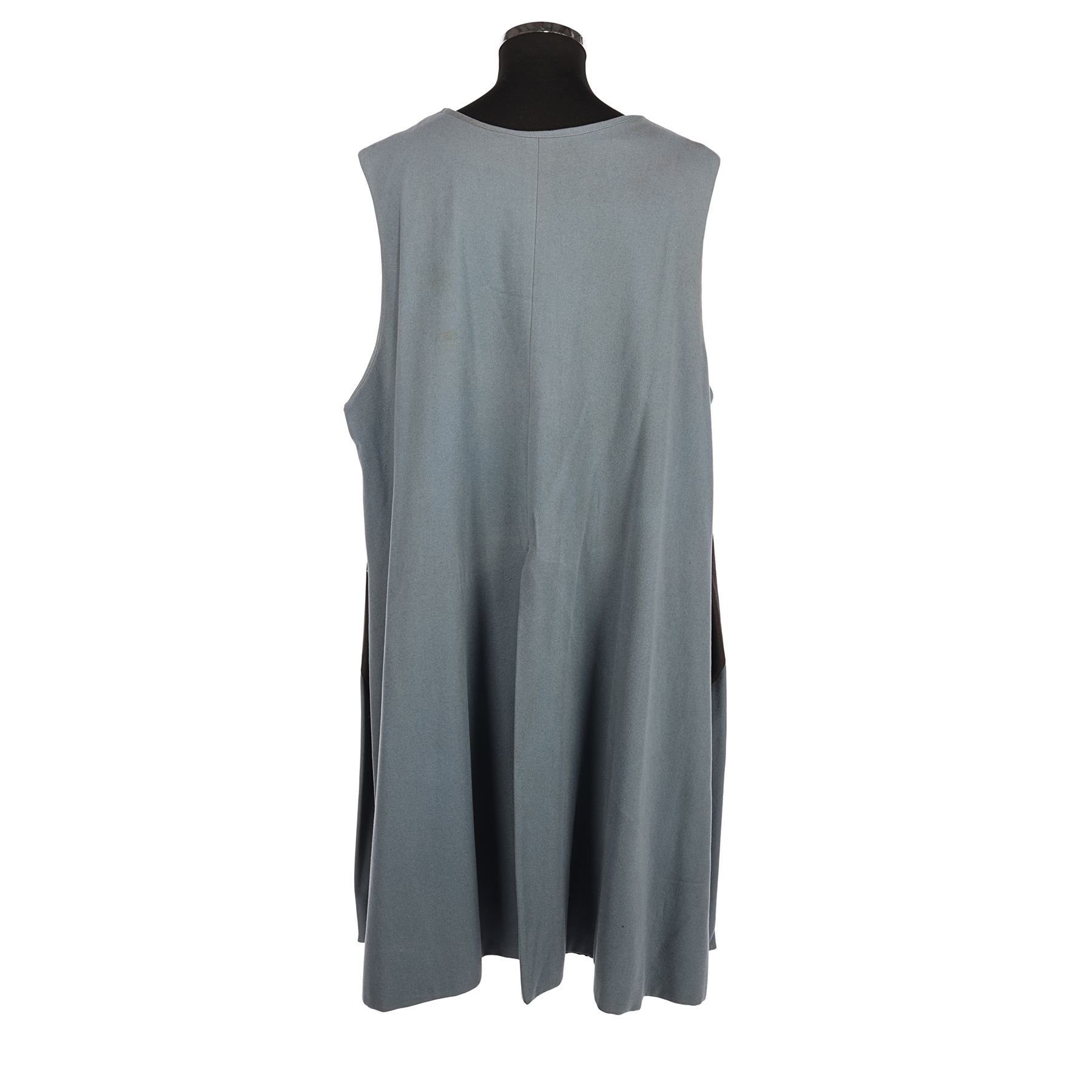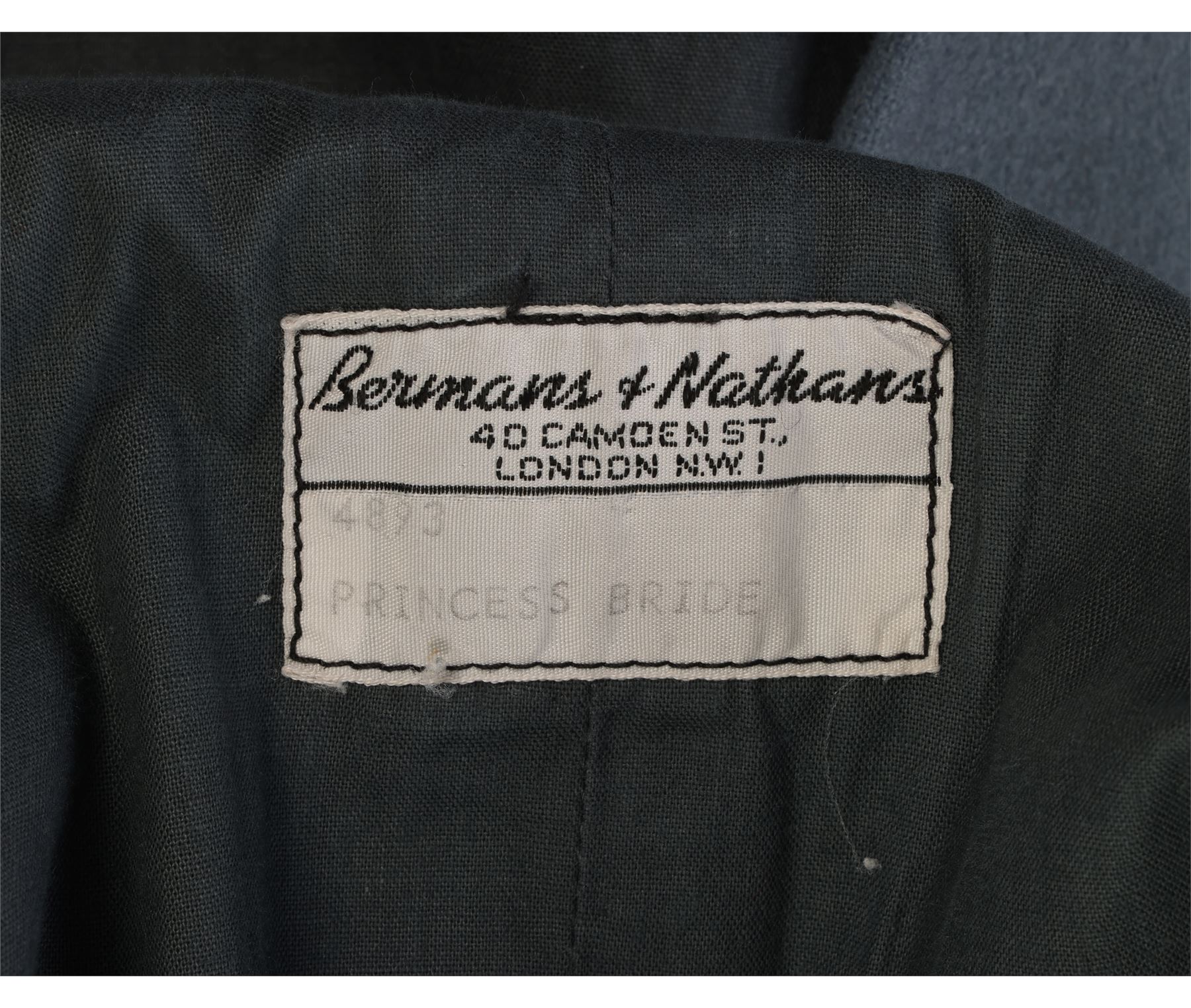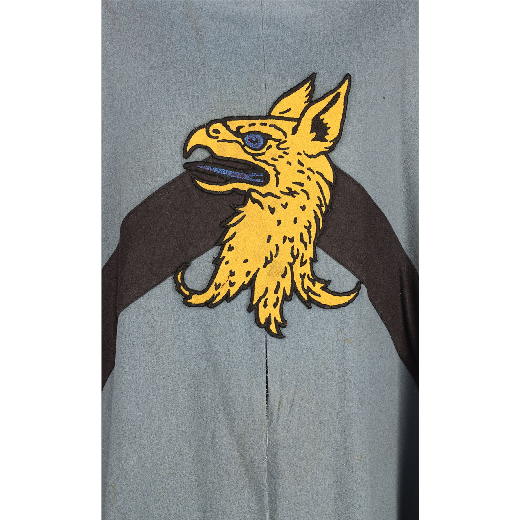 Made from blue felt and lined with grey cotton, the front of the tabard features a black diagonal stripe and a large, yellow griffin emblem. The sides are laced up with brown cord and a Bermans & Nathans costumiers label is sewn into the lining, which reads "4893, Princess Bride". The tabard displays wear, with staining on the front and some stitching has come loose at the bottom of the front seam.