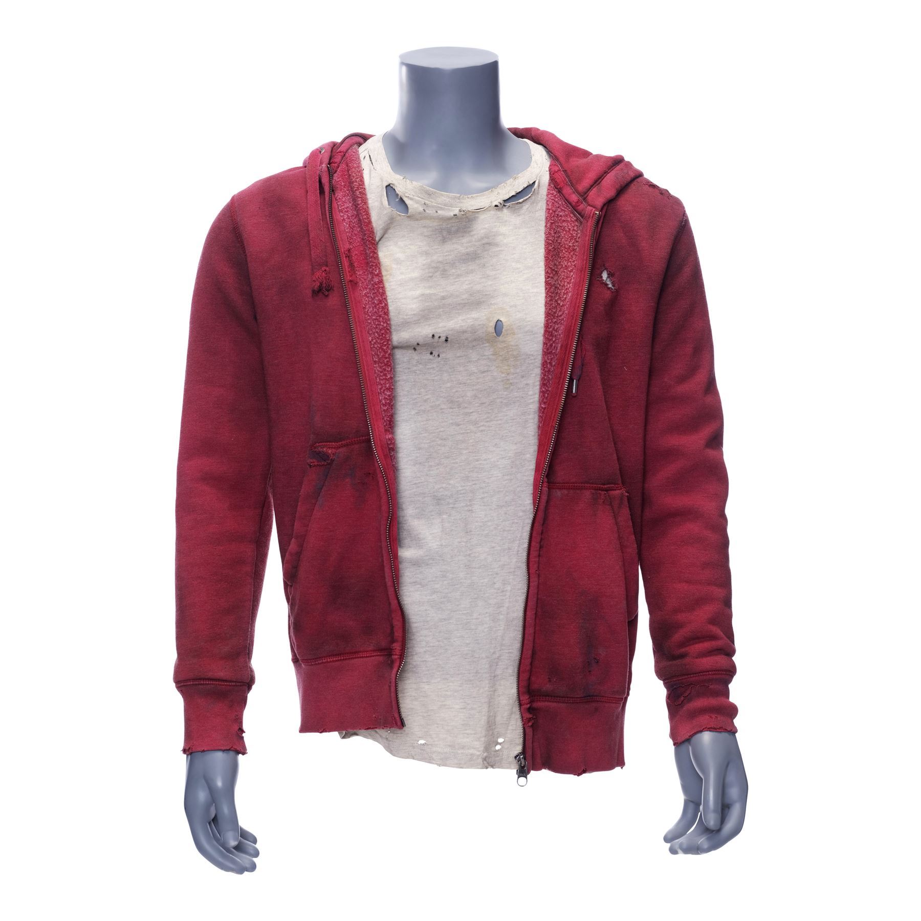 This lot consists of a red cotton hoodie hand-marked "After Wash and Squibb" on the inner label, and an off-white cotton T-shirt hand-marked "stunt 2" on the collar's interior. Production distressed these components with holes, tears, and grime to appear post-apocalyptic. This lot exhibits fragility on the shirt collar and the hoodie's drawstrings.