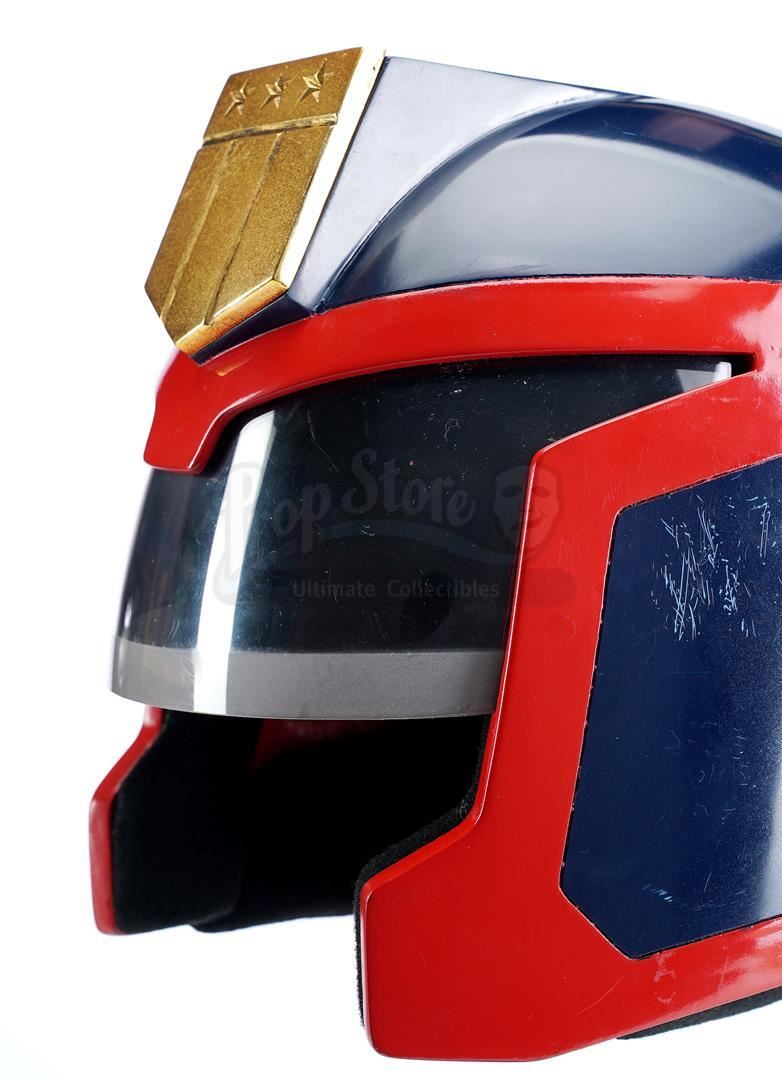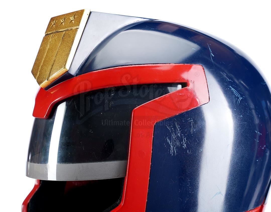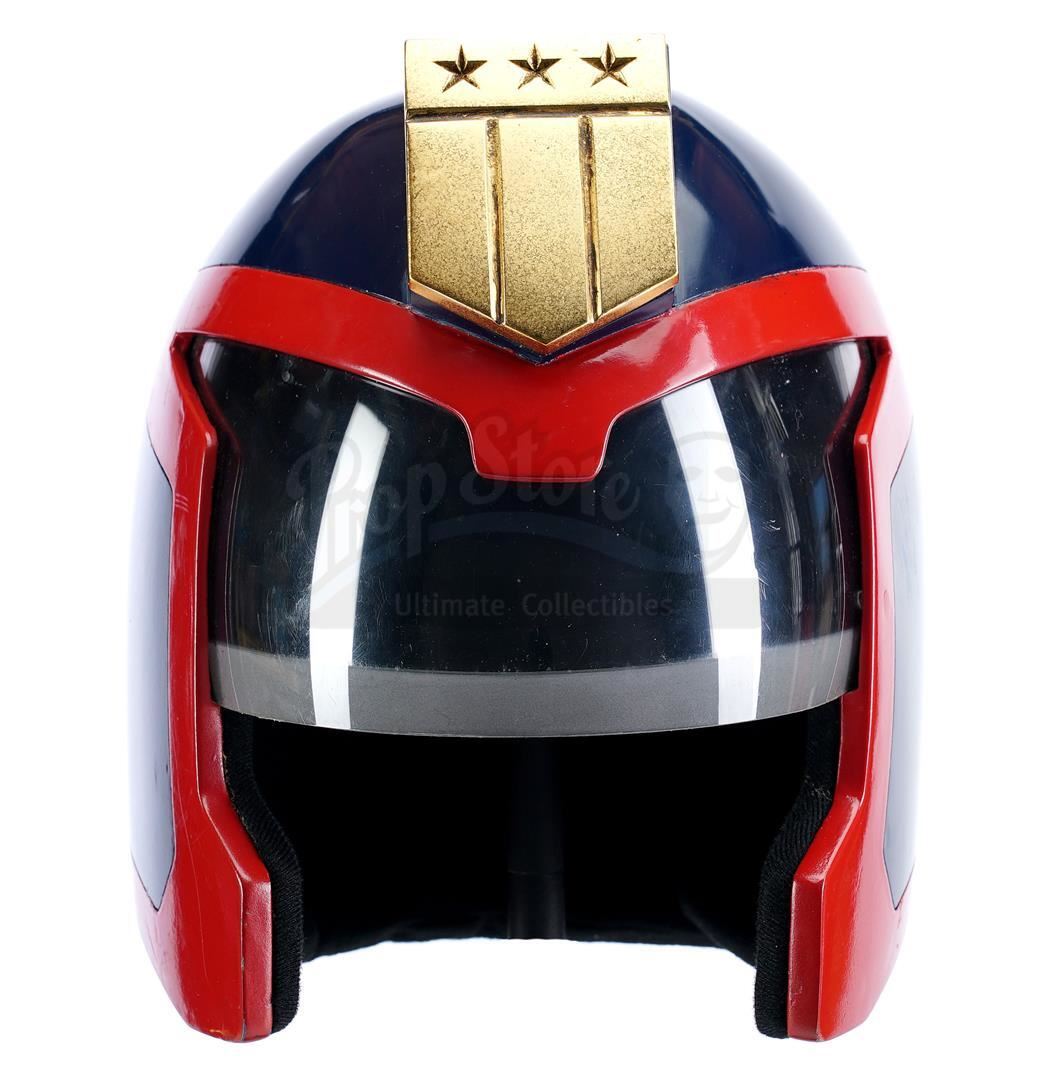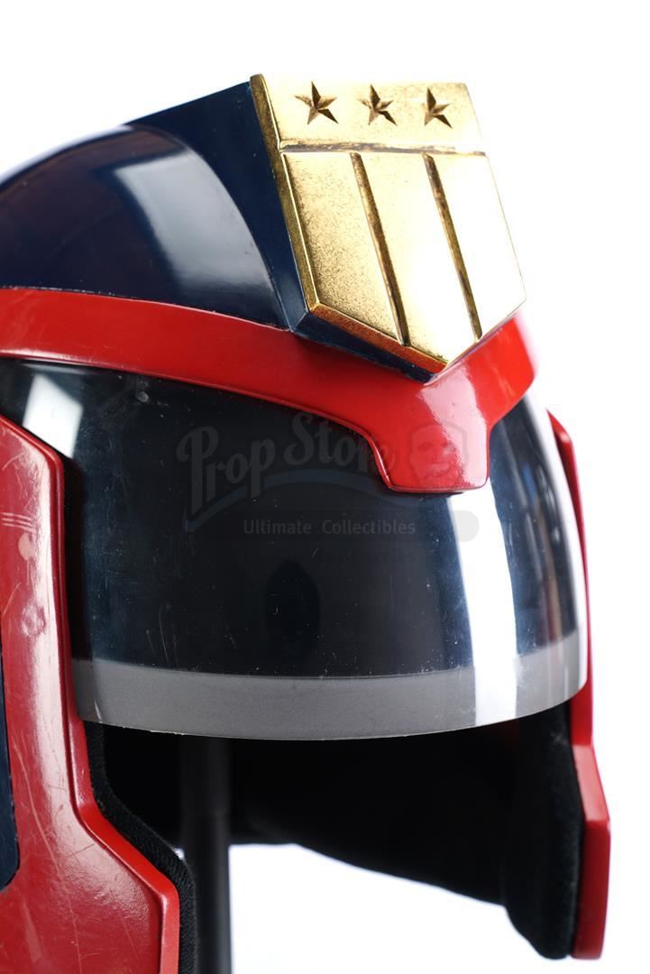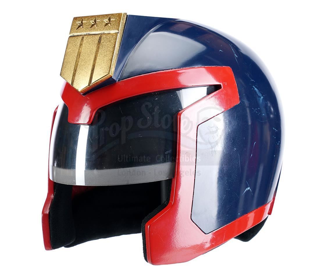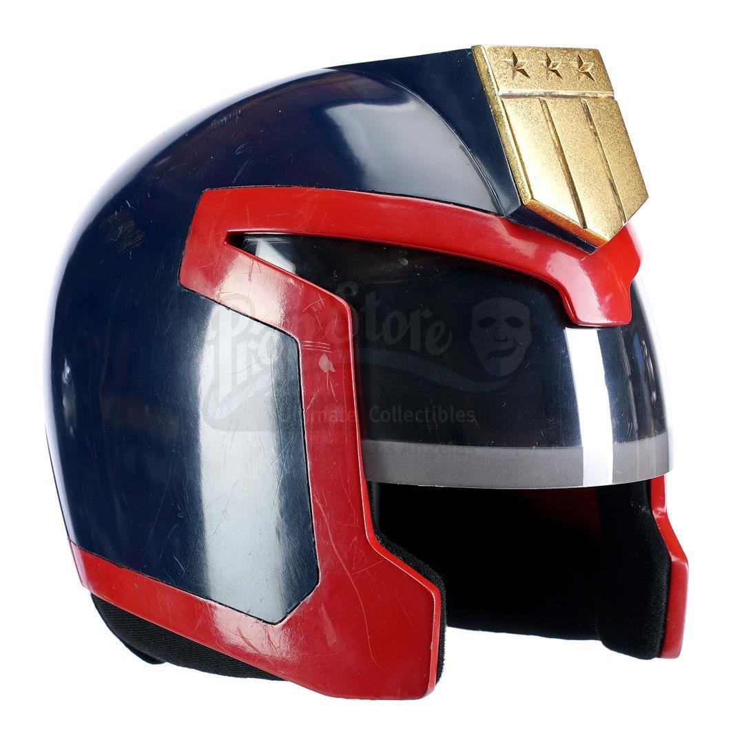 This lot will be auctioned on Tuesday, June 29th. The auction will begin at 9:00am PDT and lots are sold sequentially via live auctioneer; tune in to the live streaming broadcast on auction day to follow the pace. Note other lots in the auction may close on June 30th or July 1st. A Judge Hershey stunt helmet from Danny Cannon's comic book adaptation film Judge Dredd. Hershey (Diane Lane) wore her helmet as a member of an elite group of law enforcers known as Judges who operated as the judge, jury, and executioners of potential criminals in Mega-City One. The foam-padded navy, red, and gold-color fiberglass Judge helmet features an MBA Ltd. label marked "Judge Hershey Stunt Double 06020" and a tinted plastic visor. It is in excellent overall condition with minimal wear from production and age, including some scuffing. Dimensions: 12" x 6.5" x 9" (30.5 cm x 16.75 cm x 23 cm) Estimate: $2,000 - 3,000