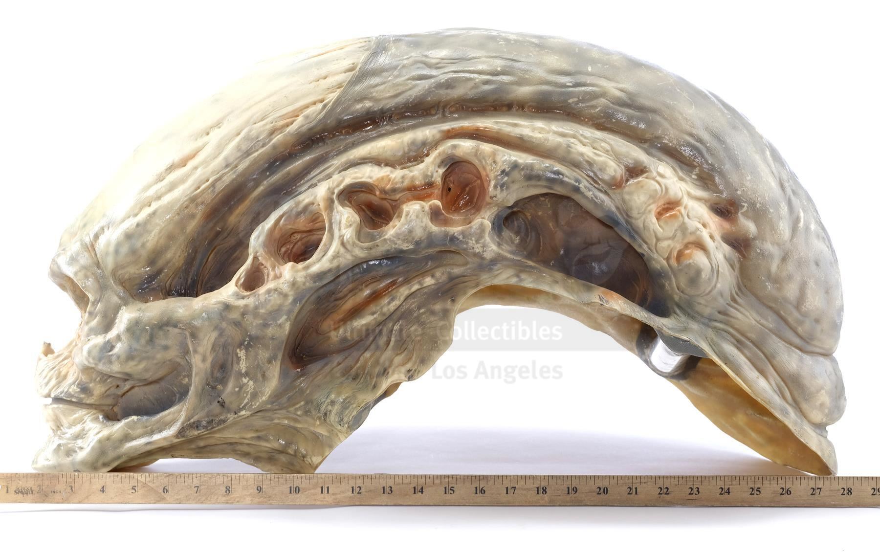 This lot will be auctioned on Tuesday, June 29th. The auction will begin at 9:00am PDT and lots are sold sequentially via live auctioneer; tune in to the live streaming broadcast on auction day to follow the pace. Note other lots in the auction may close on June 30th or July 1st. A Newborn hybrid stand-in head from Jean-Pierre Jeunet's sci-fi sequel Alien: Resurrection. The Newborn, a mutated human-xenomorph hybrid accidentally created by Dr. Wren (J.E. Freeman), killed its birth mother, and was later killed by its adopted mother, Ripley 8, a clone of Ellen Ripley (Sigourney Weaver) created in the same experiments. Created for shot blocking purposes, this fiberglass head is painted a sickly off-white with shades of blue-gray and pinkish-red details. It exhibits light paint rub and wear across much of its surface from storage and use, but remains in good overall condition. Dimensions: 27" x 10.25" x 16.25" (69 cm x 26 cm x 41 cm) Estimate: $3,000 - 5,000