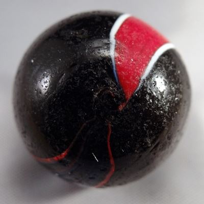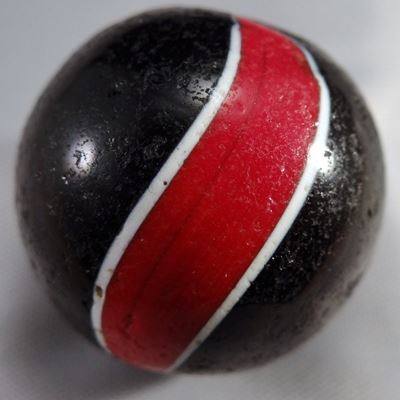 Nice shooter Indian. Opaque black base. Two outer bands covering about thirty percent of the surface. One is red edged by white. Other is blue edged by red. Overall light pitting. Germany, circa 1860-1920. 27/32". Near Mint(-) (8.2).
