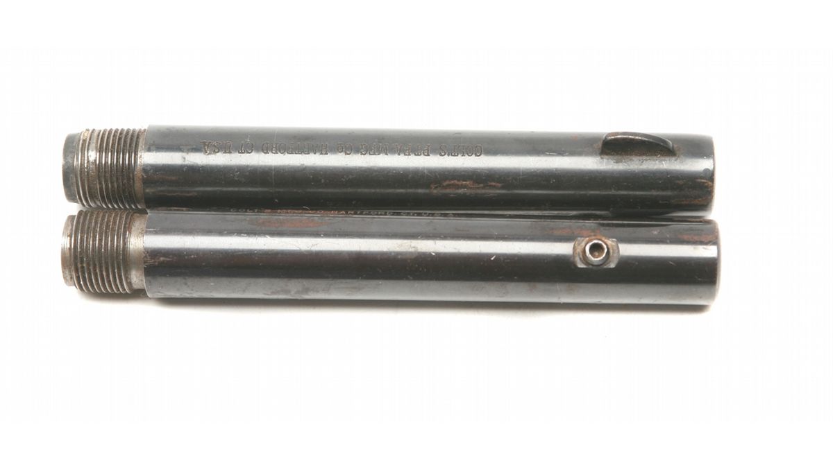 Two asst'd 5.5" used Colt SA 1873 barrels - one each in 357 Mag & 38 Spl - both with 90%+ remaining blue - some slight surface rust on bottoms - good bores - 357 barrel has slight cross threading at beginning - both with single barrel address "COLT'S PT.F.A. MFG. CO. HARTFORD. CT. USA" - non-ffl - 25VVFKIL126