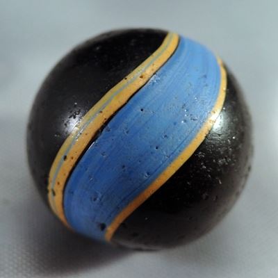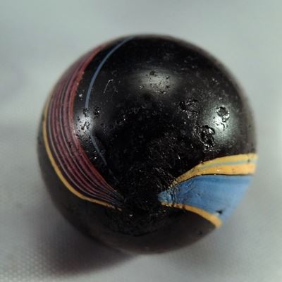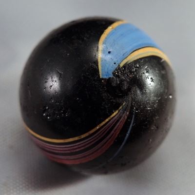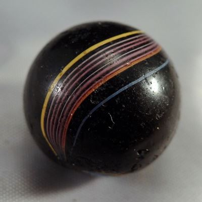 Opaque black base. Two bands covering about thirty percent of th surface. One is pink on white strands, edged by yellow. Other is blue edged by yellow. Pretty. Some pitting. Germany, circa 1860-1920. 21/32". Near Mint(+) (8.7).
