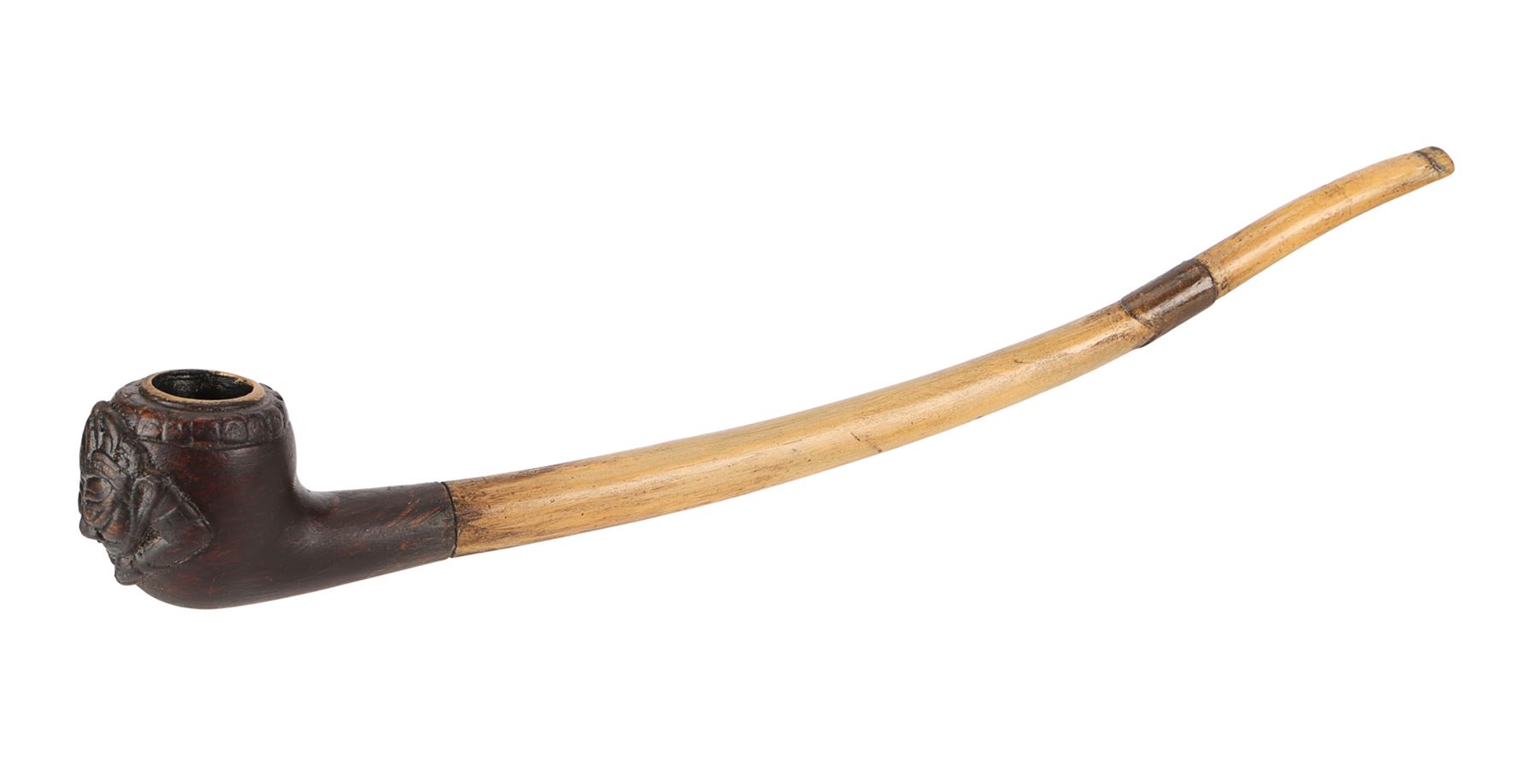 Sherlock Holmes' (Robert Downey Jr) disguise pipe from Guy Ritchie's adventure sequel Sherlock Holmes: A Game of Shadows. Sherlock held his pipe while pursuing Irene Adler (Rachel McAdams) in disguise. The pipe is made of resin painted to look like wood and metal, and its bowl is decorated with a face. There is some minor wear to the face. Dimensions: 41.5 cm x 4 cm x 6 cm (16 1/4" x 1 1/2" x 2 1/4")