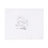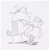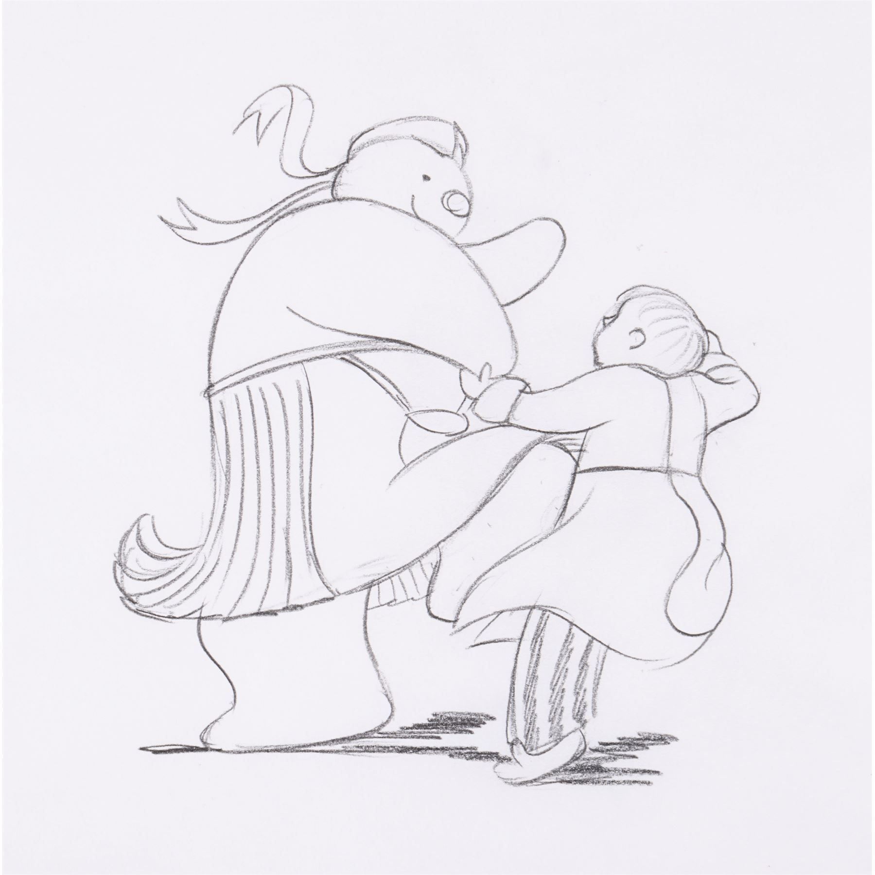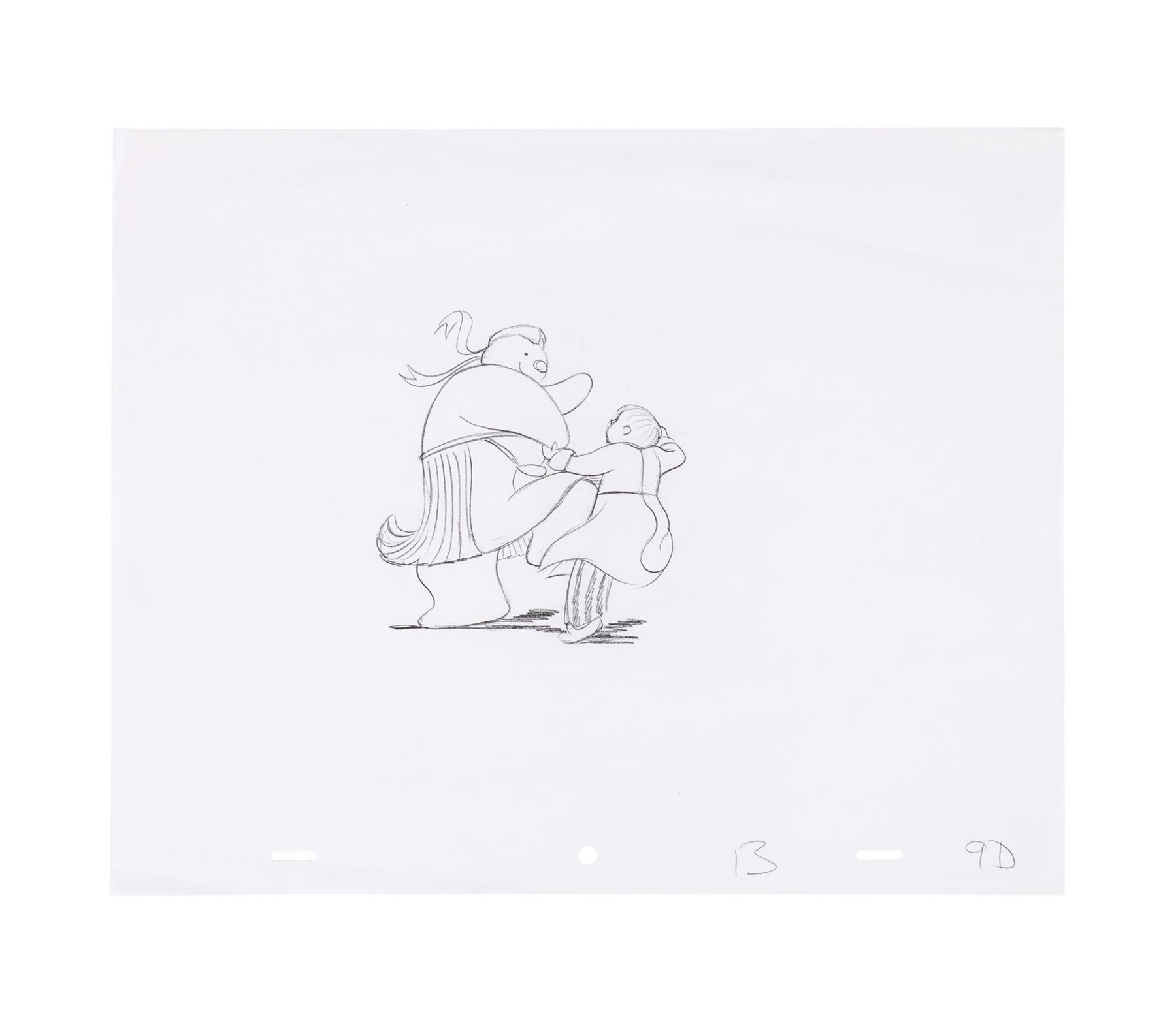 Rendered in gouache on acetate and marked "12/8 37", the cel depicts a poignant moment from the end of the film where James and the Snowman hug goodbye. The accompanying preliminary sketch is rendered in pencil on paper, marked "13 9D" and depicts the Scottish Snowman, dressed in a kilt and bonnet, mid dance with James. Dimensions (each): 33 cm x 27 cm (13" x 10 1/2")