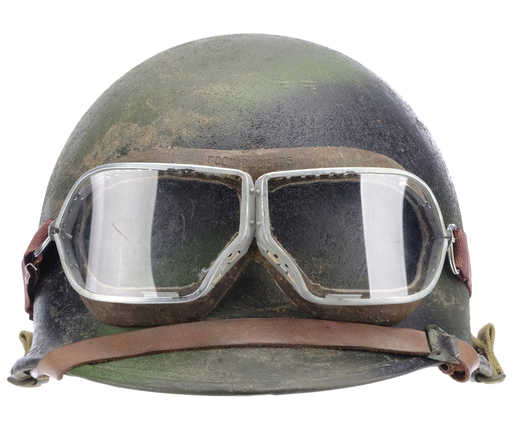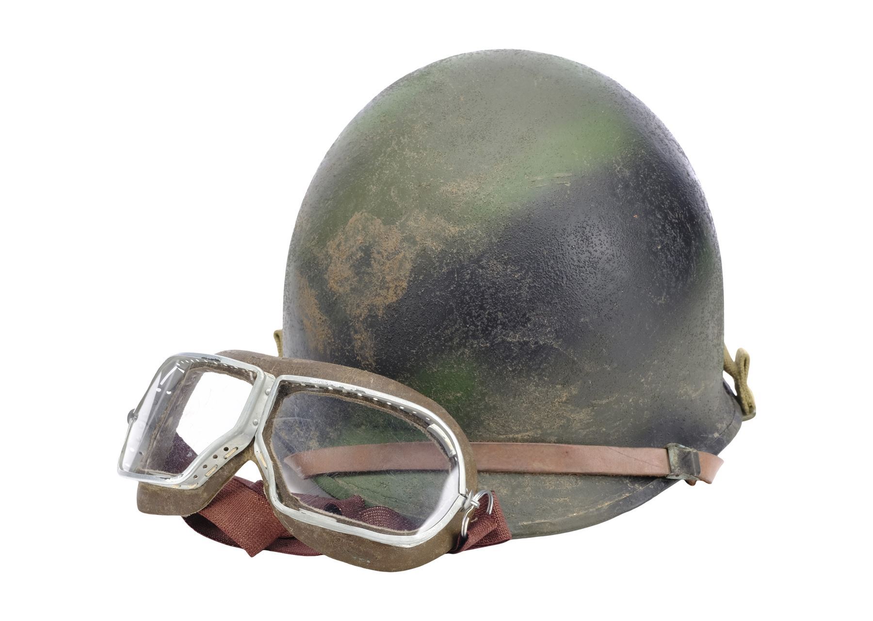 This black and green metal M1 helmet features a brown plastic insert, nylon, elastic, and leather straps, and a pair of metal frame goggles with clear acrylic lens, a suede and brown leather trim, and a brown elastic strap. This lot exhibits intentional distressing from production, and scuffs and worn elastic on the goggles and helmet.