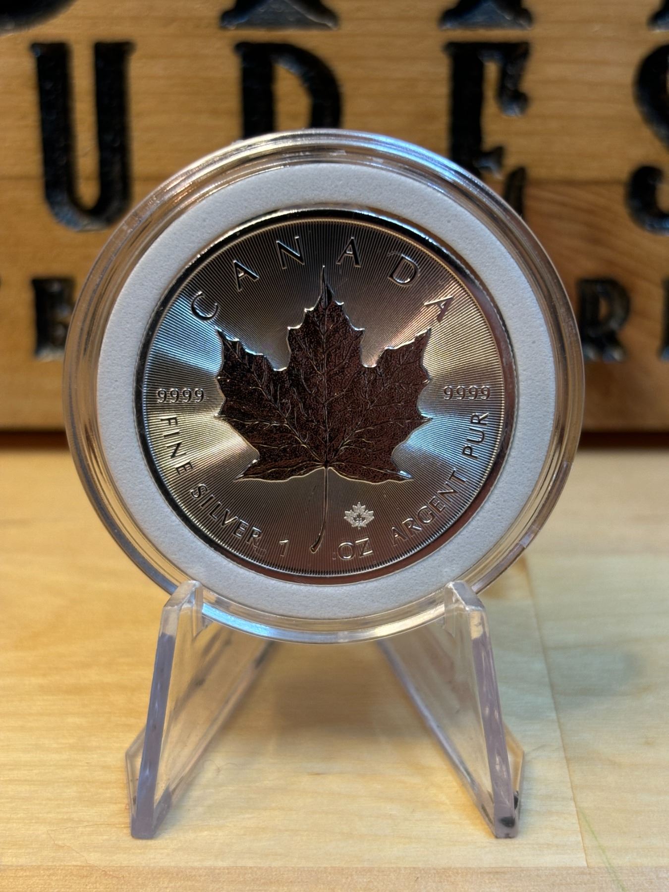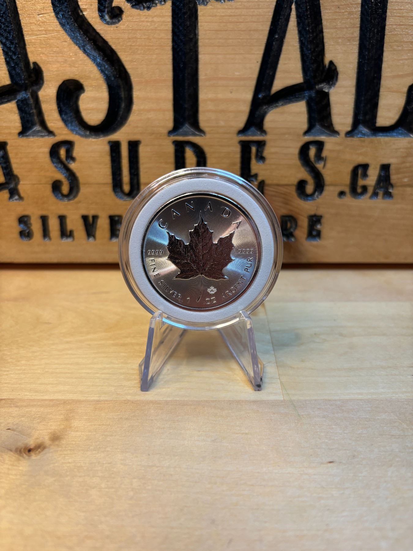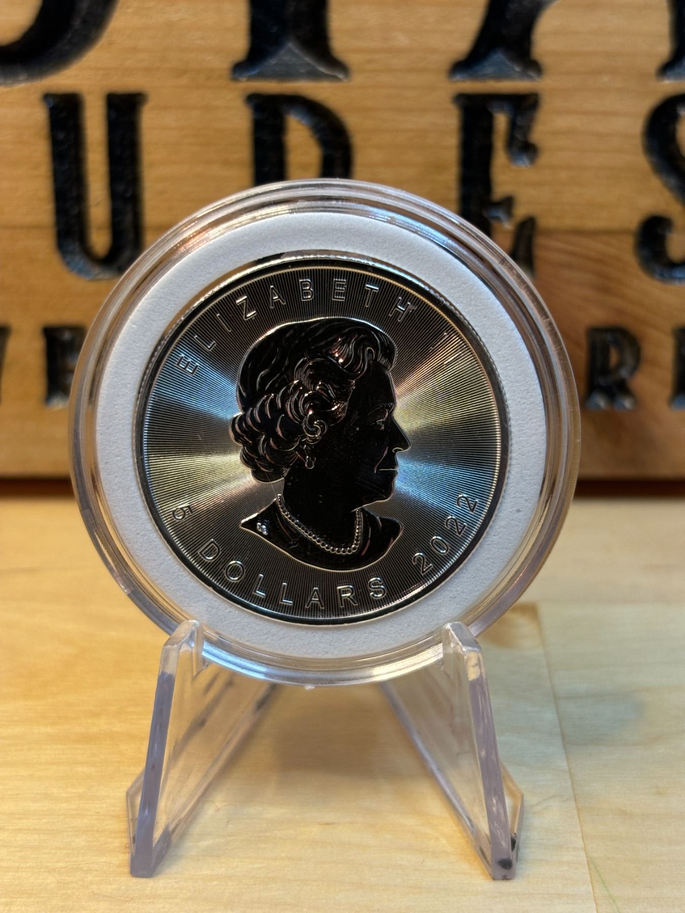 The 2022 1 oz Canadian Silver Maple Leaf is a .9999 fine silver coin minted by the Royal Canadian Mint. It features the iconic maple leaf on the reverse, with enhanced security features such as micro-engraved radial lines. The obverse showcases the new effigy of King Charles III, following the passing of Queen Elizabeth II, along with a face value of 5 Canadian dollars. Known for its high purity and craftsmanship, this coin is a favorite among collectors and investors.
