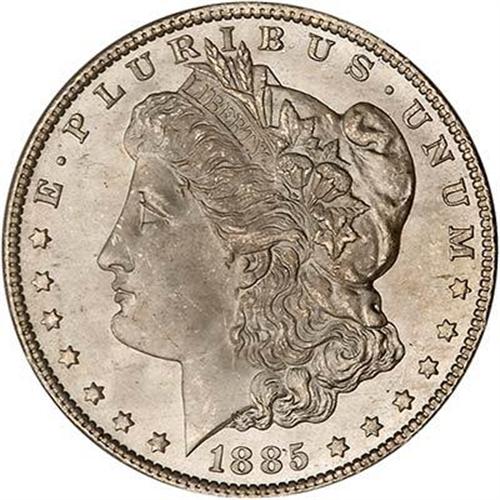 1885-CC Morgan Dollar. Virtually ice-white fields spread light in every direction makes this an eye-poppingly beautiful specimen. The CC-mint years of the early 1880s, but especially the scarce, low mintage 1885-CC, tend to have extremely vibrant, heavy white frost covering the fields and devices. (#7160)