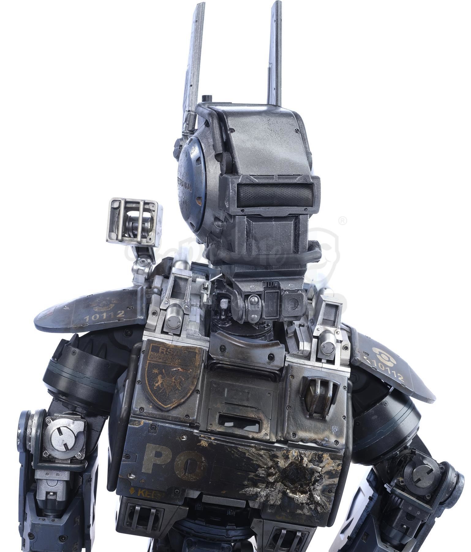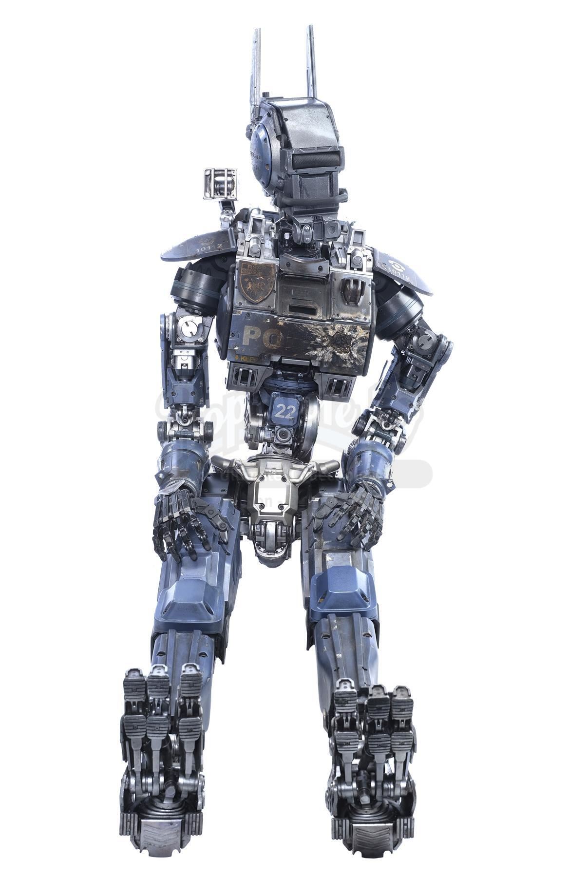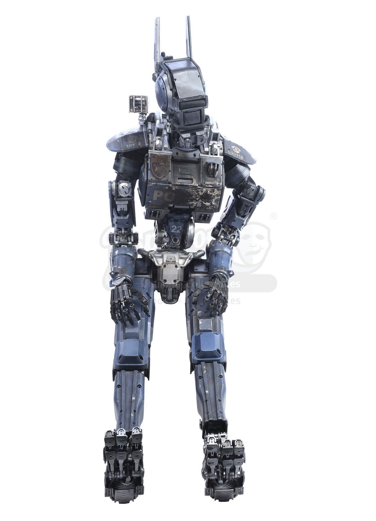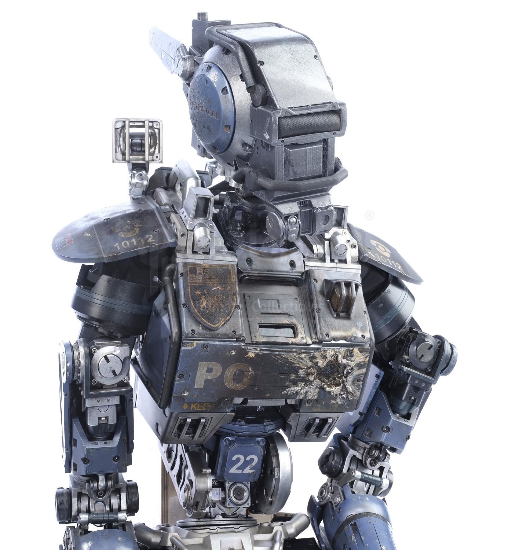 A full-size "CHAPPiE" title character robot with replica head from Neill Blomkamp's dystopian sci-fi film Chappie. Damaged, human-like law enforcement robot CHAPPiE (Sharlto Copley) fell into the hands of a group of gangsters. The film featured a number of Tetravaal police scout robots and title character CHAPPiE had the unique designation number "22".