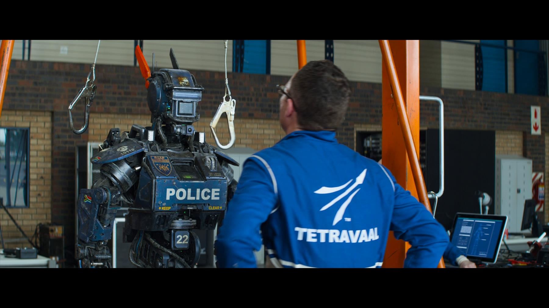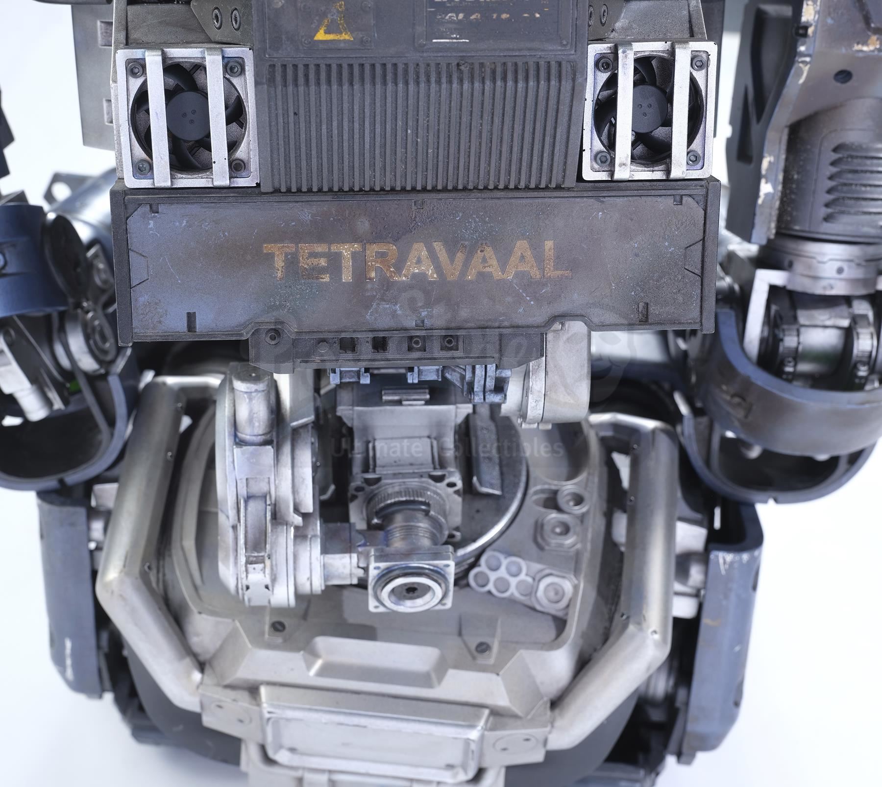 Original CHAPPiE parts on the robot include the cheek plates; neck tube connectors; back plate; shoulder pads and drums; the left arm upper actuator; left arm shrouds; left hand; blast-damaged chest plates labeled "POLICE"; an upper abdomen piece labeled "22"; a Tetravaal-branded back plate; hip covers; both leg shrouds; and the rear end pieces. The remaining elements are from a background robot created for the assembly lines seen in the film, with the exception of the head, which is a 3D-printed replica added to complete CHAPPiE (with the exception of aforementioned cheek plates and neck tube connectors.)