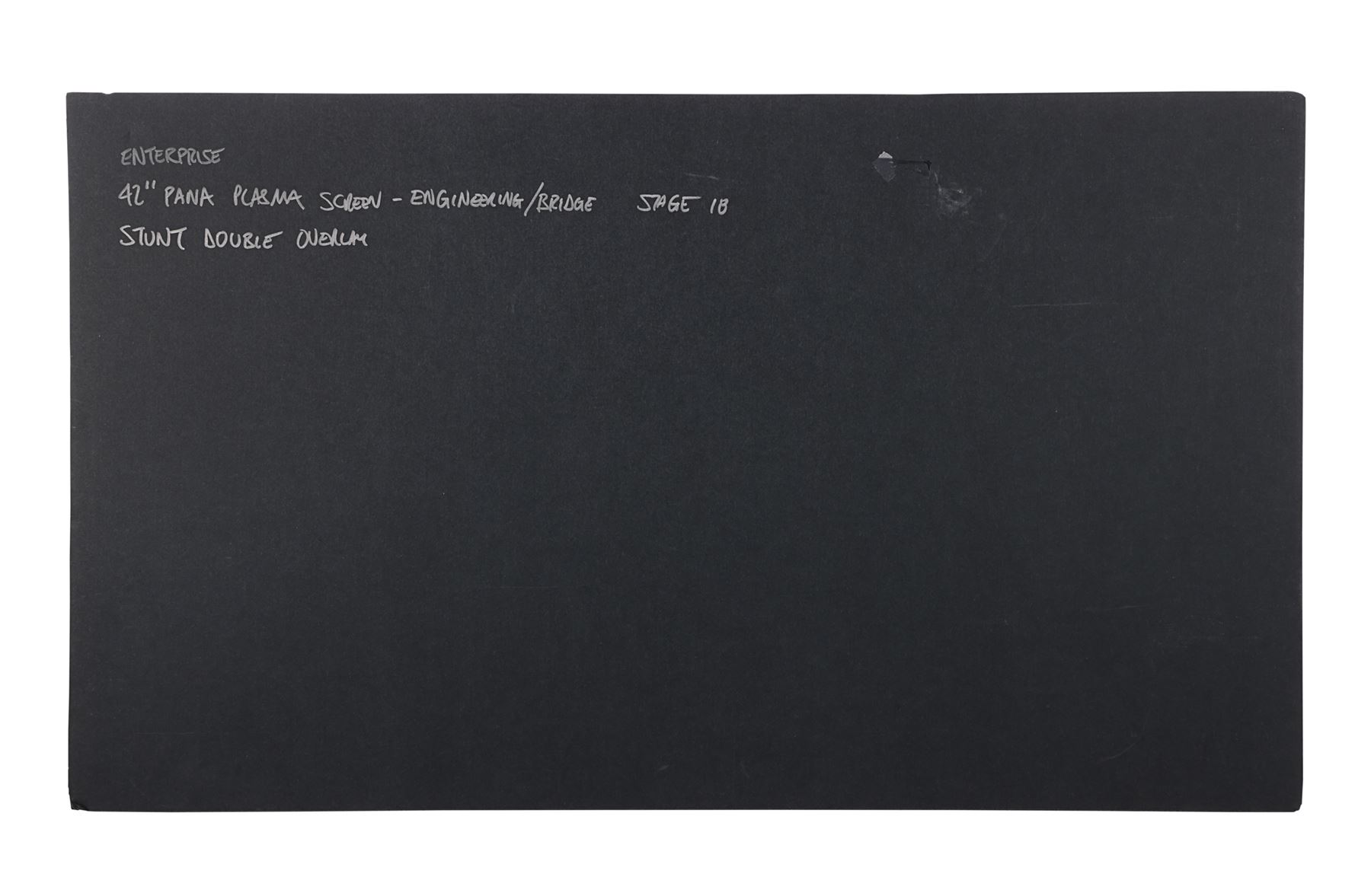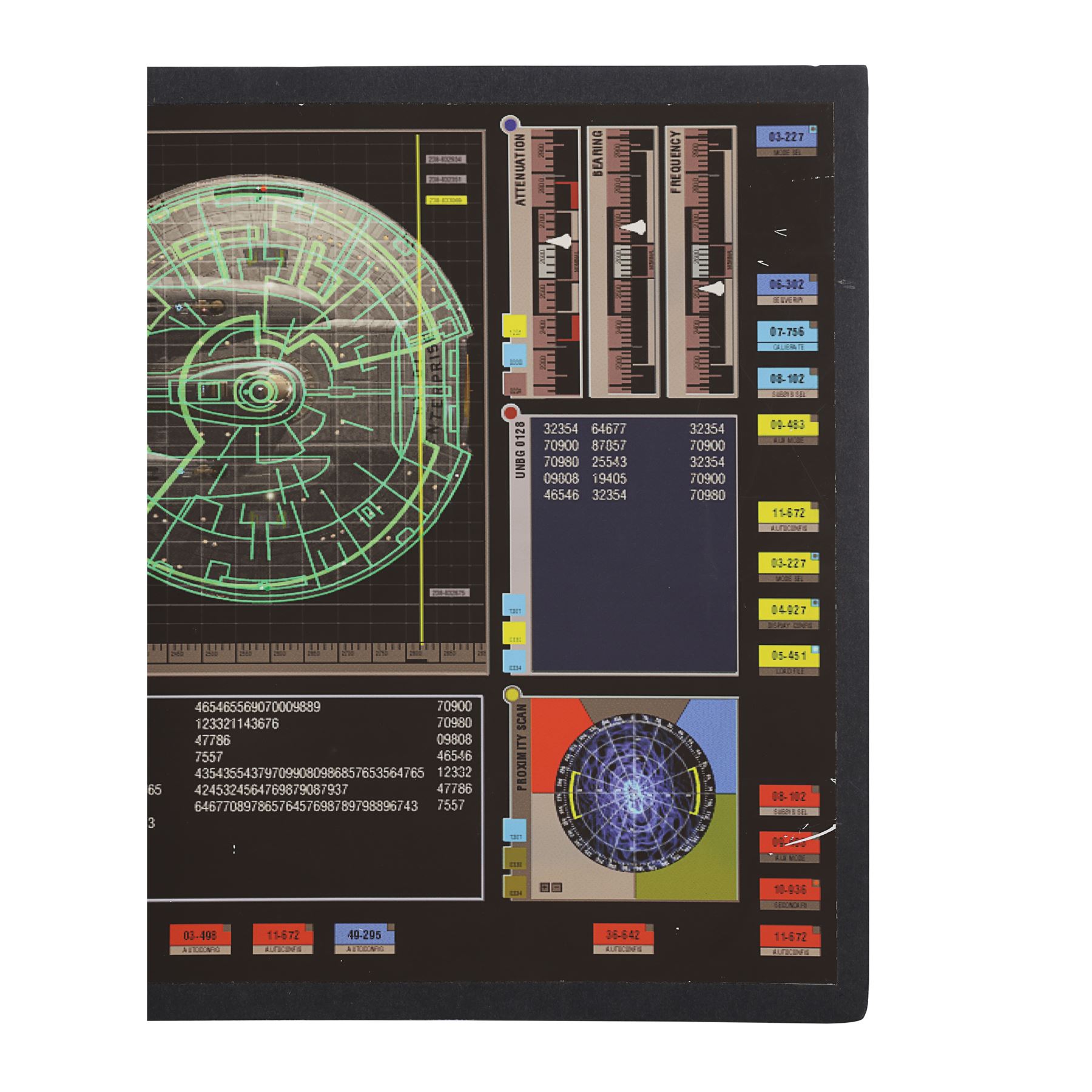 This lot consists of a printed display featuring number readouts, multicolour simulated buttons, and a large image of the Enterprise with a green structural overlay. The print is adhered to black foam board with silver-colour handwriting on the back reading "Enterprise 42" Pana Plasma Screen - Engineering / Bridge Stage 18 Stunt Double Overlay." It exhibits some scuffing in the foam board and the print itself. Dimensions: 56 cm x 94 cm x 0.75 cm (22" x 37" x 1/4")