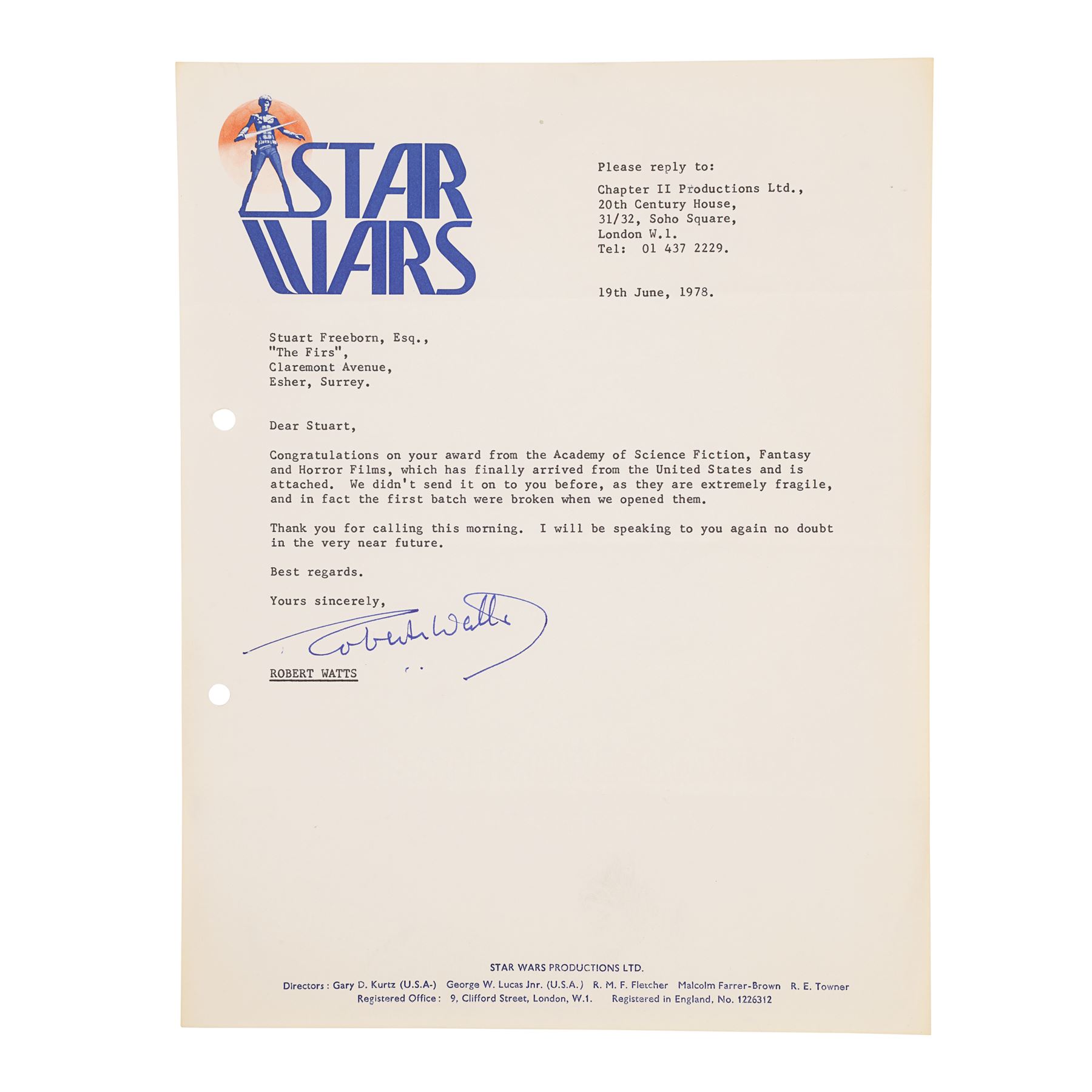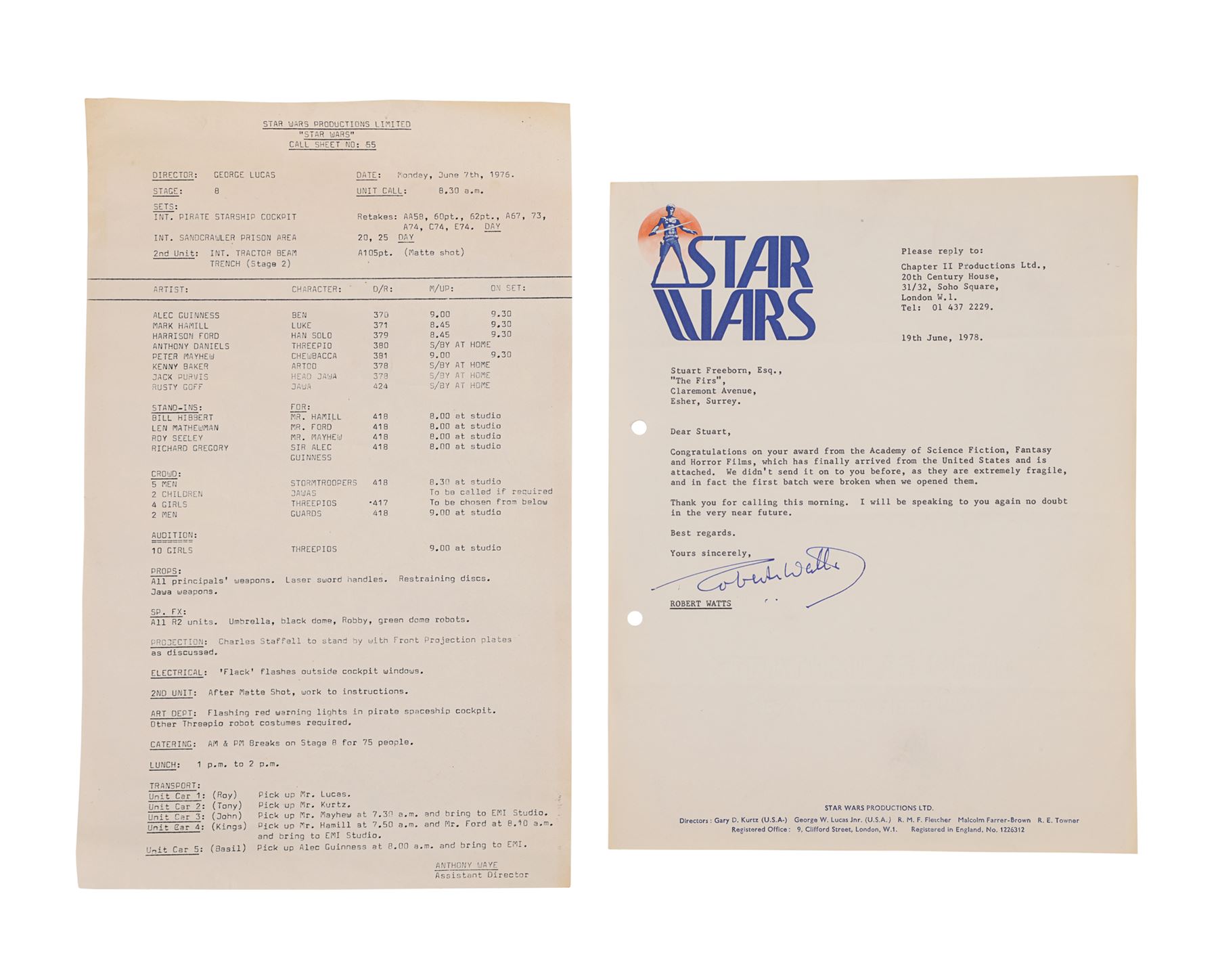 A call sheet and letter from the production of George Lucas' Star Wars: A New Hope (1977). Dated "Monday 7th June 1976", the call sheet sets out the shooting and makeup schedule for several prominent cast members, including Alec Guinness (Obi-Wan Kenobi), Mark Hamill (Luke Skywalker), Harrison Ford (Han Solo), Anthony Daniels (C-3PO), Kenny Baker (R2-D2) and Peter Mayhew (Chewbacca). The sets listed for filming are "Pirate Starship Cockpit", "Sandcrawler Prison Area" and "Tractor Beam Trench". Also included in the lot is a letter from production supervisor Robert Watts. It is addressed to creature design and makeup supervisor Stuart Freeborn, presenting him with his award from the Academy of Science Fiction, Fantasy and Horror Films. Watts has signed the letter in blue ink. Call Sheet Dimensions: 33 cm x 22 cm (13" x 8 1/2")