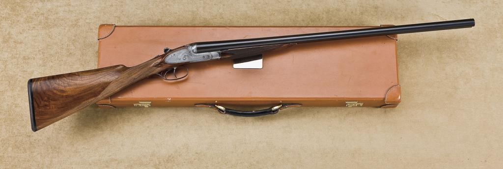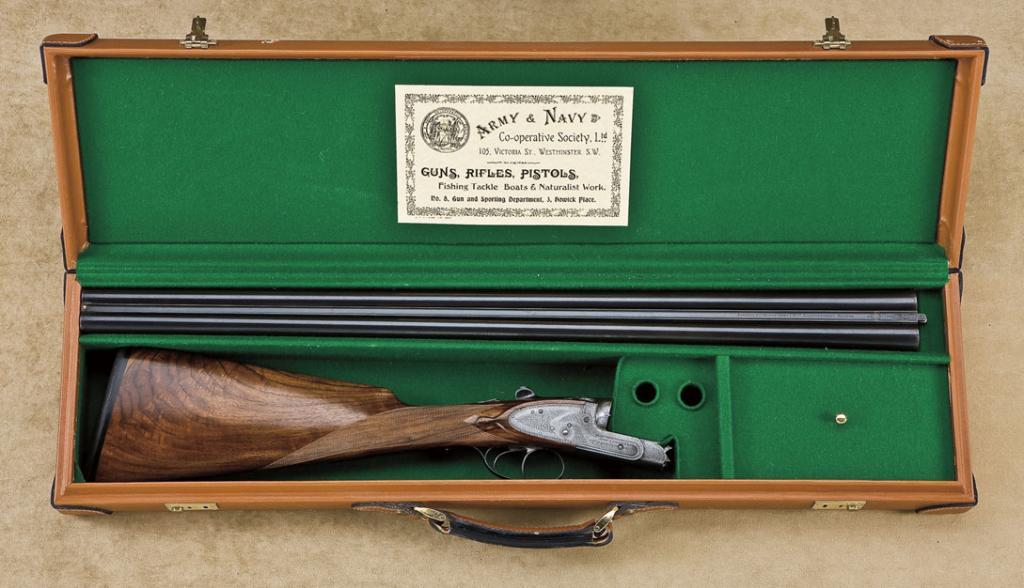 Lot 159 (9HP-19) Full English sidelock double-barrel side by side 12ga shotgun marked “Army & Navy C.S.L.” (Cooperative Society Limited) in English leather trunk-type carrying case, serial number “49609”. The gun shows 28” barrels which are engraved on top rib “Barrels by George Gibbs, Ltd. 37 Baldwin St, Bristol”. The gun shows automatic ejectors, standard double triggers, English style straight stock, with thin English style hard rubber pad. The actions are nicely scroll engraved in typical English motifs. The barrels show approx. 85-95% old original blue finish which is starting to age and tone, some light erosion and minor losses of finish at edges. The frame has been lightly cleaned to grey, with faint traces of case hardening where protected and still very sharp with no serious polishing or buffing, and now drifting to a natural patina. The gun has been professionally restocked, and the trigger guard shows a modern reblue. The action is tight and the gun is mechanically sound with very good and still bright bores. The stock measures approx. 14-1/4” to the end of the wood, approx. 14-3/4” to the end of the pad. The gun shows nitro proofs for 2-1/2” chambers (now opened to 2-3/4”) and marked for 1-1/8oz of shot. The case is of a more modern period but is well made and of high quality with a simulated maker’s label. The Army & Navy stores of London were dealers who merchanted fine English guns primarily to the British military service members. Est.: $3,500-$7,000.