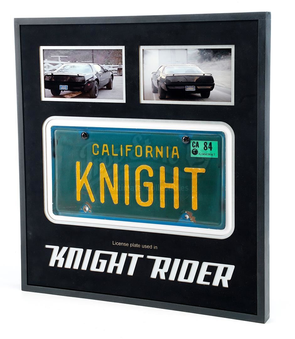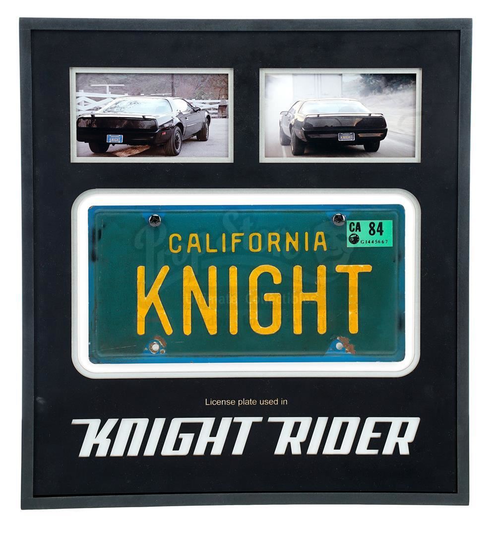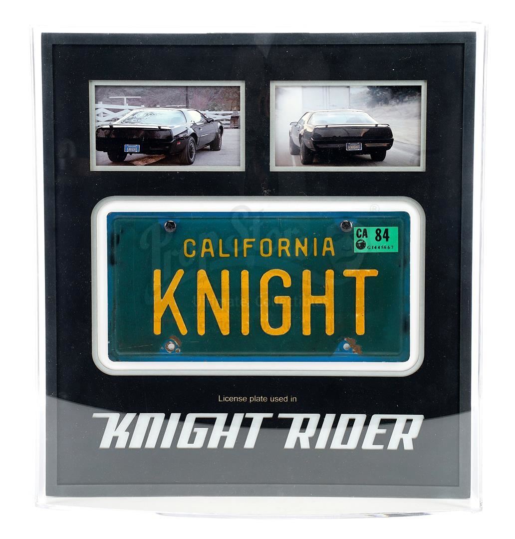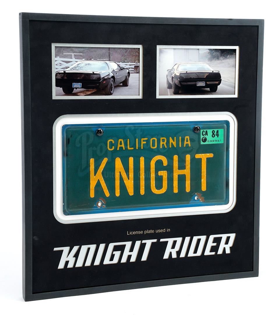This lot will be auctioned on Tuesday, June 29th. The auction will begin at 9:00am PDT and lots are sold sequentially via live auctioneer; tune in to the live streaming broadcast on auction day to follow the pace. Note other lots in the auction may close on June 30th or July 1st. A framed KITT license plate from Glen A. Larson's classic action television series Knight Rider. Michael Knight's (David Hasselhoff) heavily modified Pontiac Firebird Trans Am - known as KITT, or Knight Industries Two Thousand - was affixed with its signature "KNIGHT" license plate throughout the series. This plastic, State of California license plate reads "KNIGHT" and features a green "CA 84" sticker and two metal screws securing it to a laser-cut mount bound engraved with the show's title and affixed with two stills of KITT. The plate and board are mounted inside a custom-built wood case with an acrylic cover for stabilization. Due to age and exposure, the plate's iconic blue sheen has faded to dark green, but the goldenrod text retains its original coloration. The lot remains in otherwise good overall condition with some rust stains on the plate's bottom screw holes. Dimensions (framed): 18.75" x 17.5" x 3.5" (47.75 cm x 44.5 cm x 9 cm) Estimate: $6,000 - 8,000