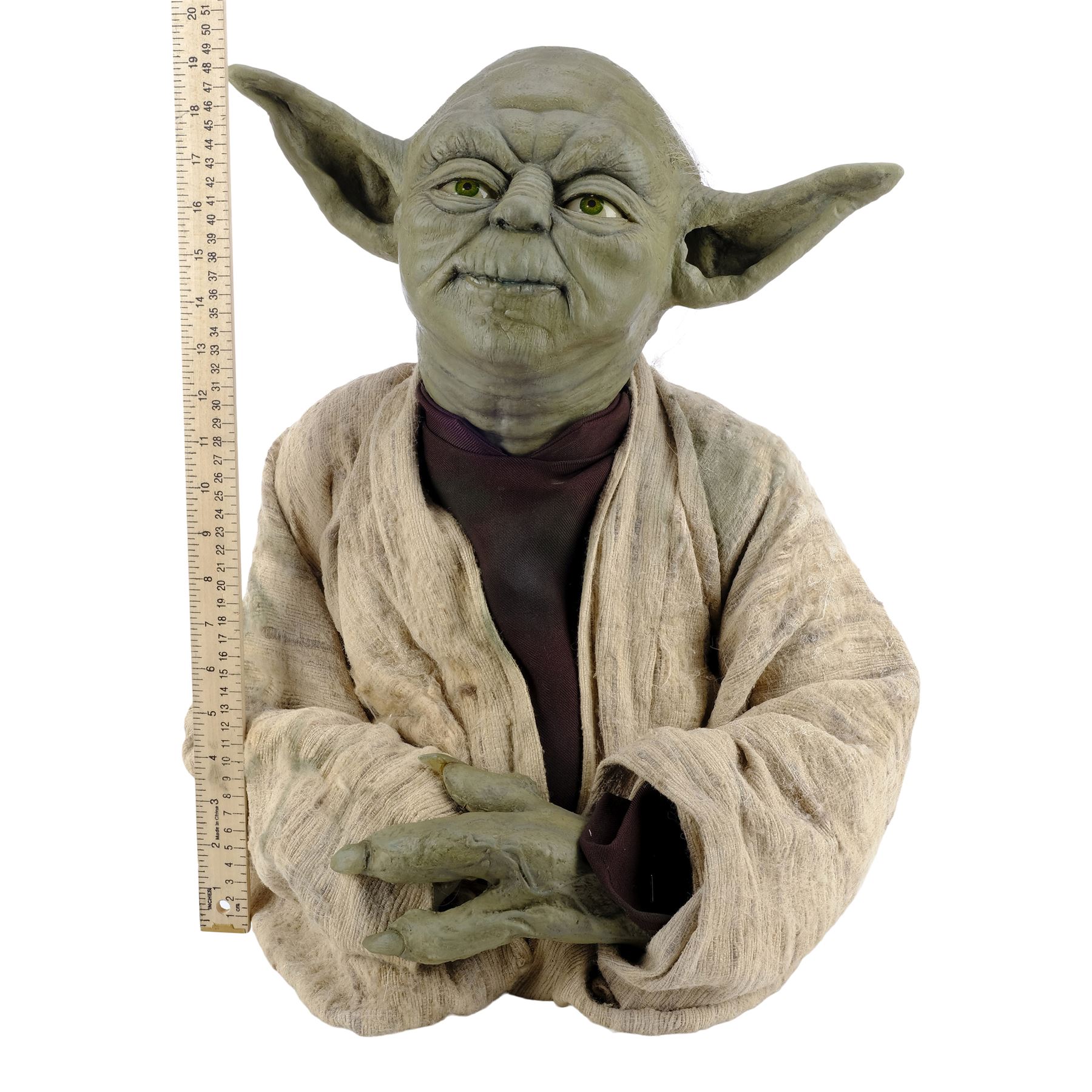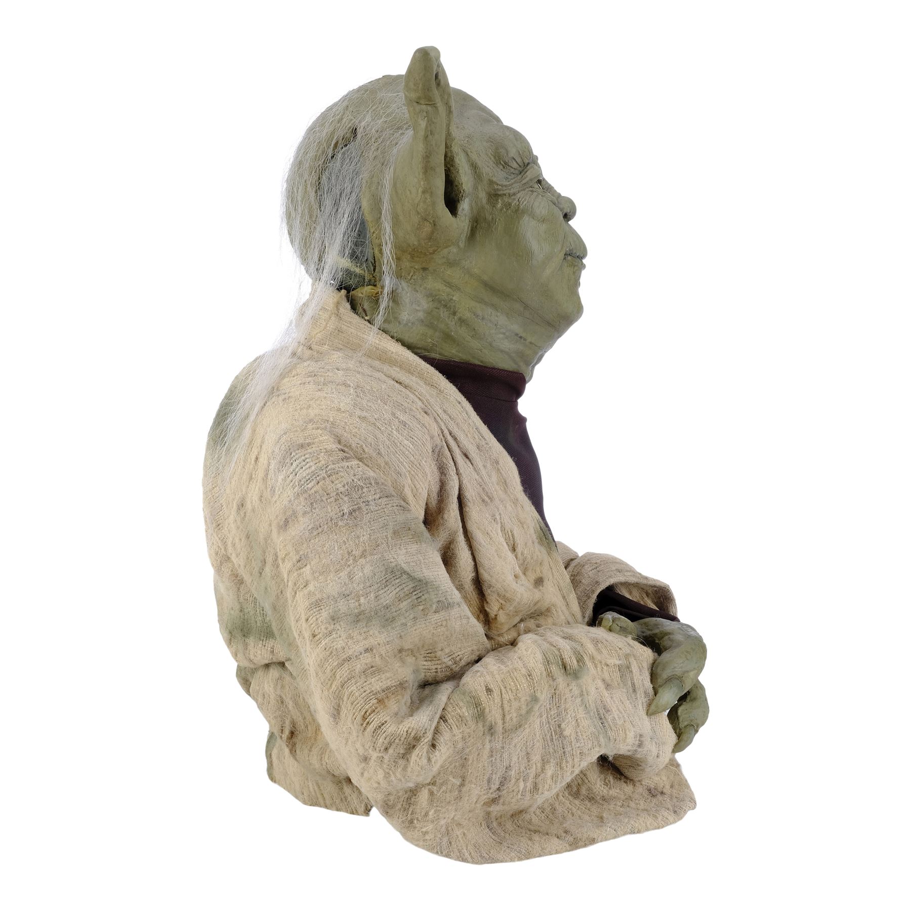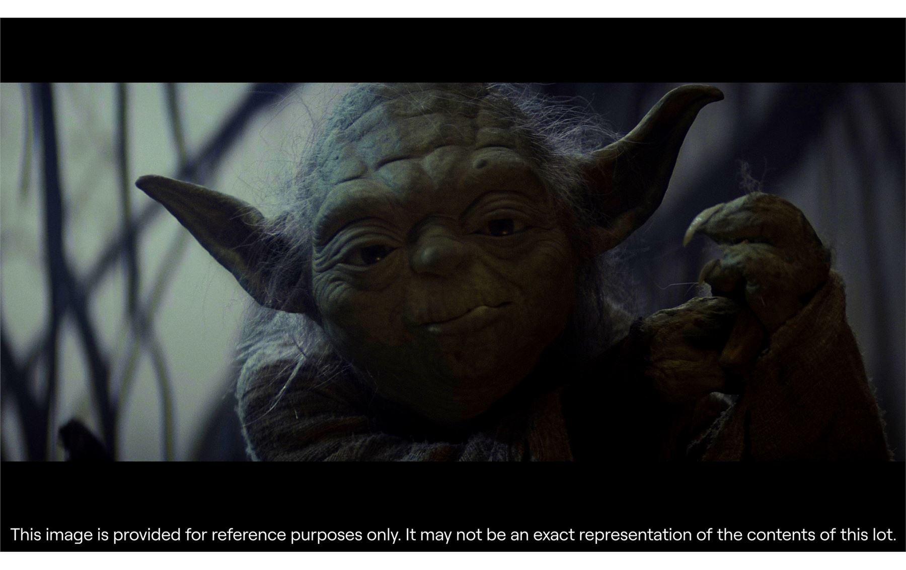 A Yoda (Frank Oz) replica figure with original Stuart Freeborn-made face skin from the second and third instalments of Geroge Lucas's Star Wars trilogy, The Empire Strikes Back and Return of the Jedi. Luke Skywalker (Mark Hamill) trained with Jedi Master Yoda on Dagobah until Yoda's death.