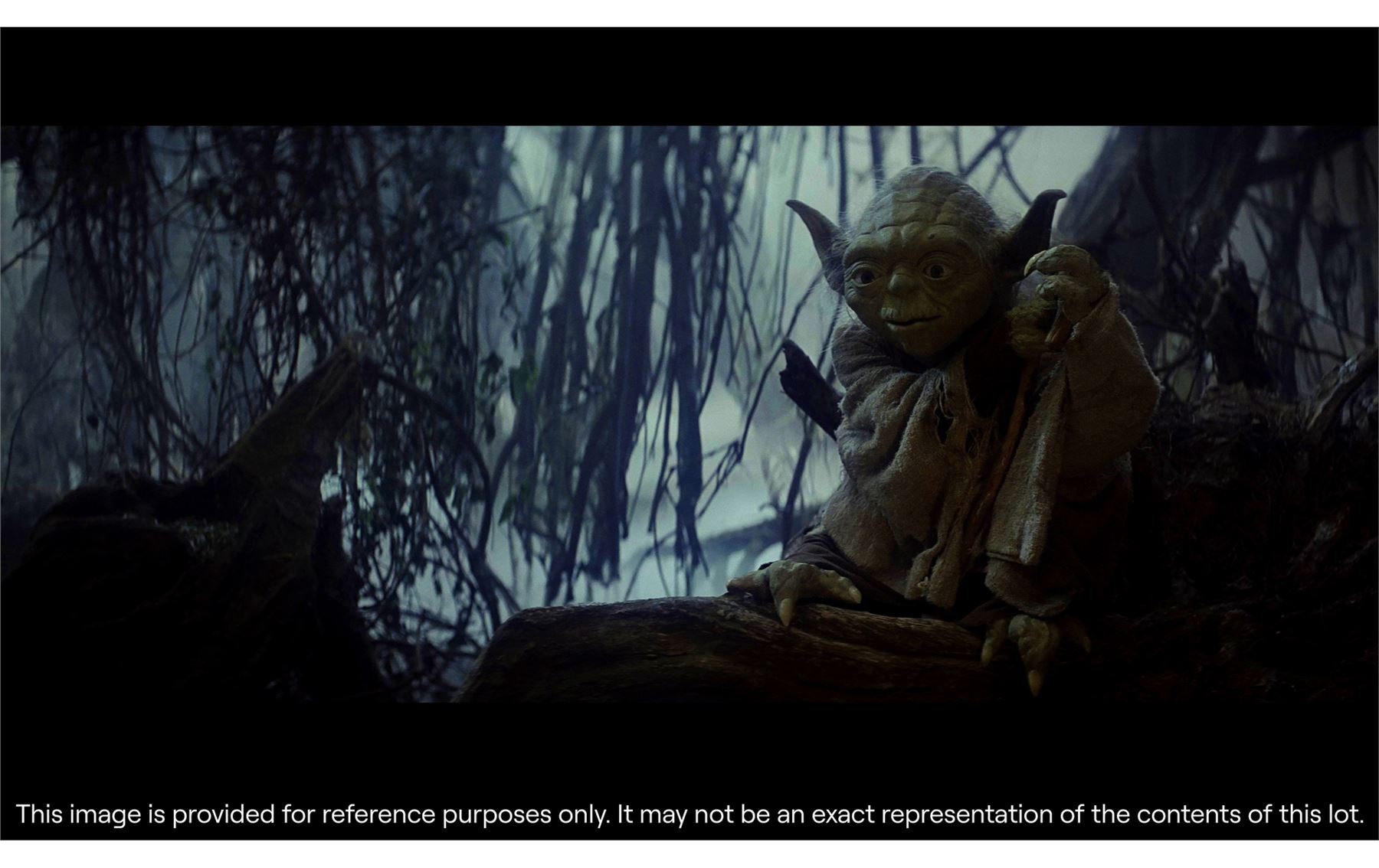 This lot consists of one replica Yoda puppet with an unused original latex face skin. The body and clothing were added to complete the figure, as was the signature green paint to resemble Yoda's skin. The puppet comes with a letter of authentication from Stuart Freeborn. This lot exhibits some cracking and pitting in the foam from age, and loose threads on the clothing. Dimensions: 42 cm x 39.5 cm x 55.25 cm (16.5" x 15.5" x 21.75")